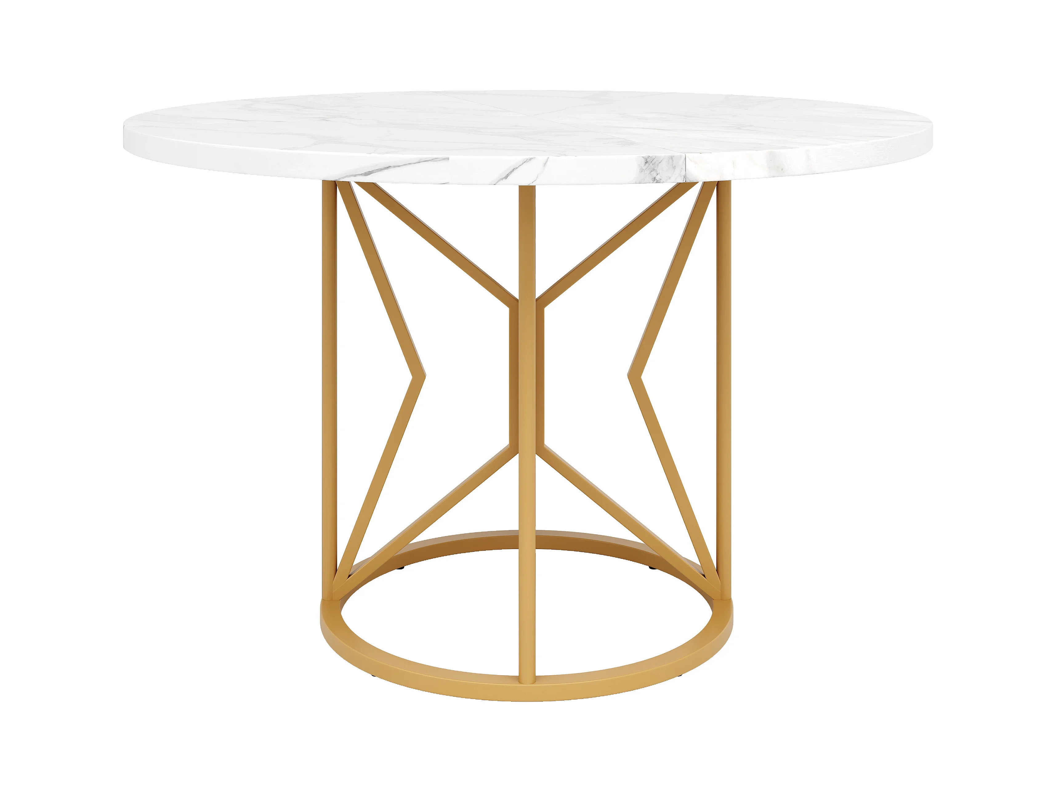 Table à manger ronde - 4 personnes - placage à motif marbre - Cadre en métal - MDF - Blanc & Doré