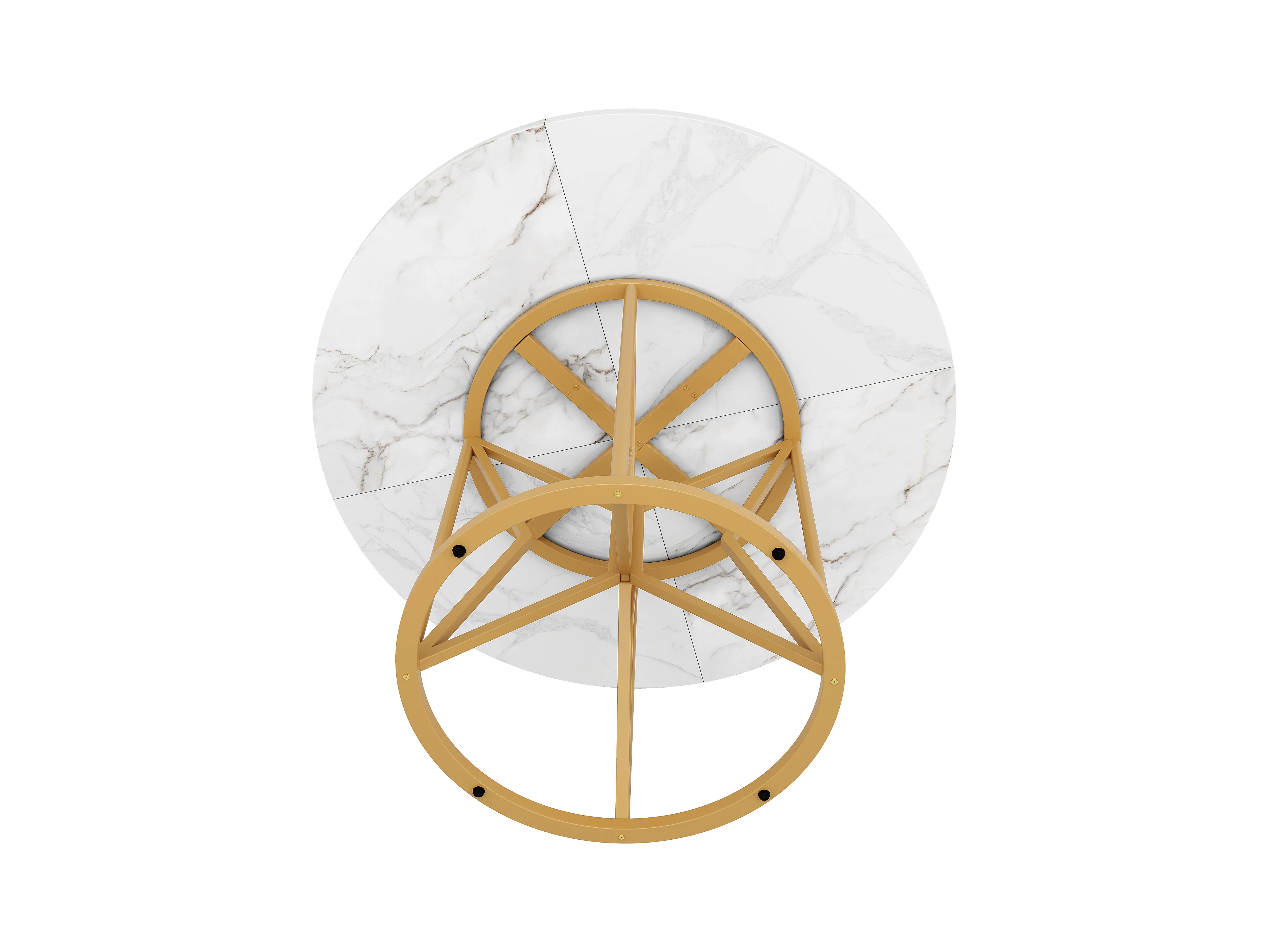 Table à manger ronde moderne (diamètre 1m) - support métallique en forme de X - plateau a motif de marbre - Blanc&Doré