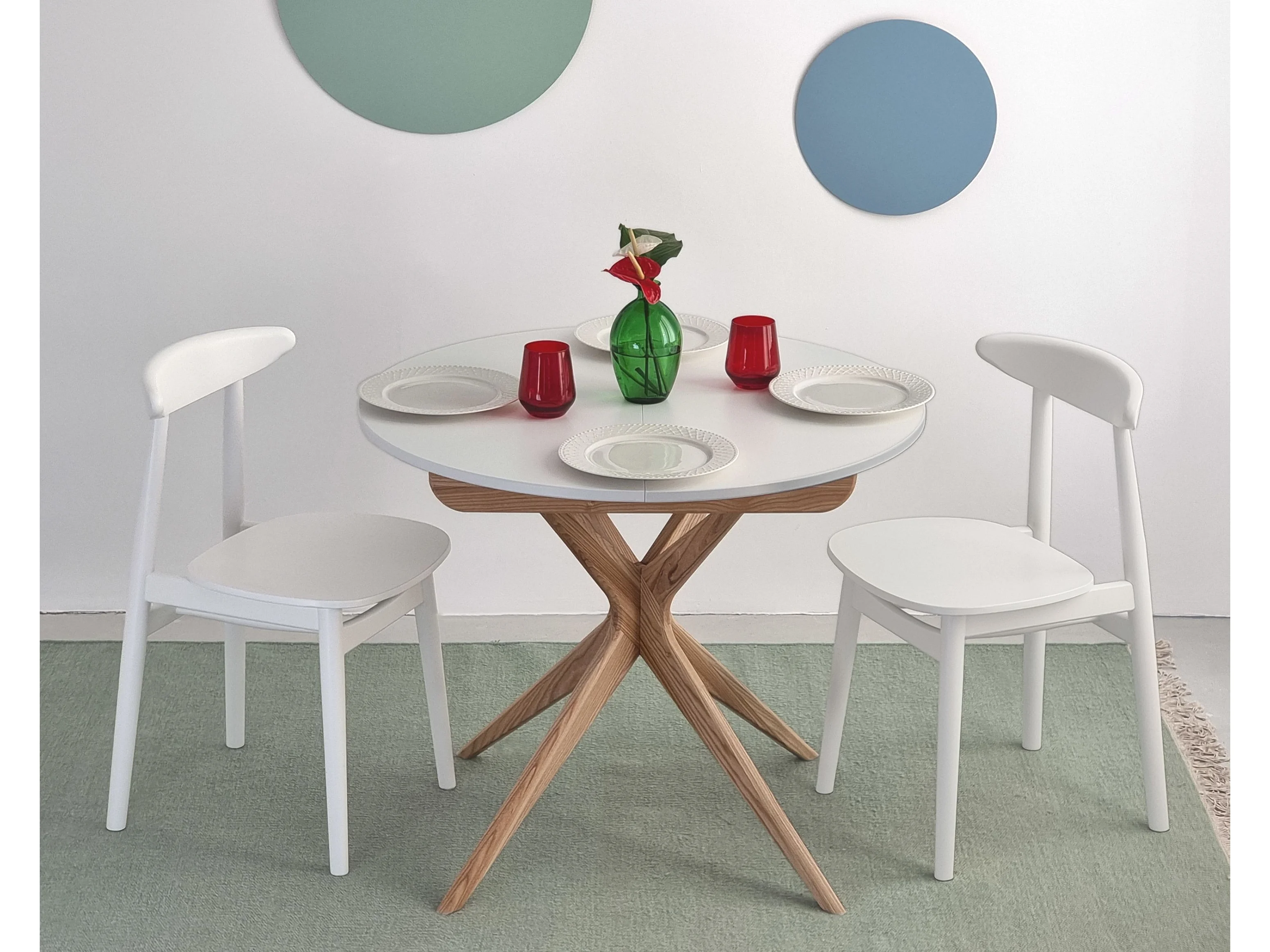 Table à manger ronde extensible 90cm Jubi Blanc | Pied en frêne teinté chêne