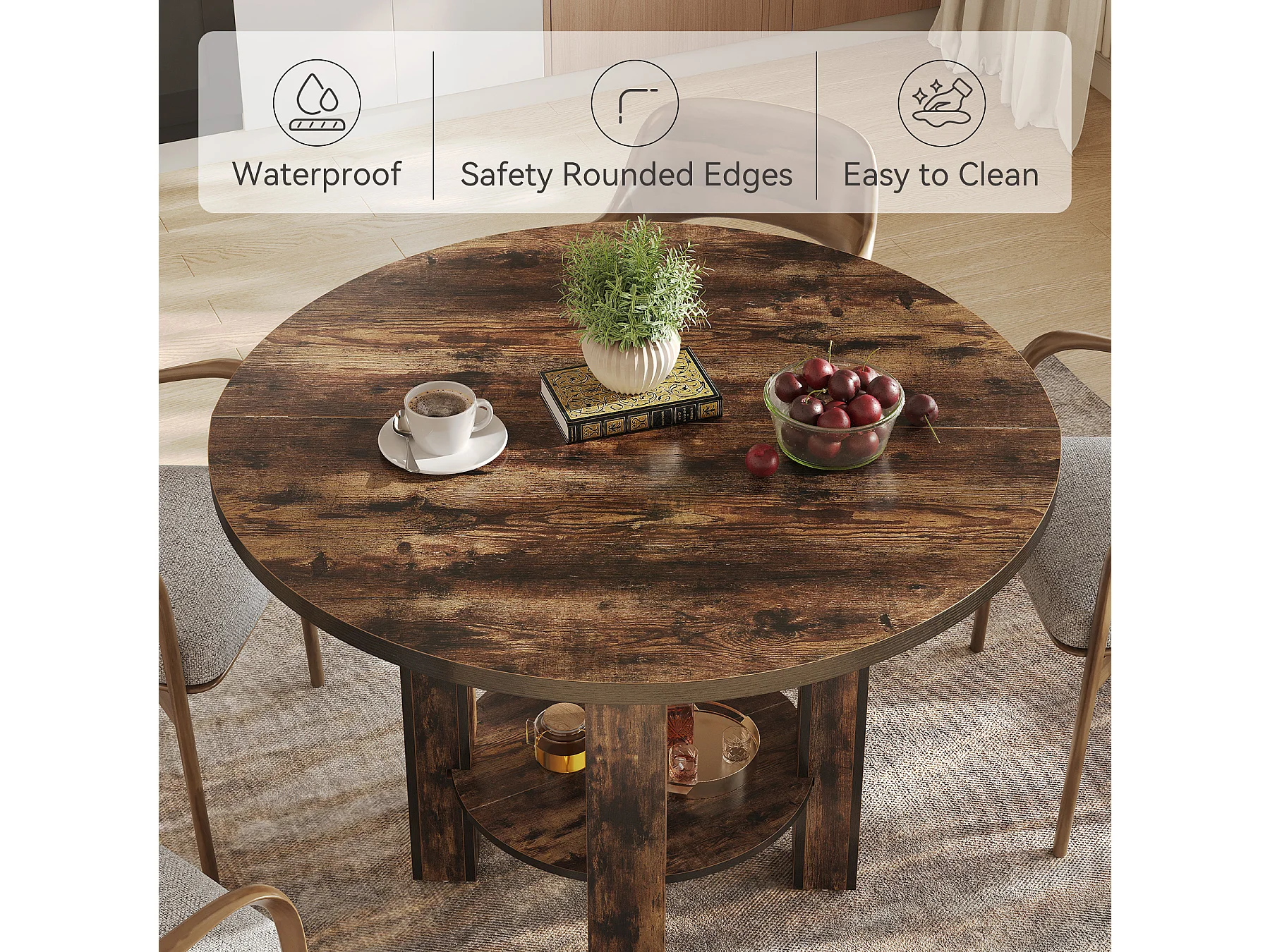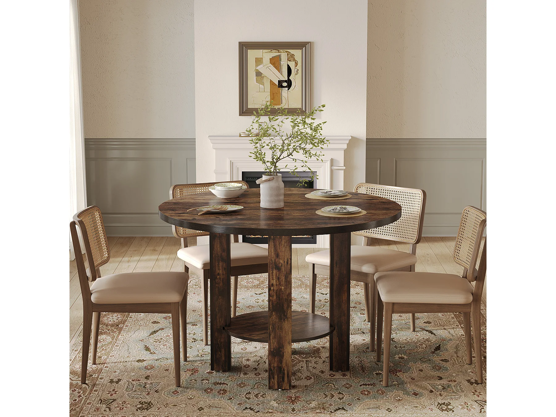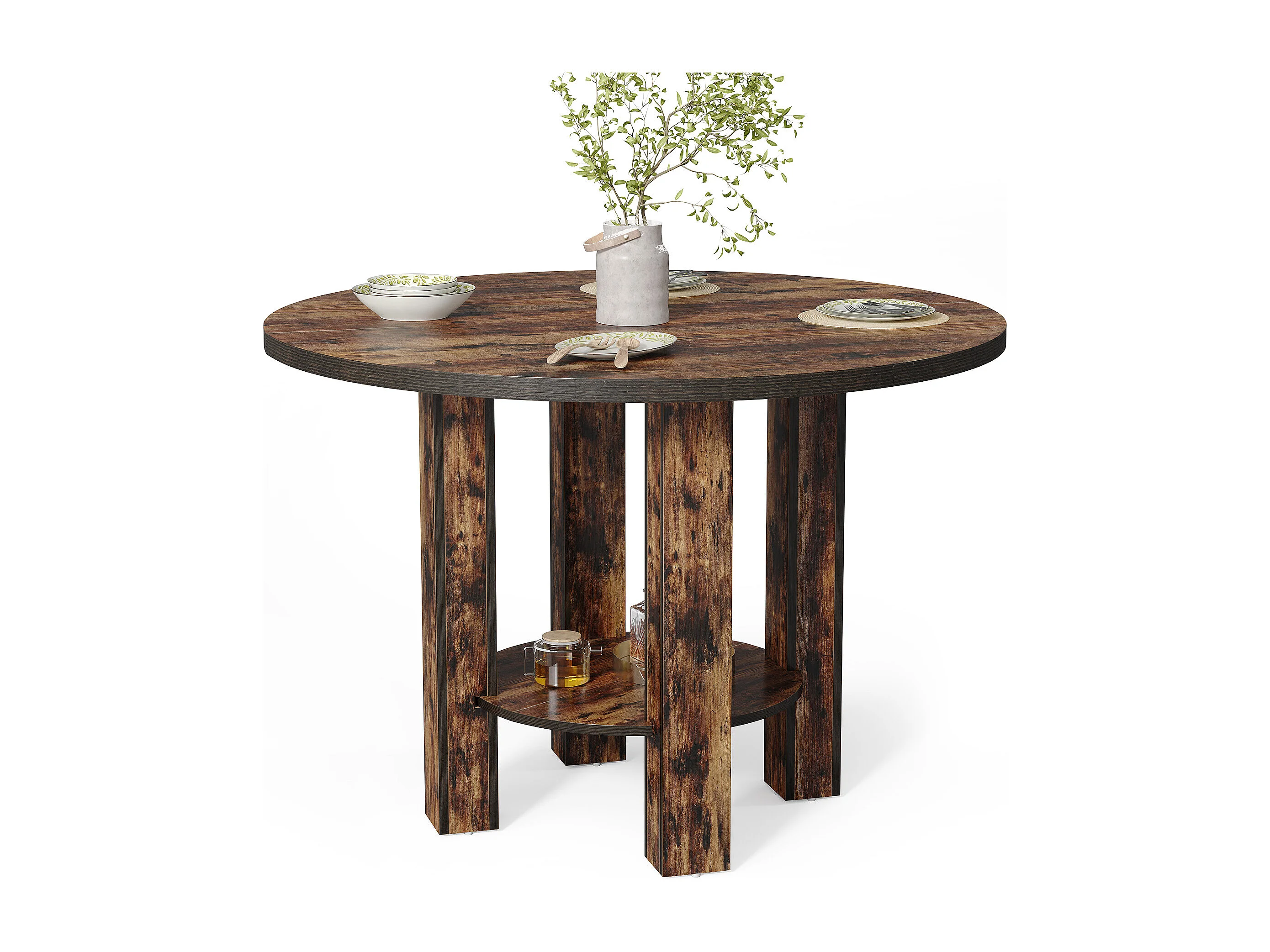 Table de salle à manger ronde pour 4 personnes, table ronde en bois avec étagère de rangement, 2 niveaux
