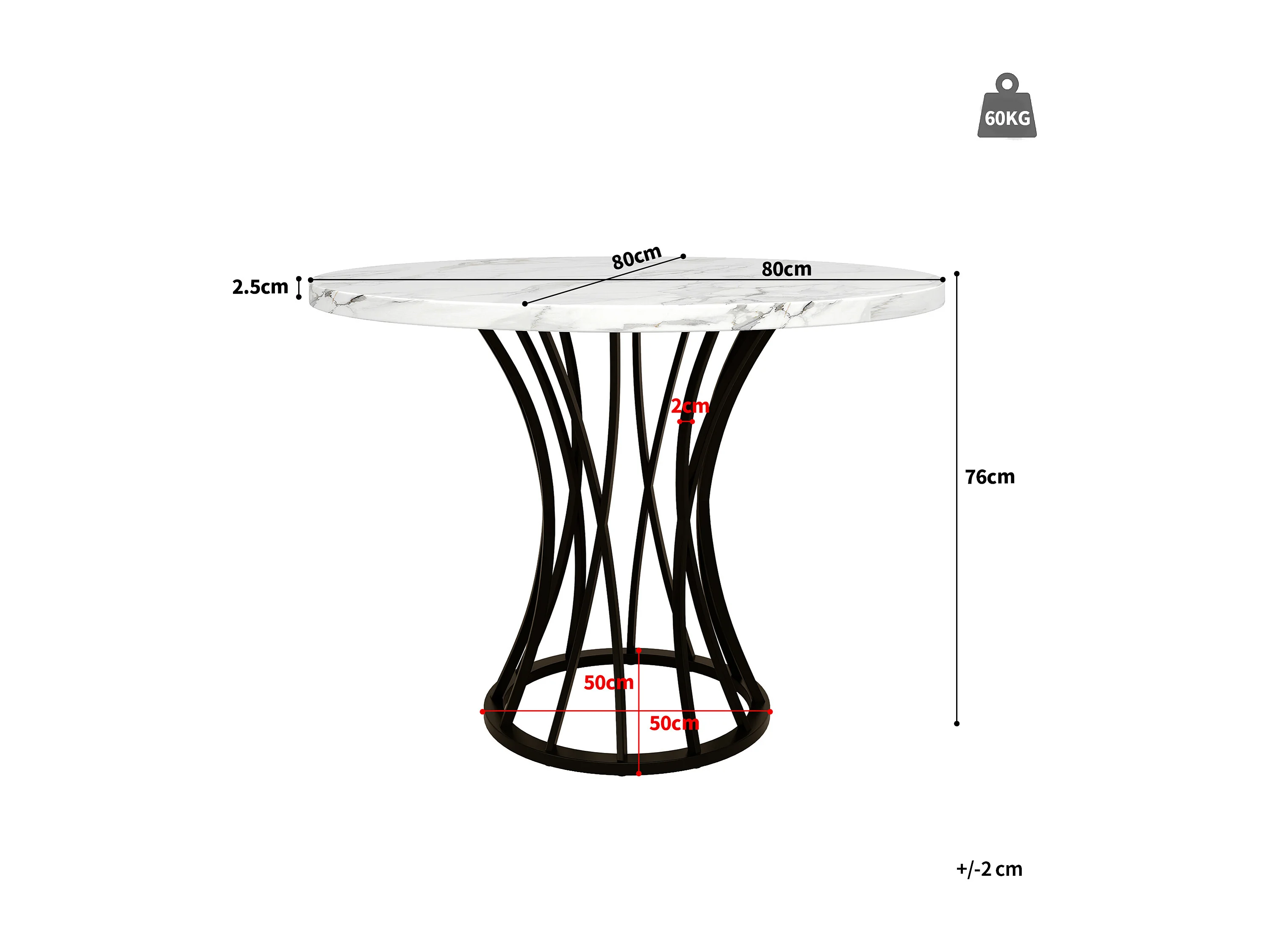 Table à manger 80x80x76 cm, plateau effet marbre, pieds réglables, structure stable, MDF et métal, noir