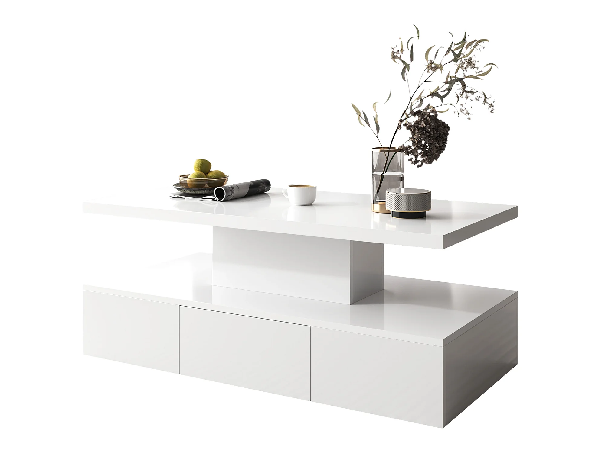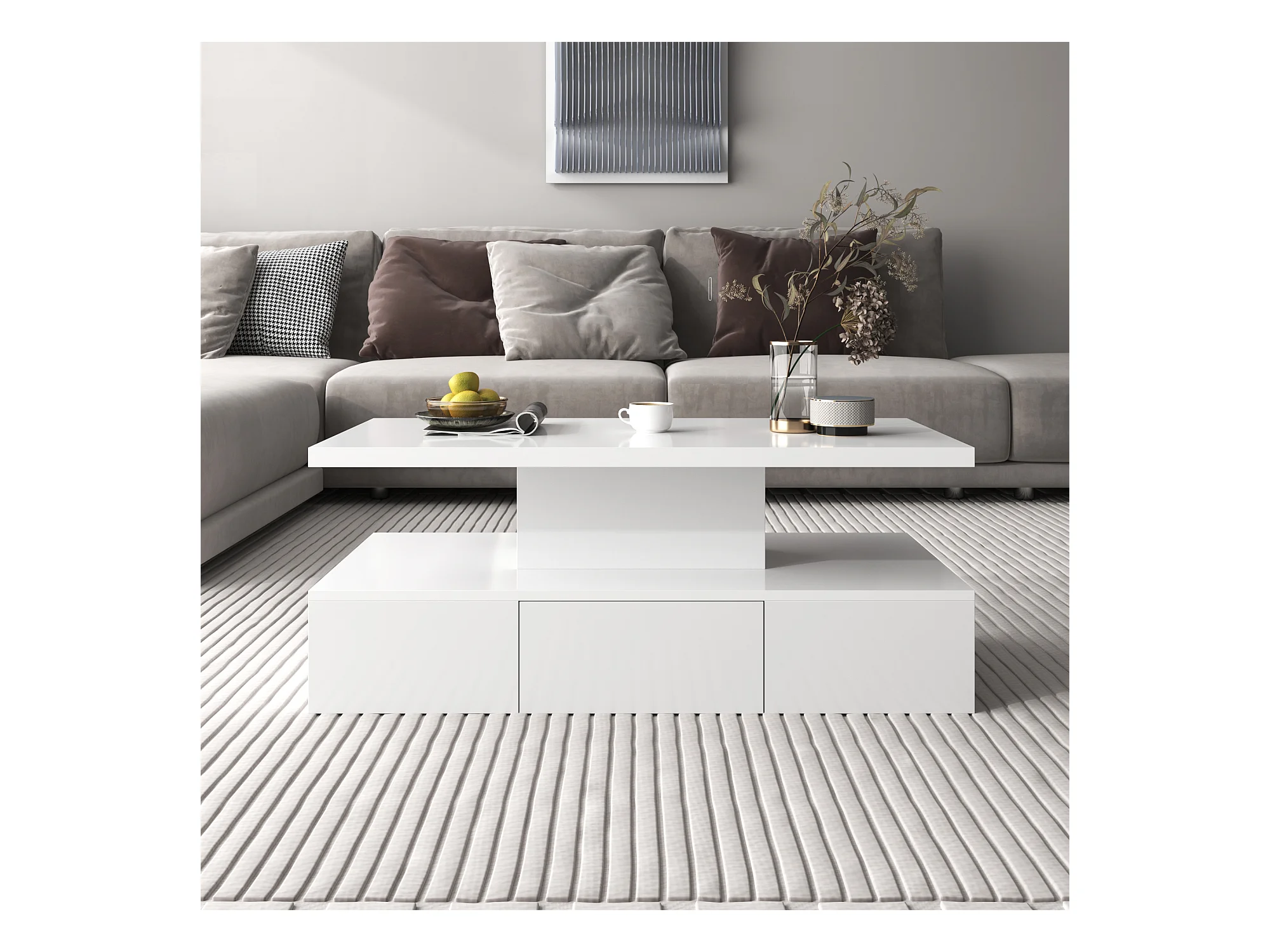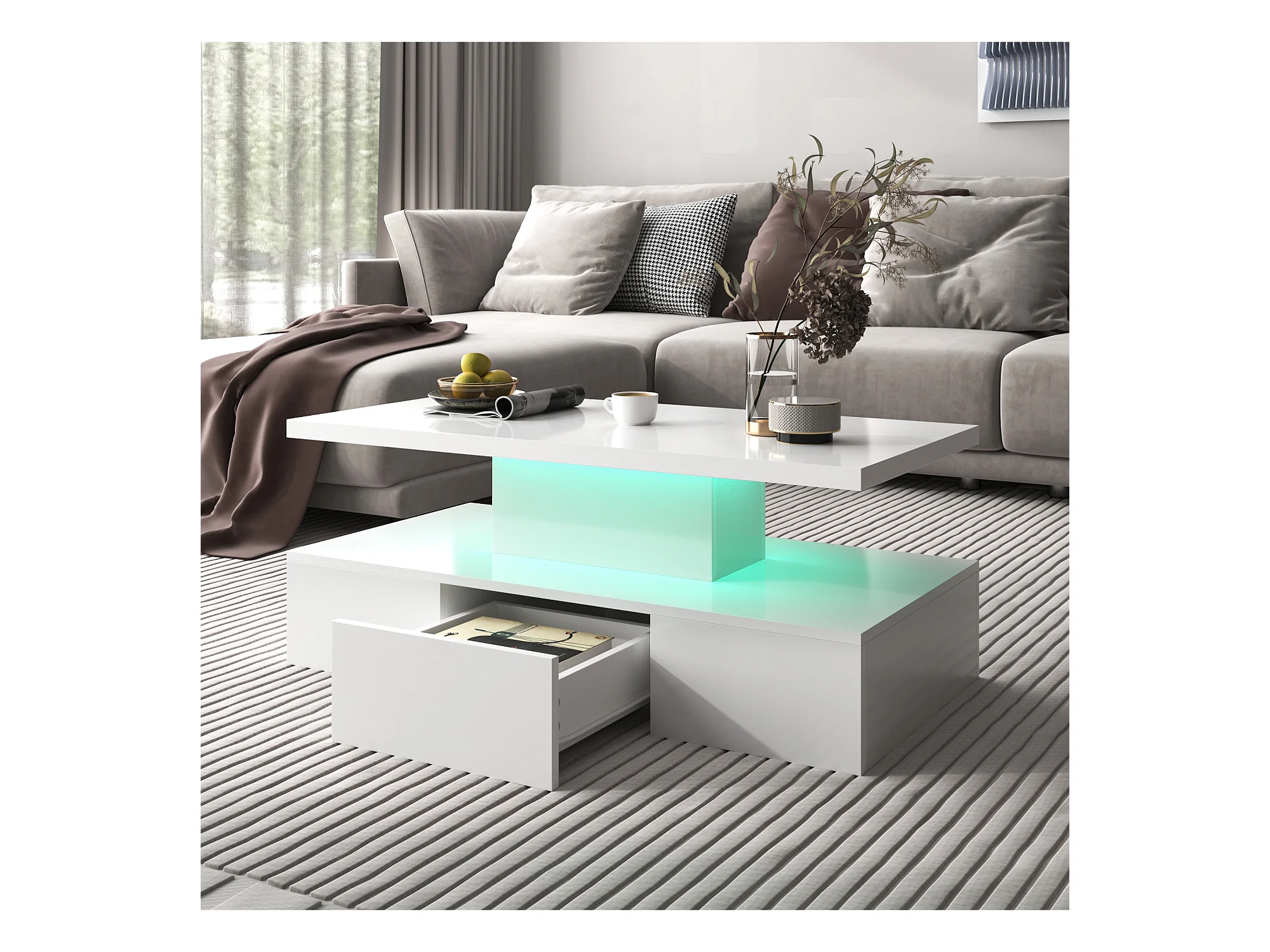 Table basse - 1 tiroir et 2 étagères - panneaux de particules - LEDs - blanc brillant