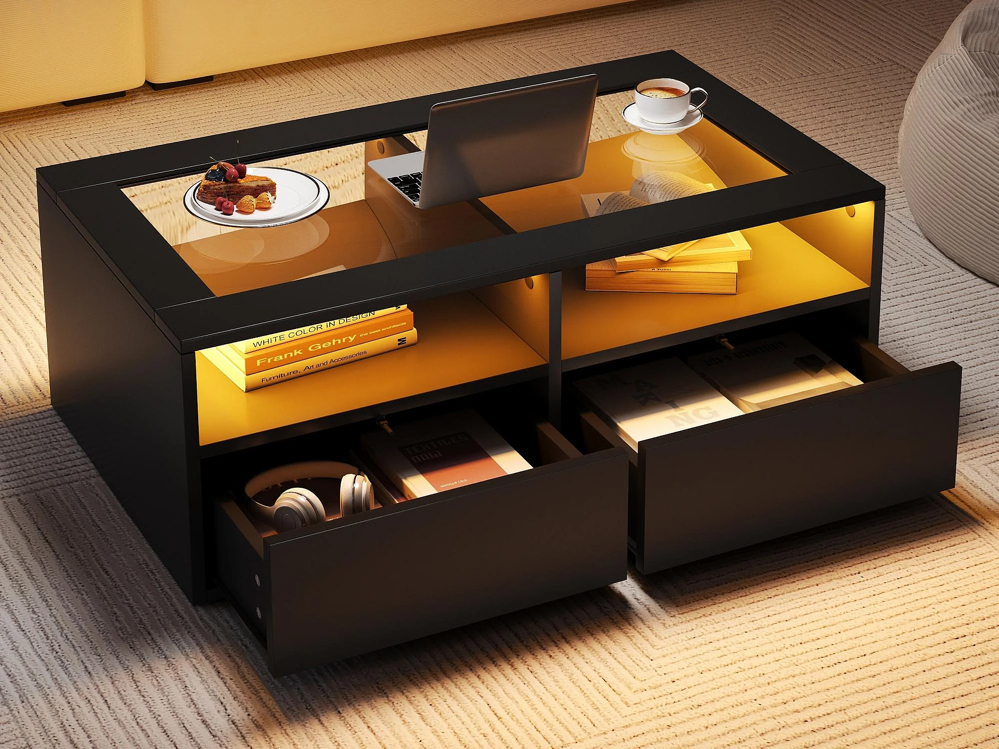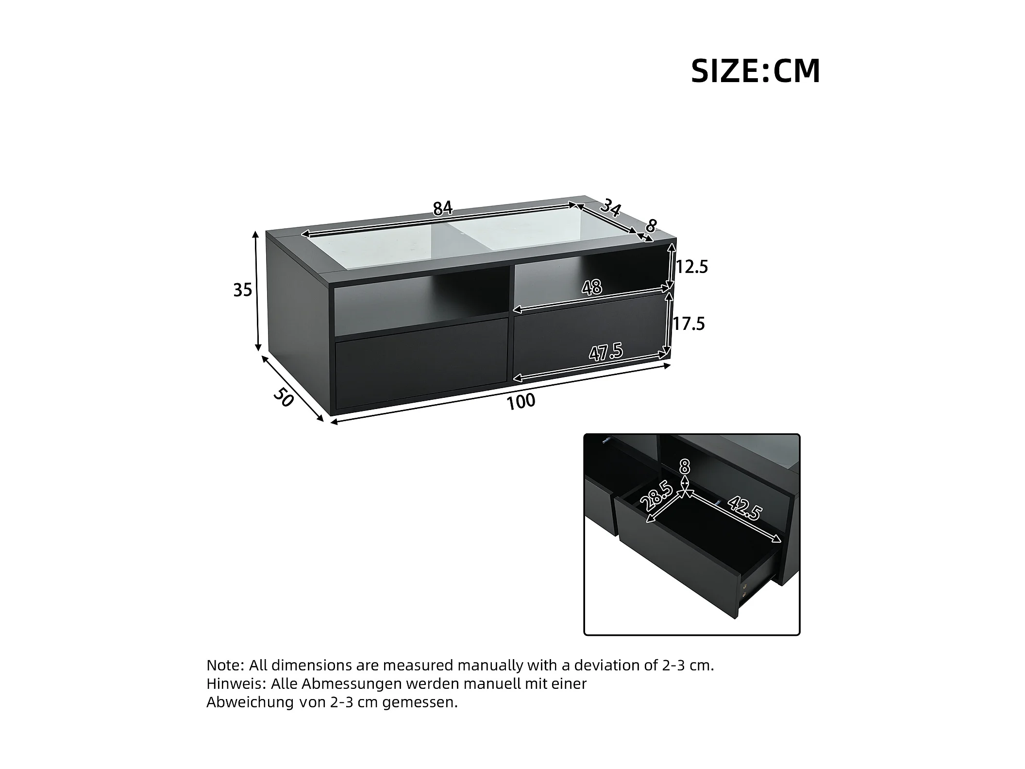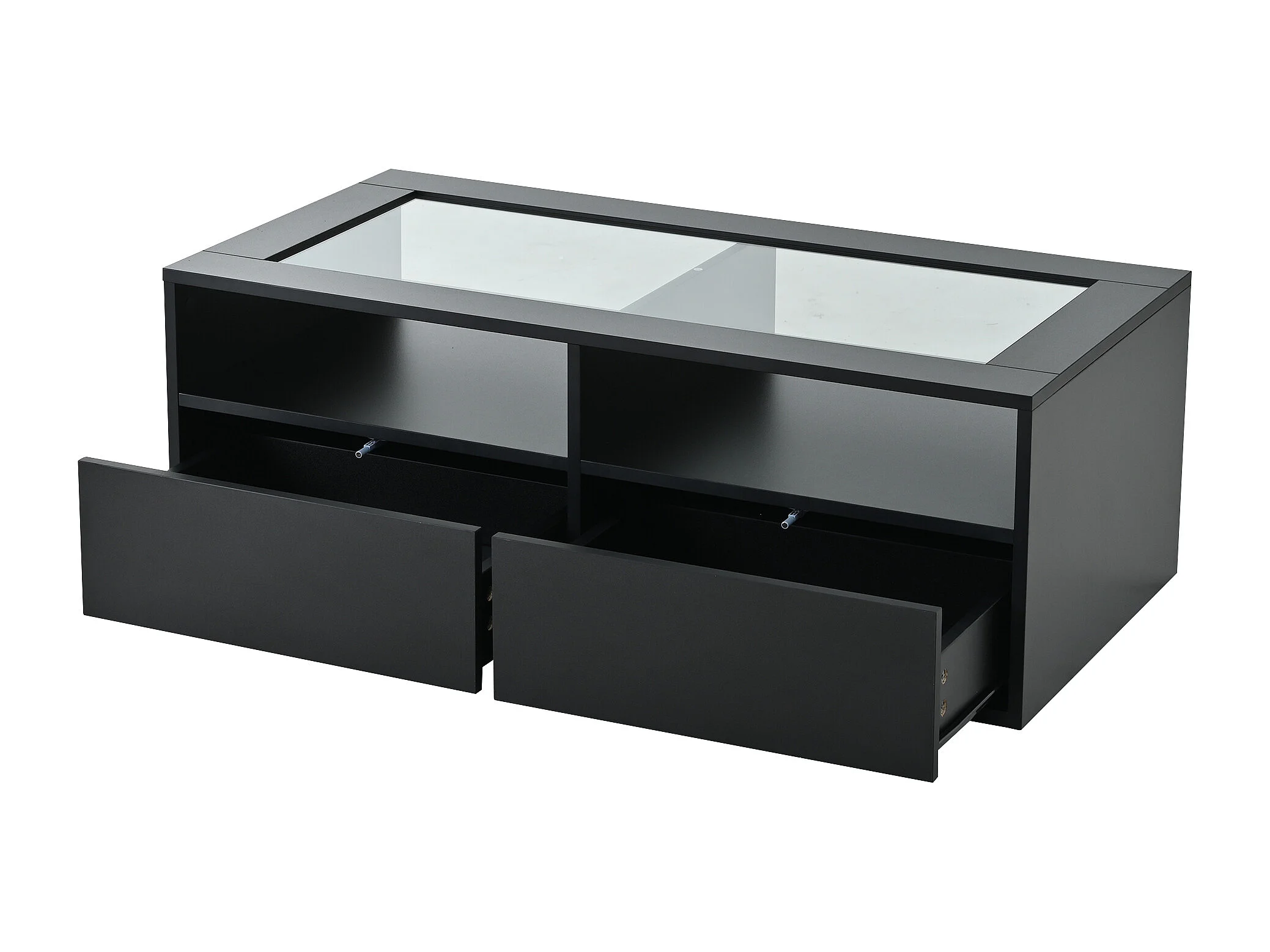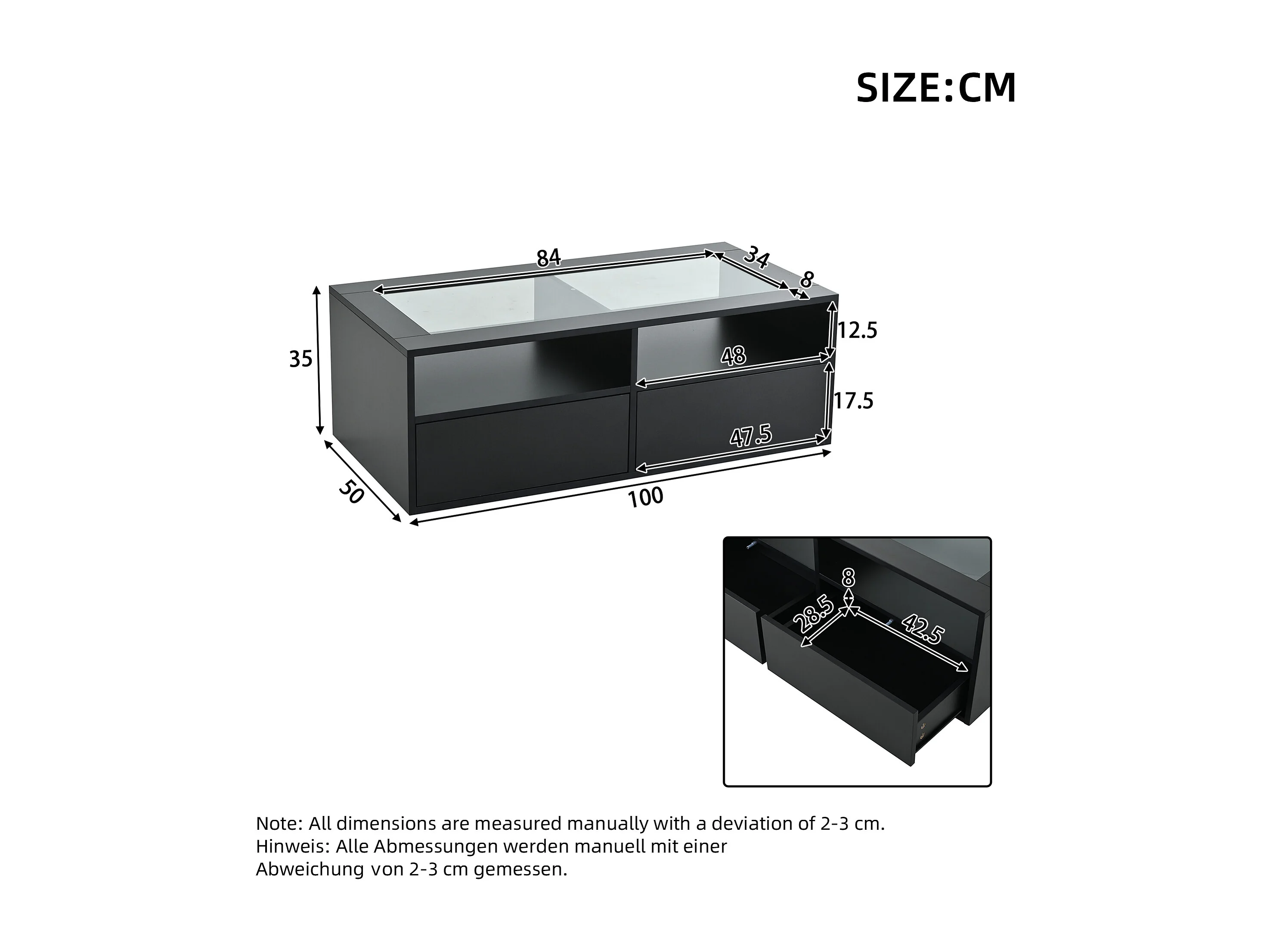 Table basse 100x50x35cm - avec éclairage LED - 2 tiroirs - Plateau en verre - Rangement ouvert - Noir