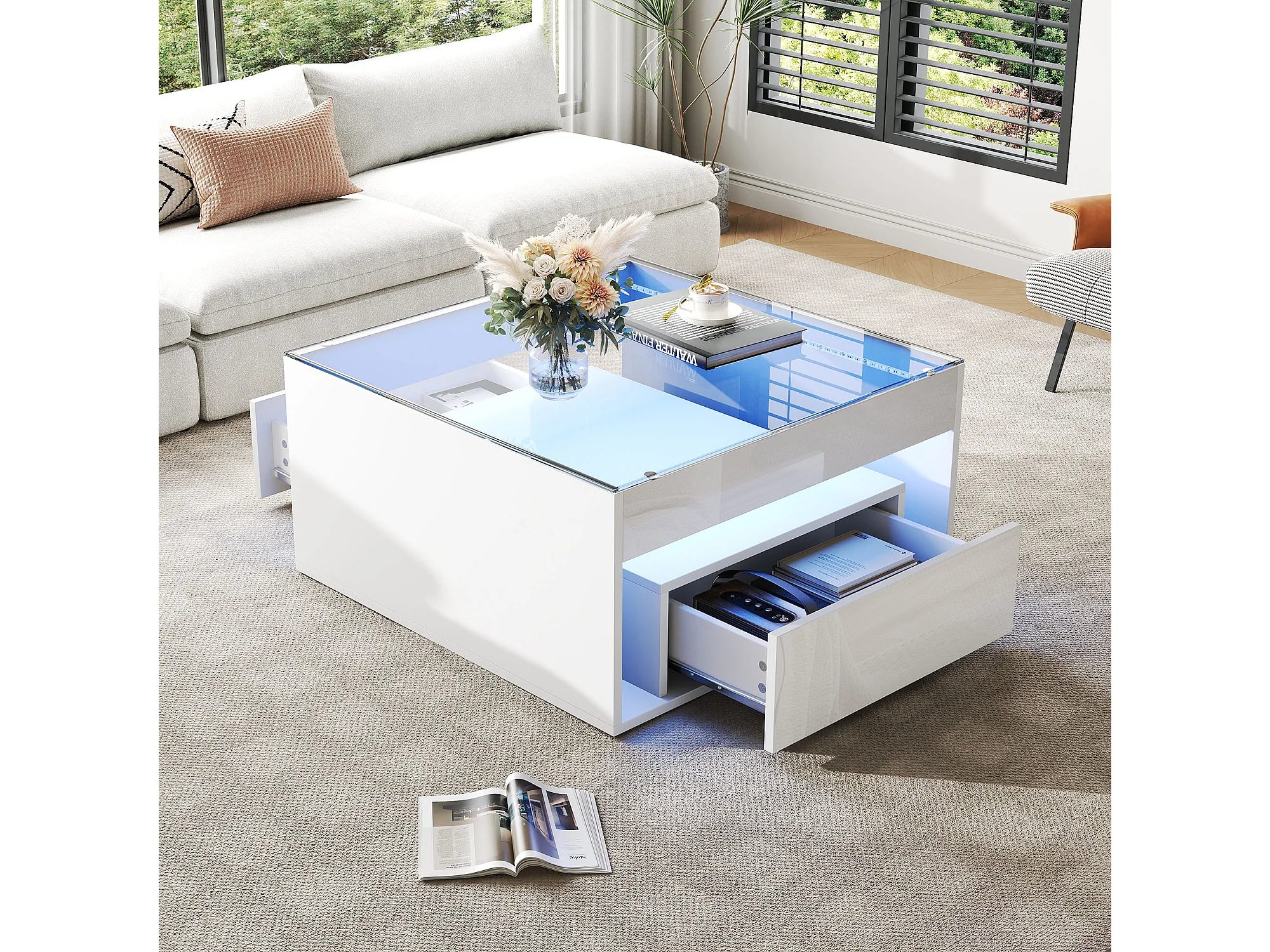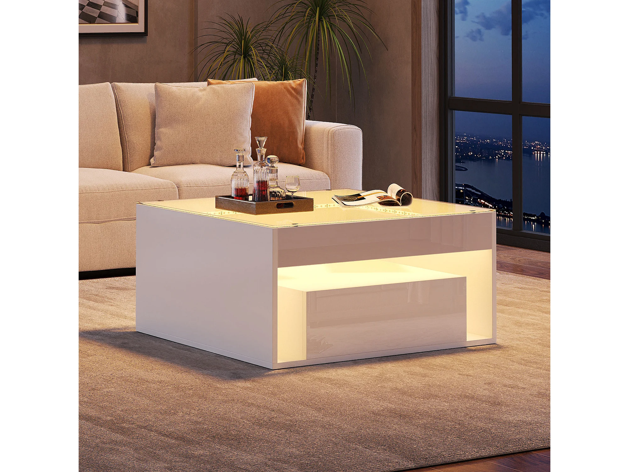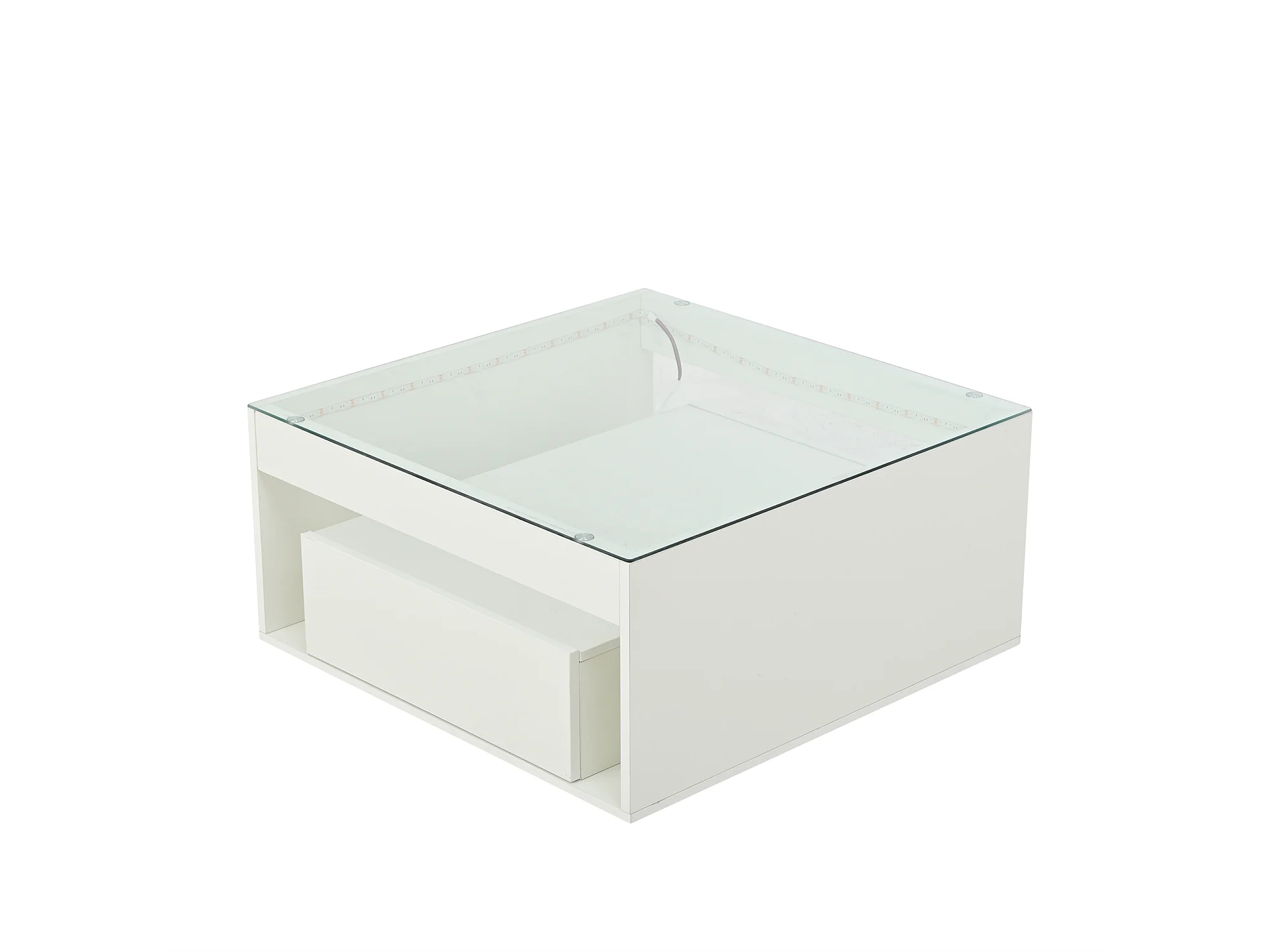 Table basse 70x70x35 cm, 2 tiroirs, éclairage LED, compartiment ouvert, MDF et verre trempé, blanc