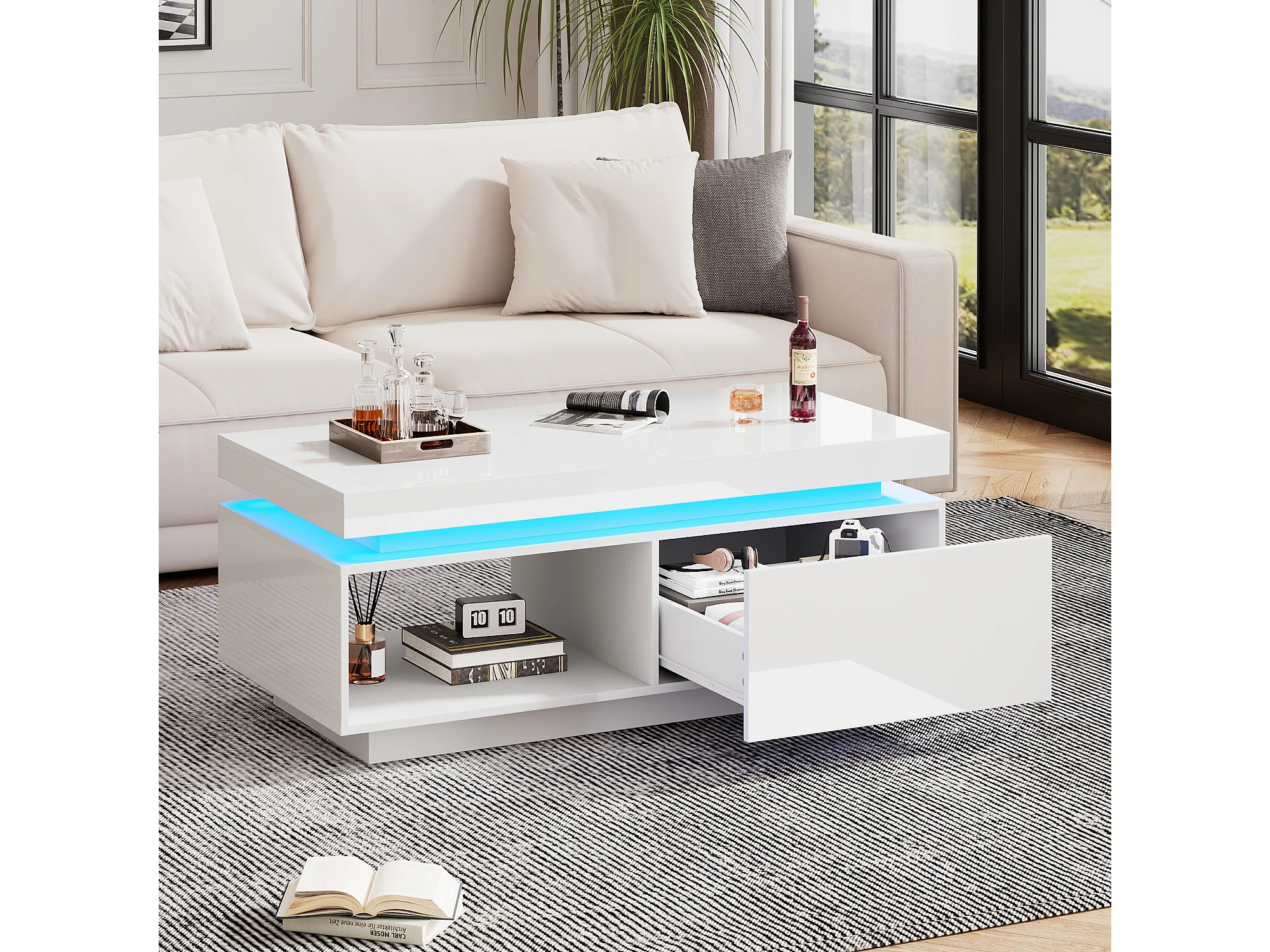 Table basse 100x50x40.3 cm, éclairage LED, 1 tiroir de rangement, finition haute brillance, panneau de particules, blanc