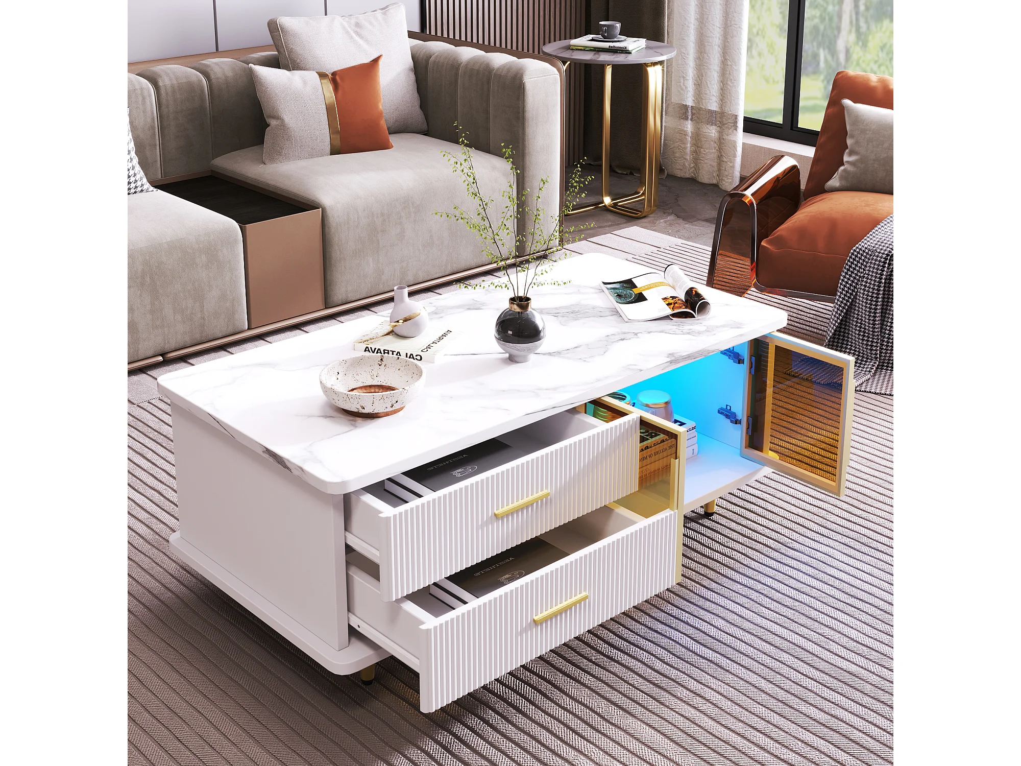 Table basse 100x50x40 cm, LED multicolore, 2 tiroirs et 2 portes, panneau de particules, blanc