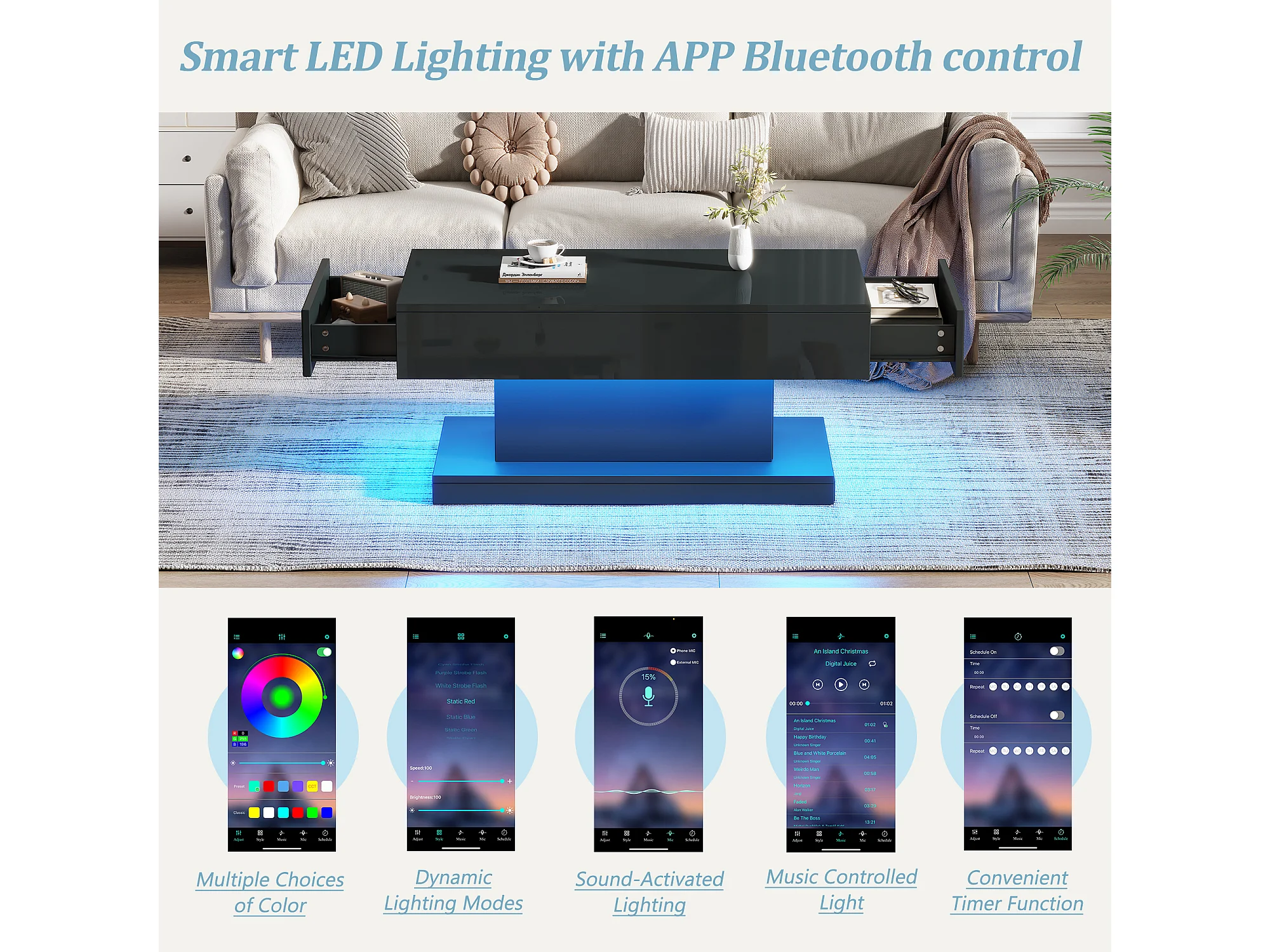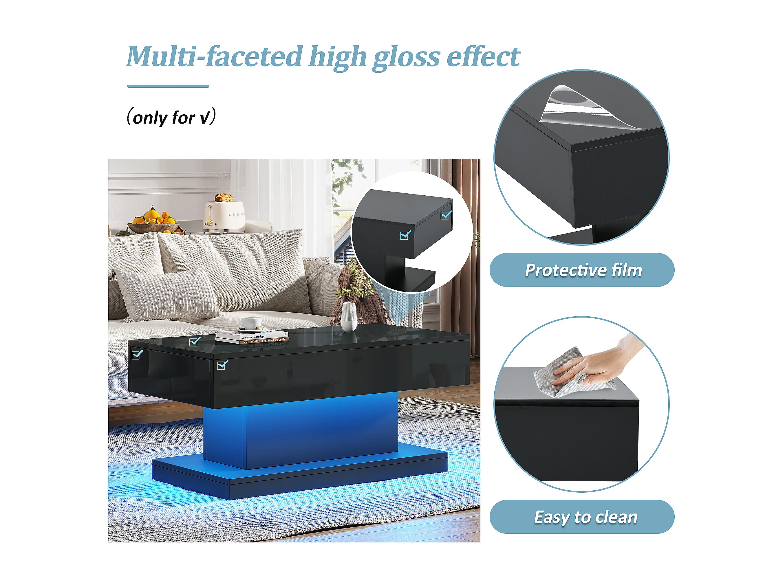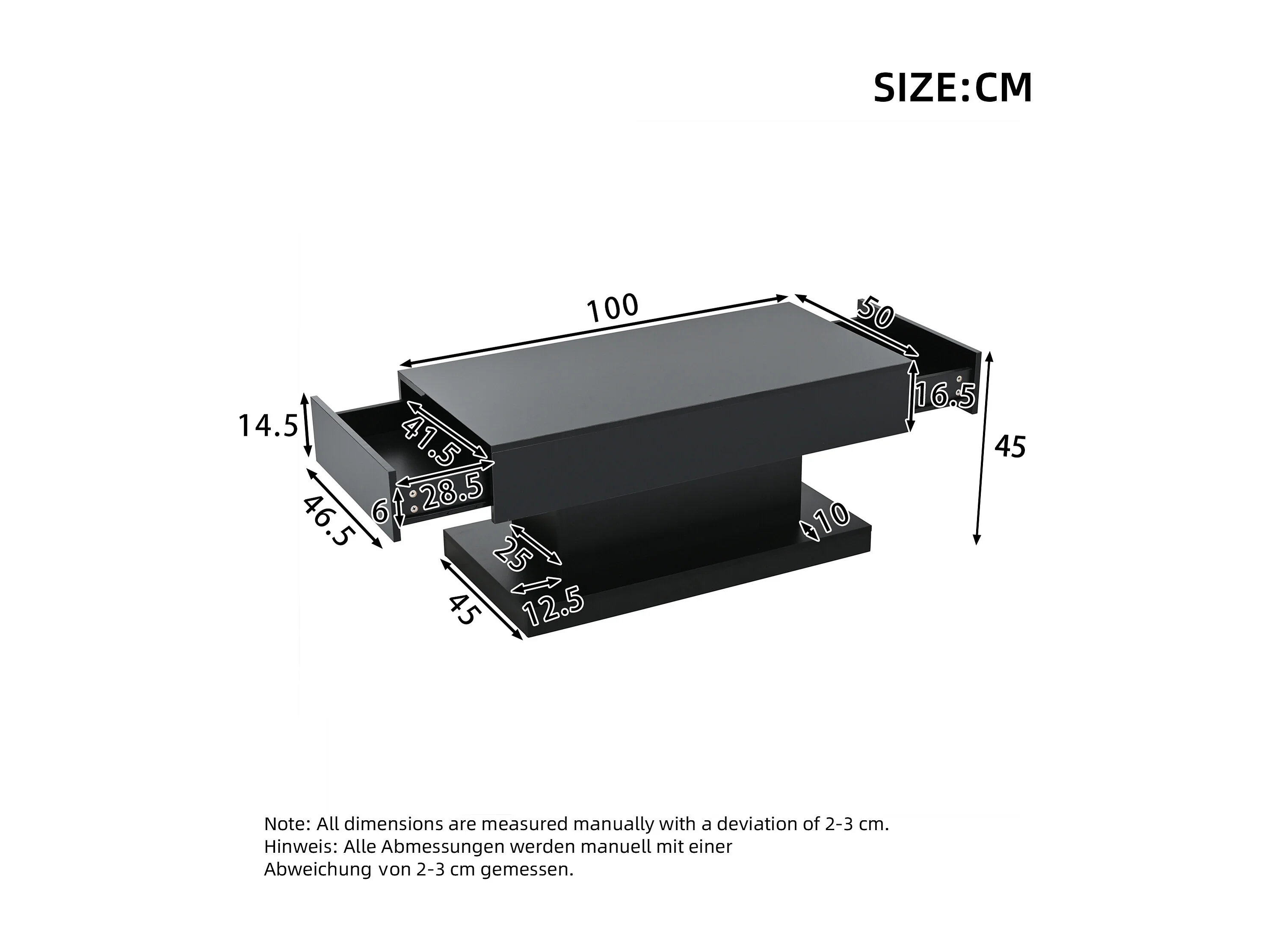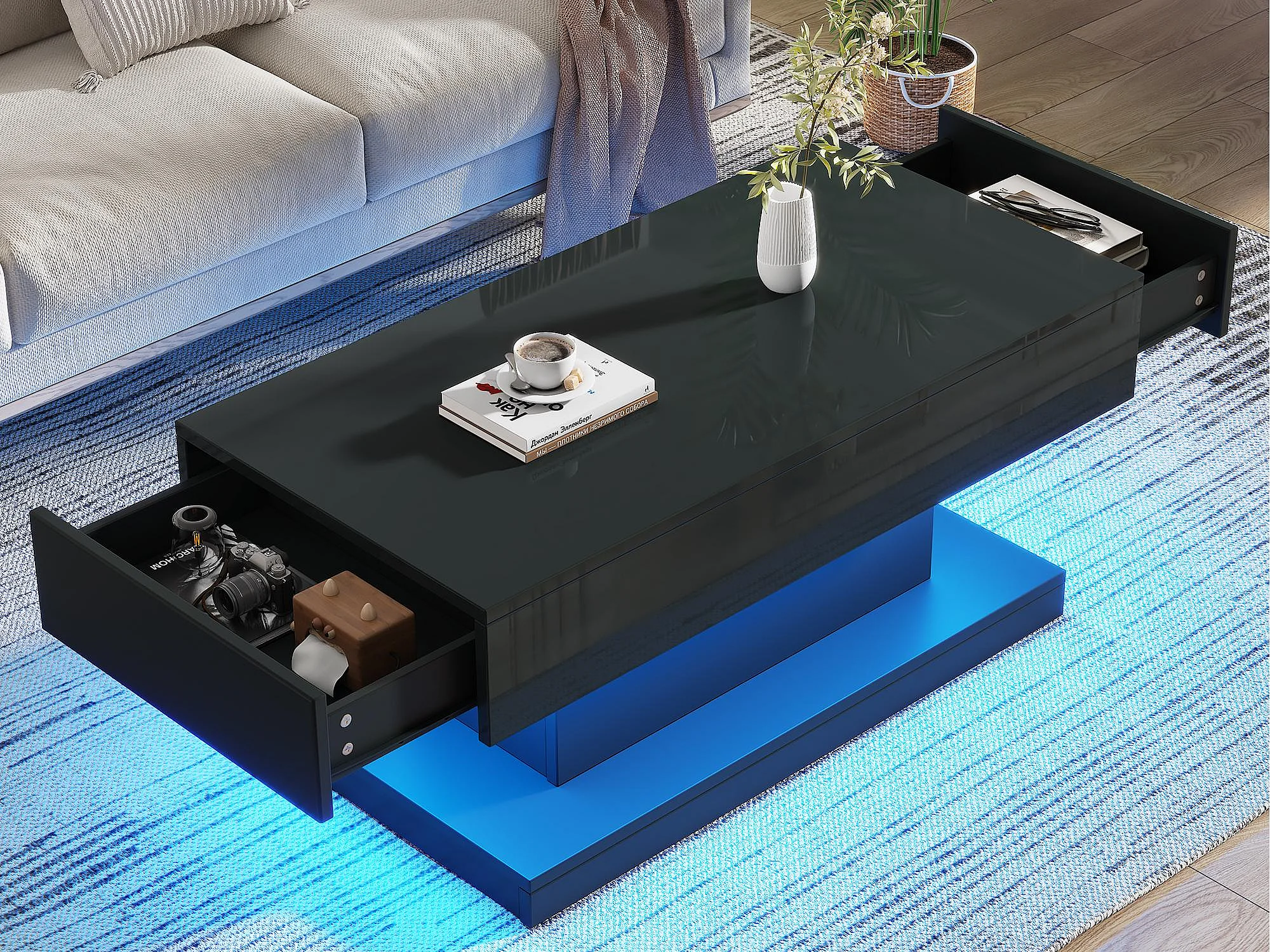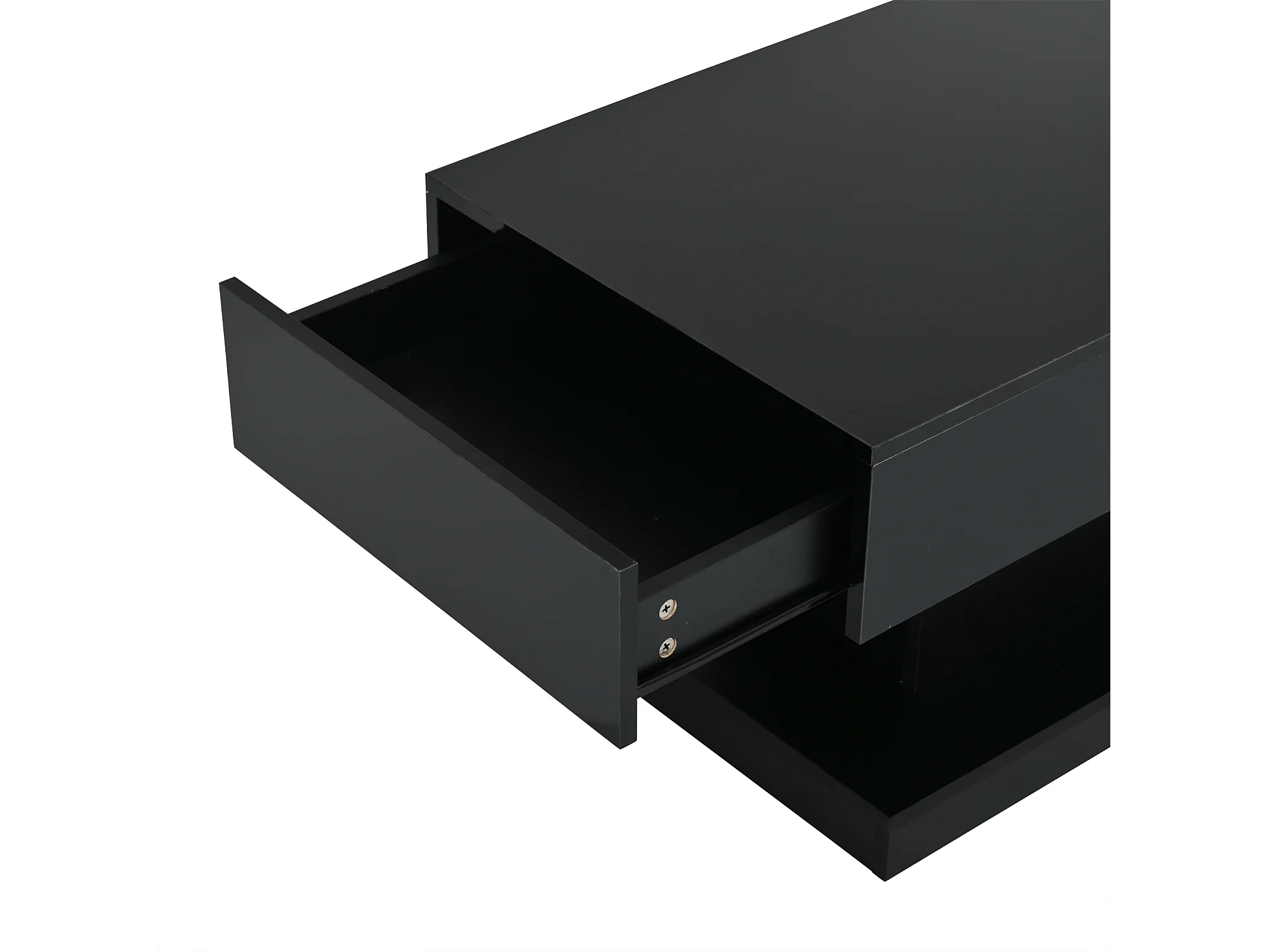 Table basse 100x50x45cm - avec 2 tiroirs - avec éclairage LED - Finition brillante - Noir