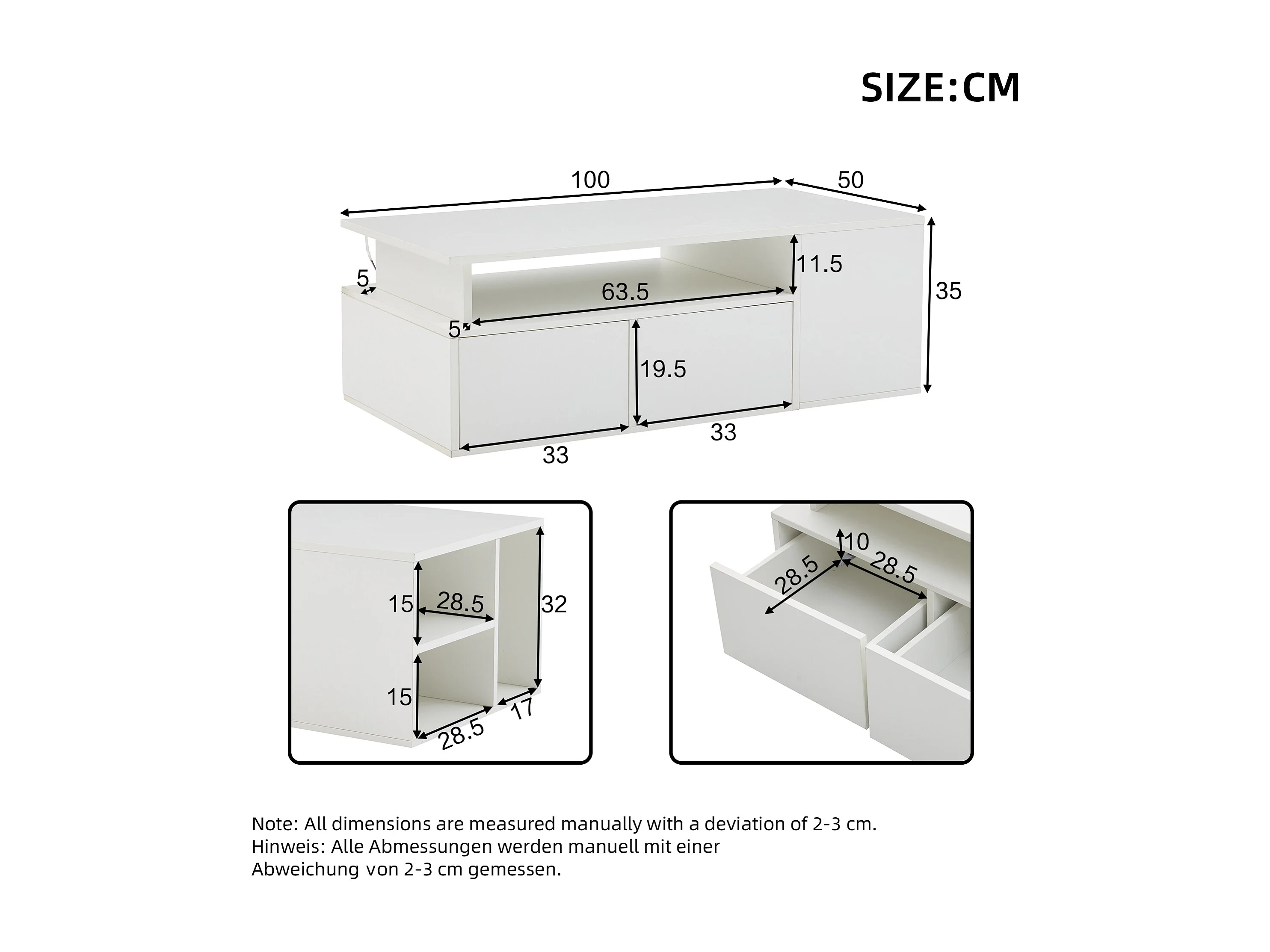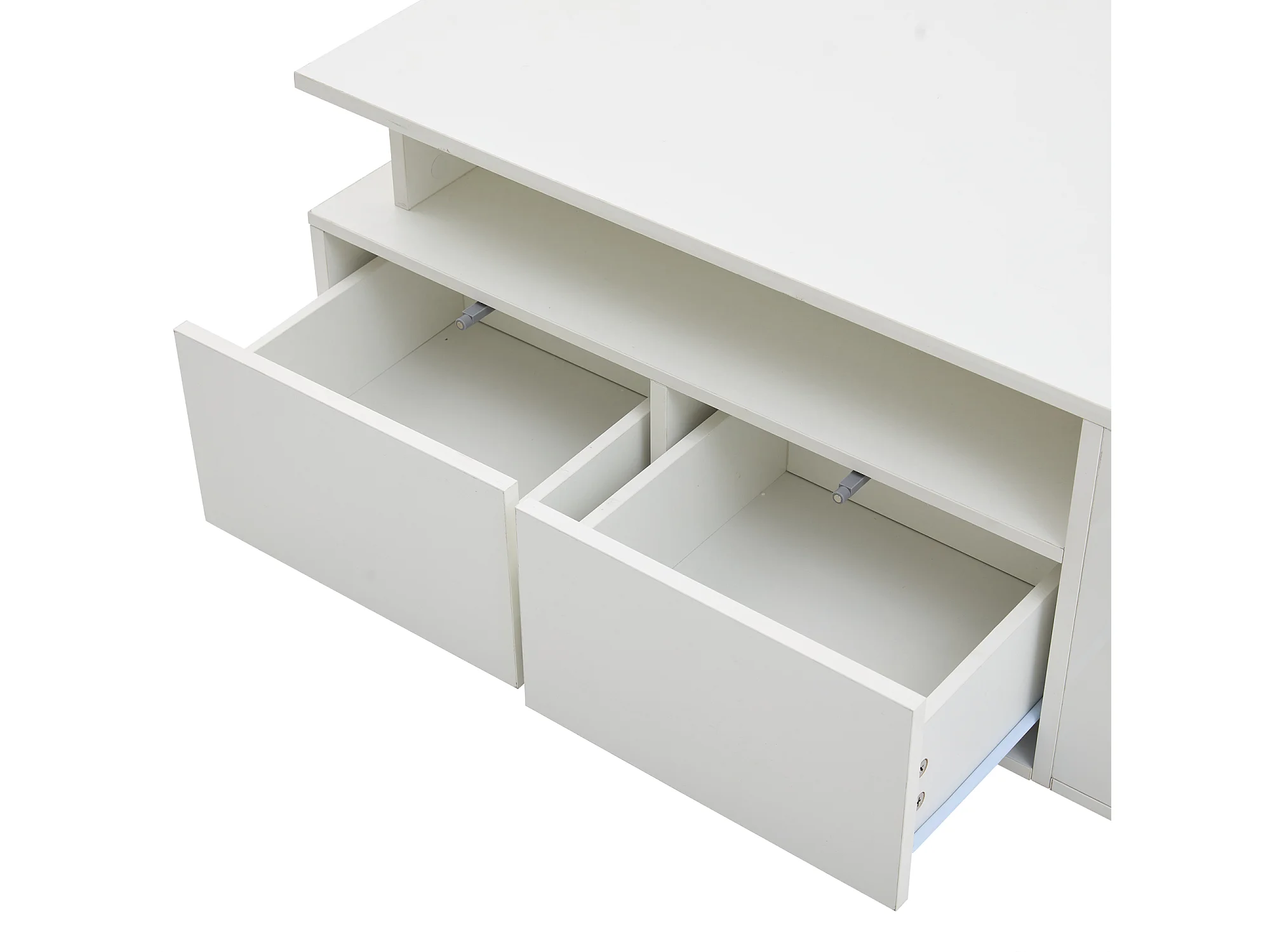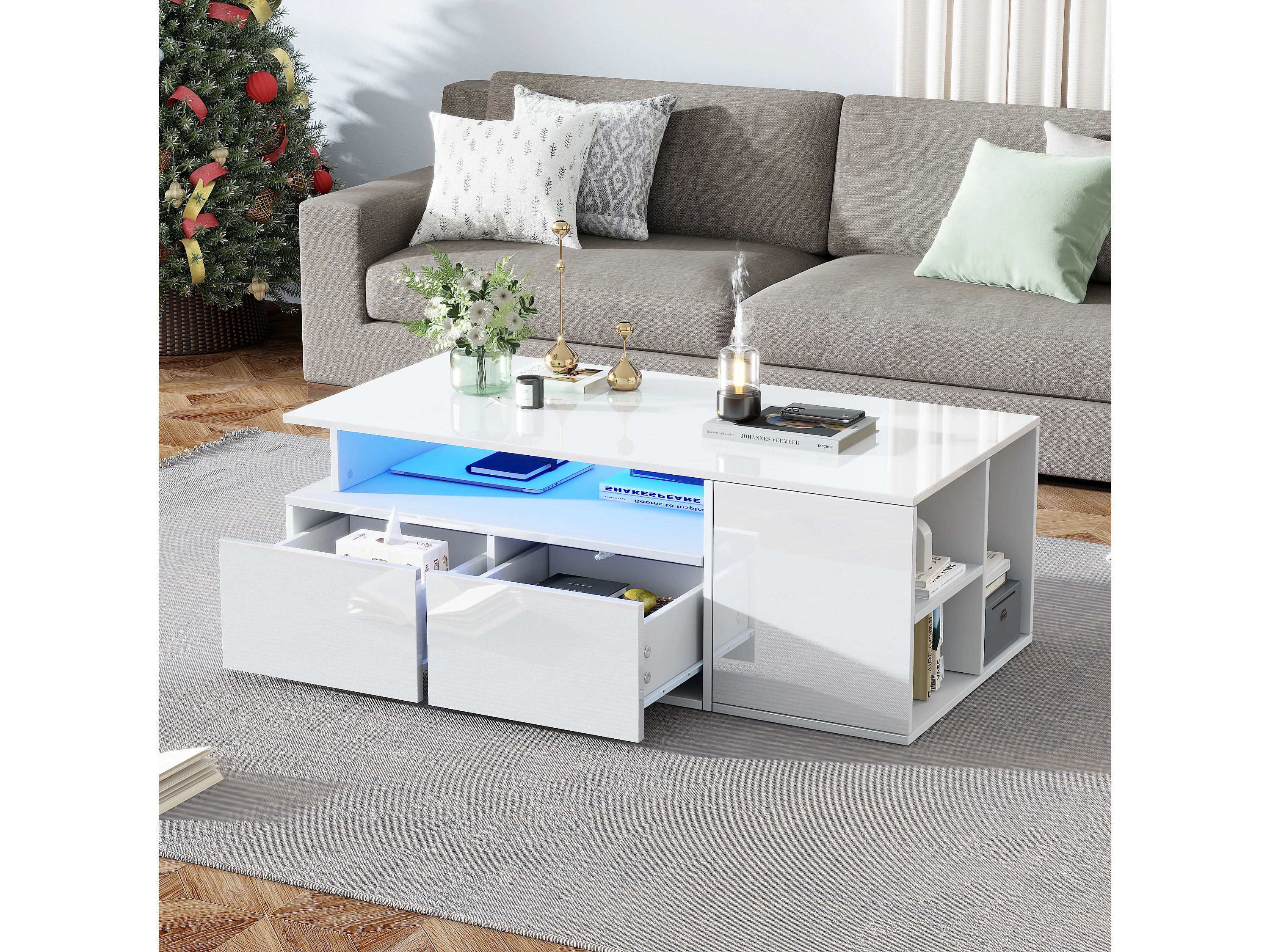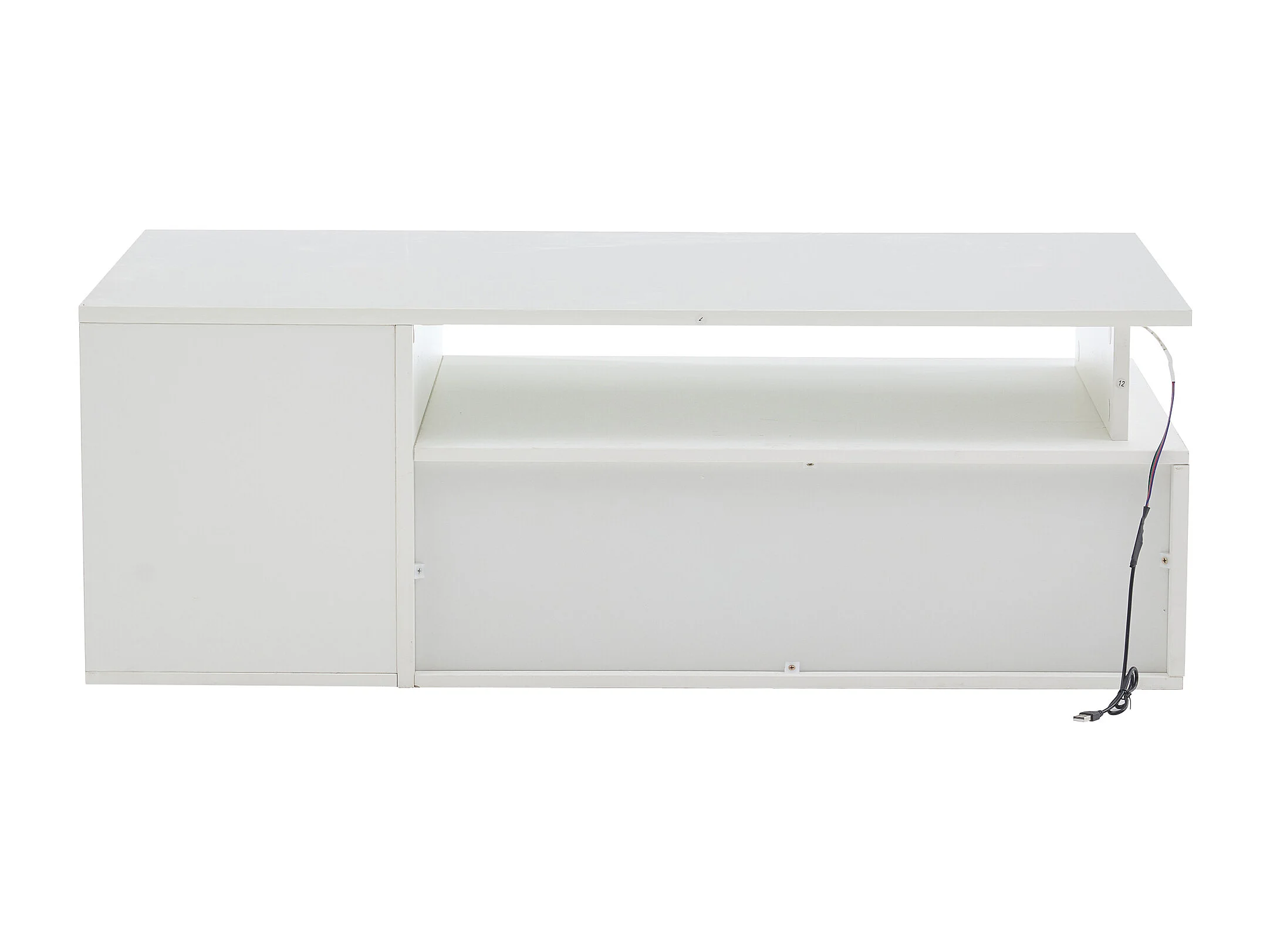 Table basse 100x50x35 cm, LED contrôlée par application, 2 tiroirs, 3 niveaux, panneaux de particules, blanc