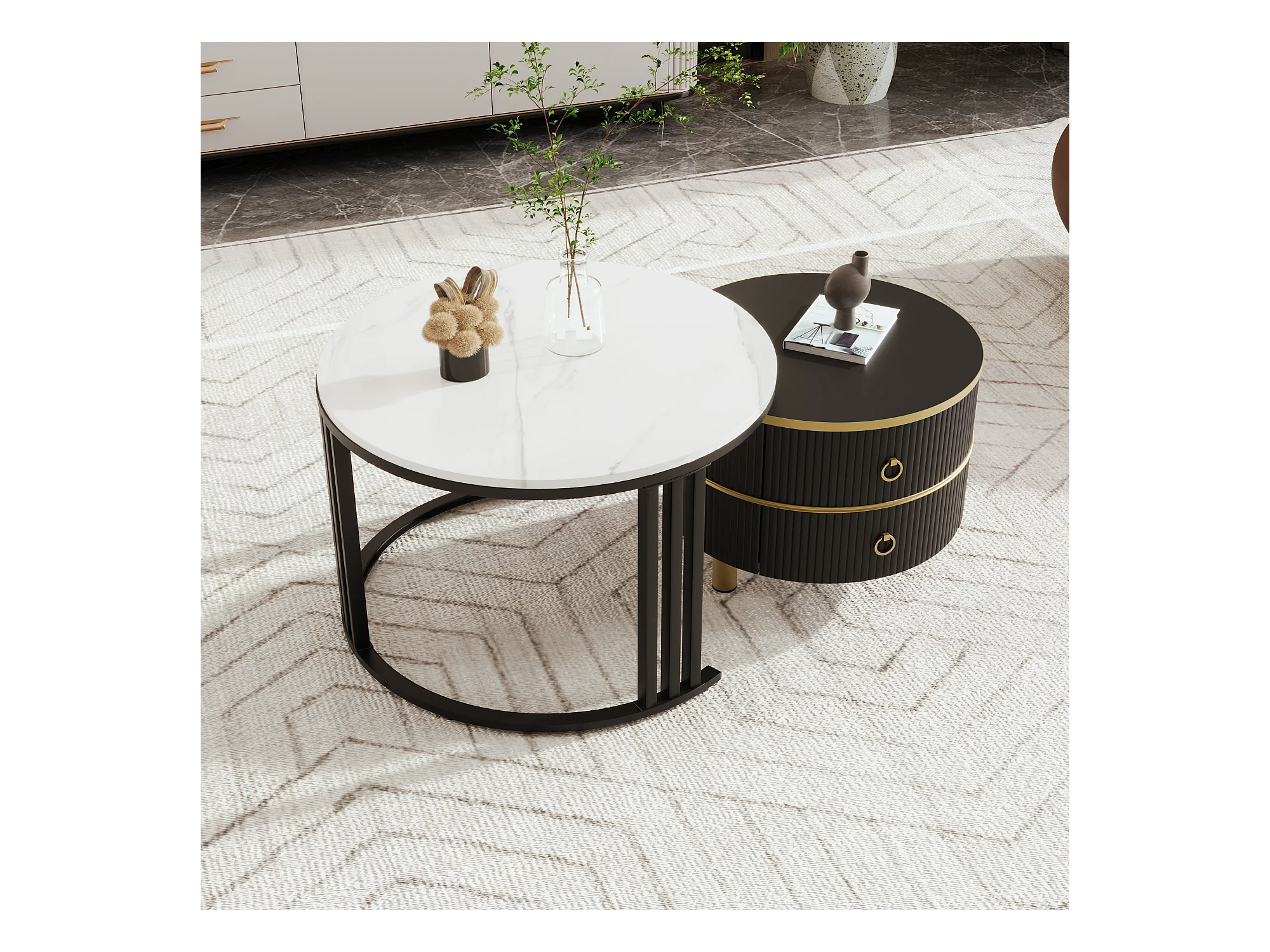 Lot de 2 tables basses gigognes rondes avec 2 tiroirs - 60x60x46cm + 50x50x30.8cm - Motif à marbre - Bois MDF et métal - Blanc + noir