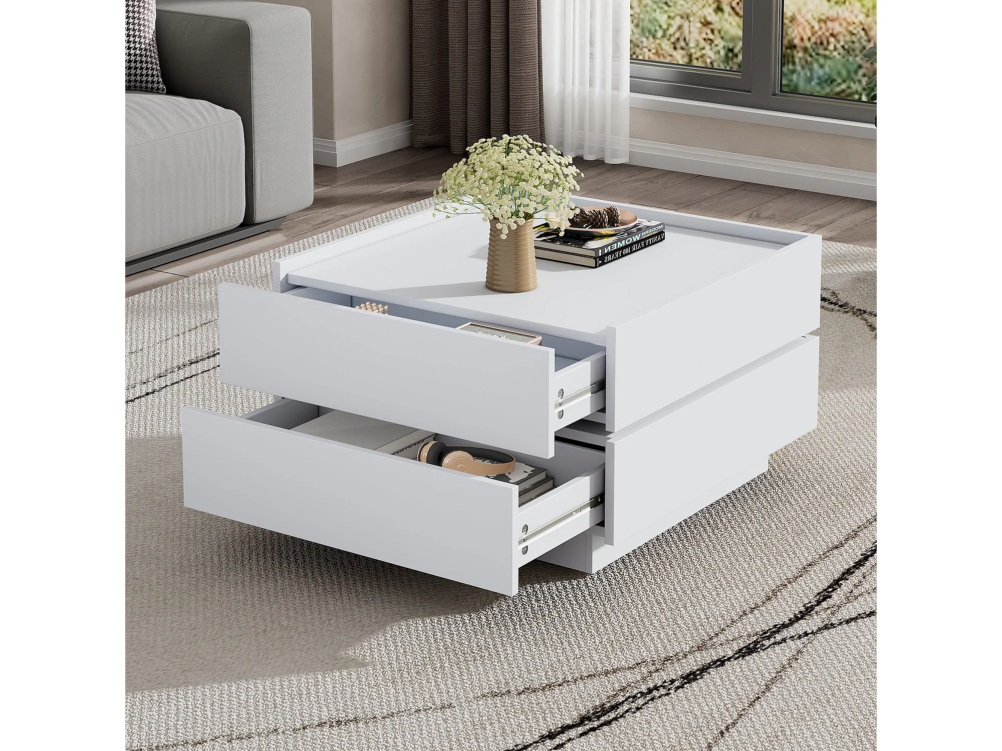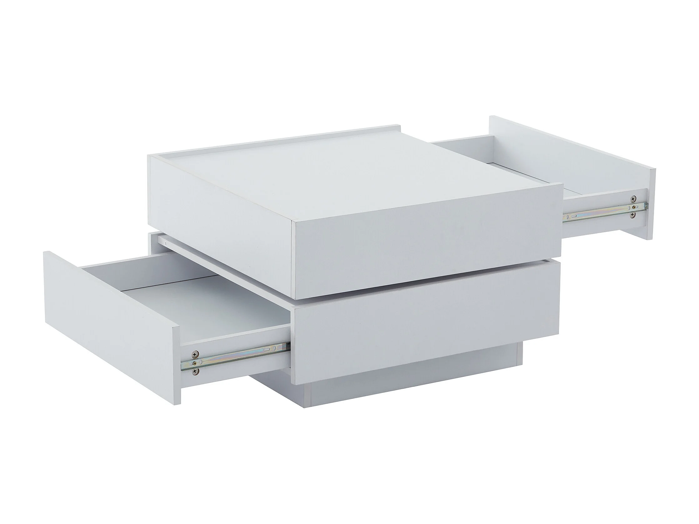 Table basse carrée avec plateau pivotant, 2 tiroirs rangements, blanc - pour salon ou chambre