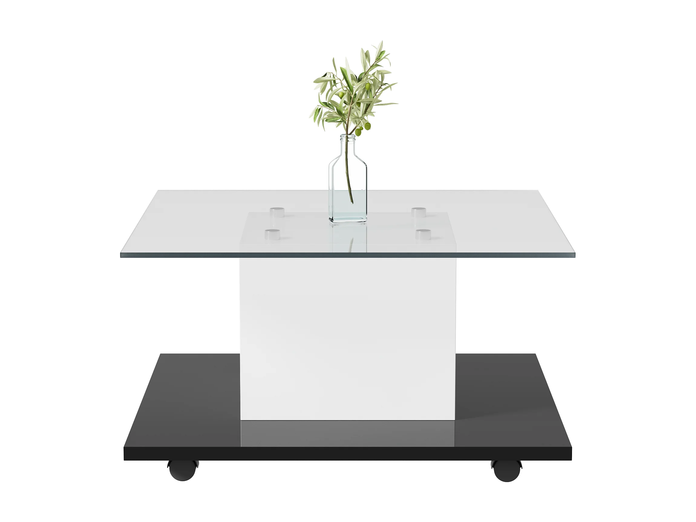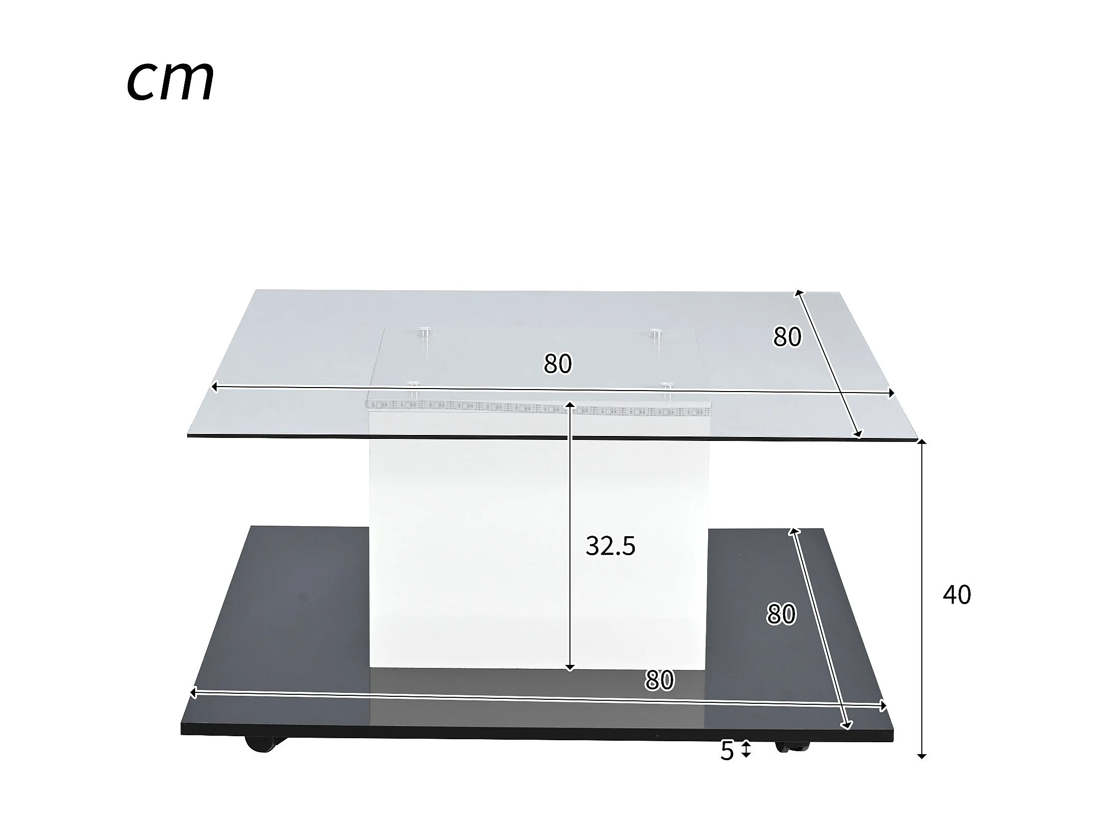 Table basse 80x40x80 cm, bande LED réglable, roulettes avec frein, plateau en verre trempé, panneau de particules, blanc et noir