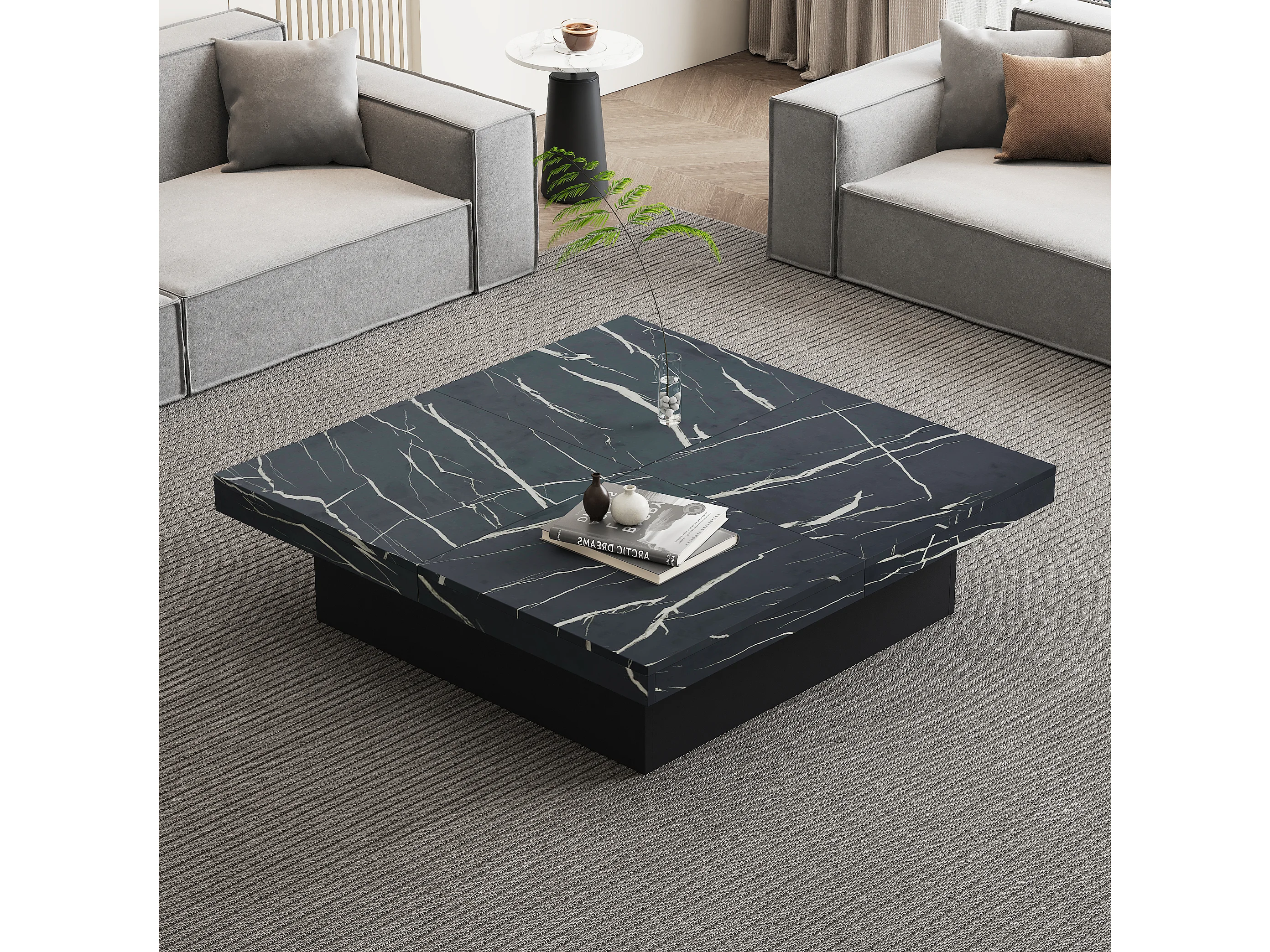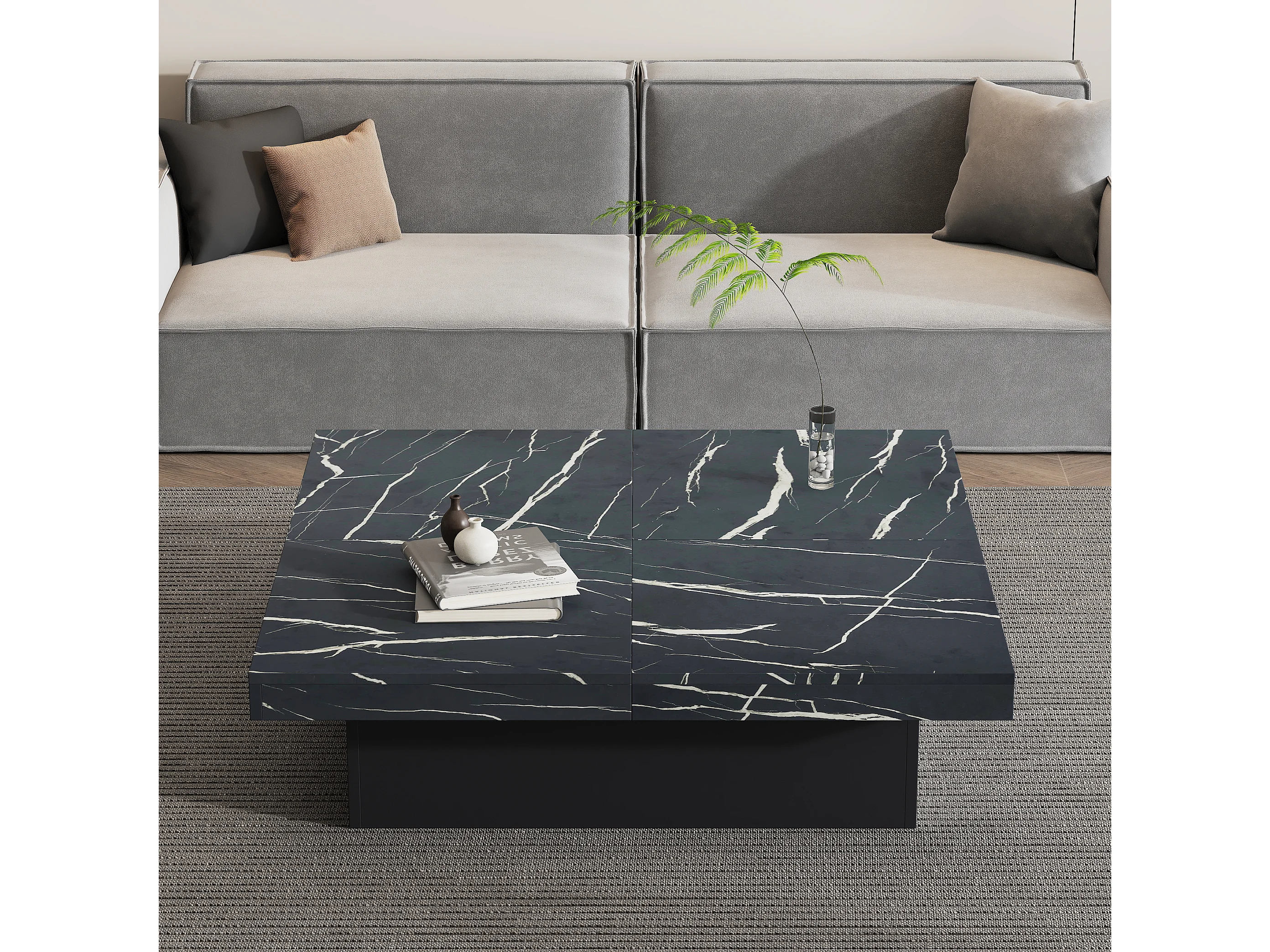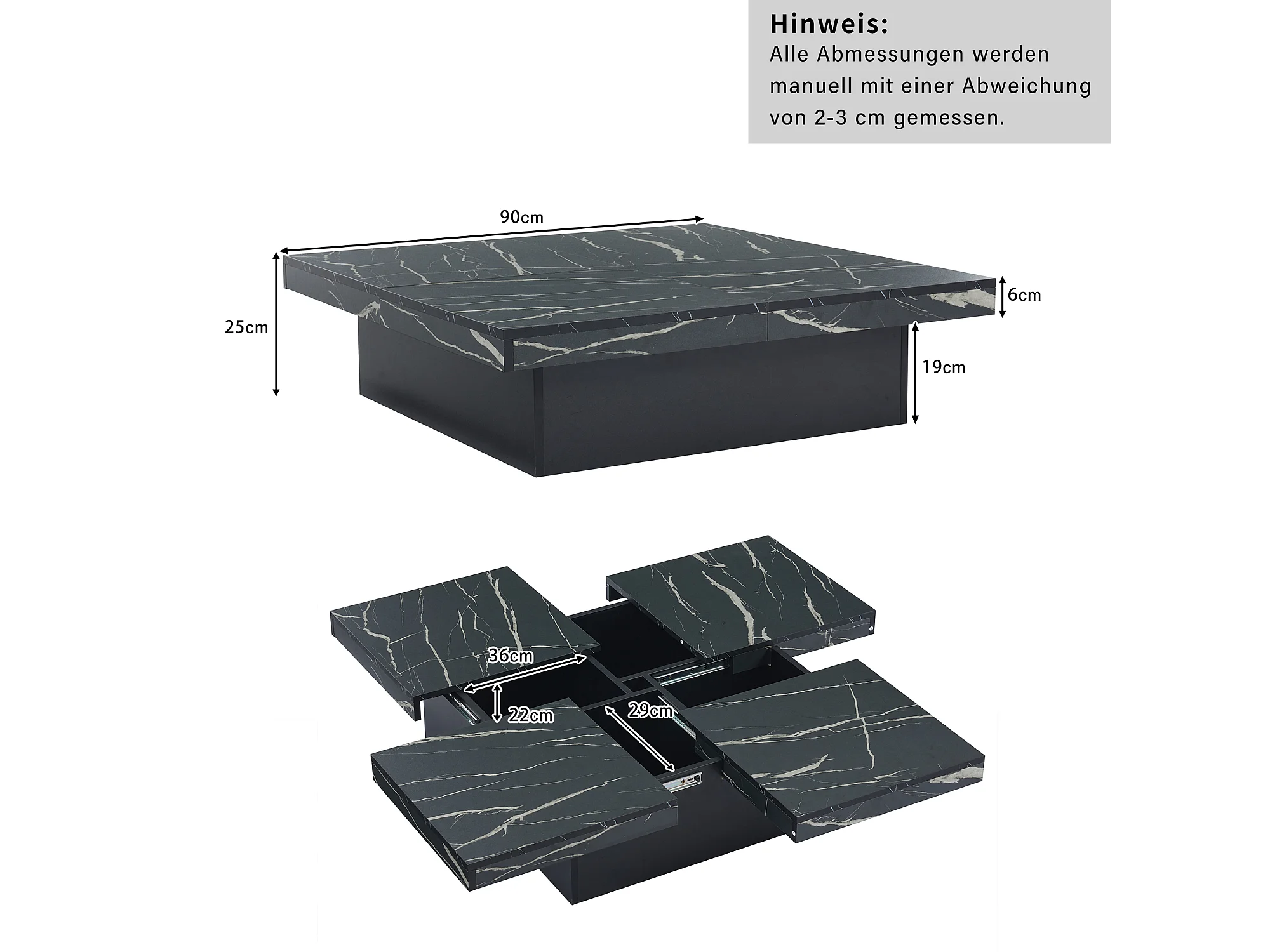 Table basse carrée 90x90x25 cm, plateau coulissant, 4 tiroirs, capacité 30 kg, panneau de particules, noir