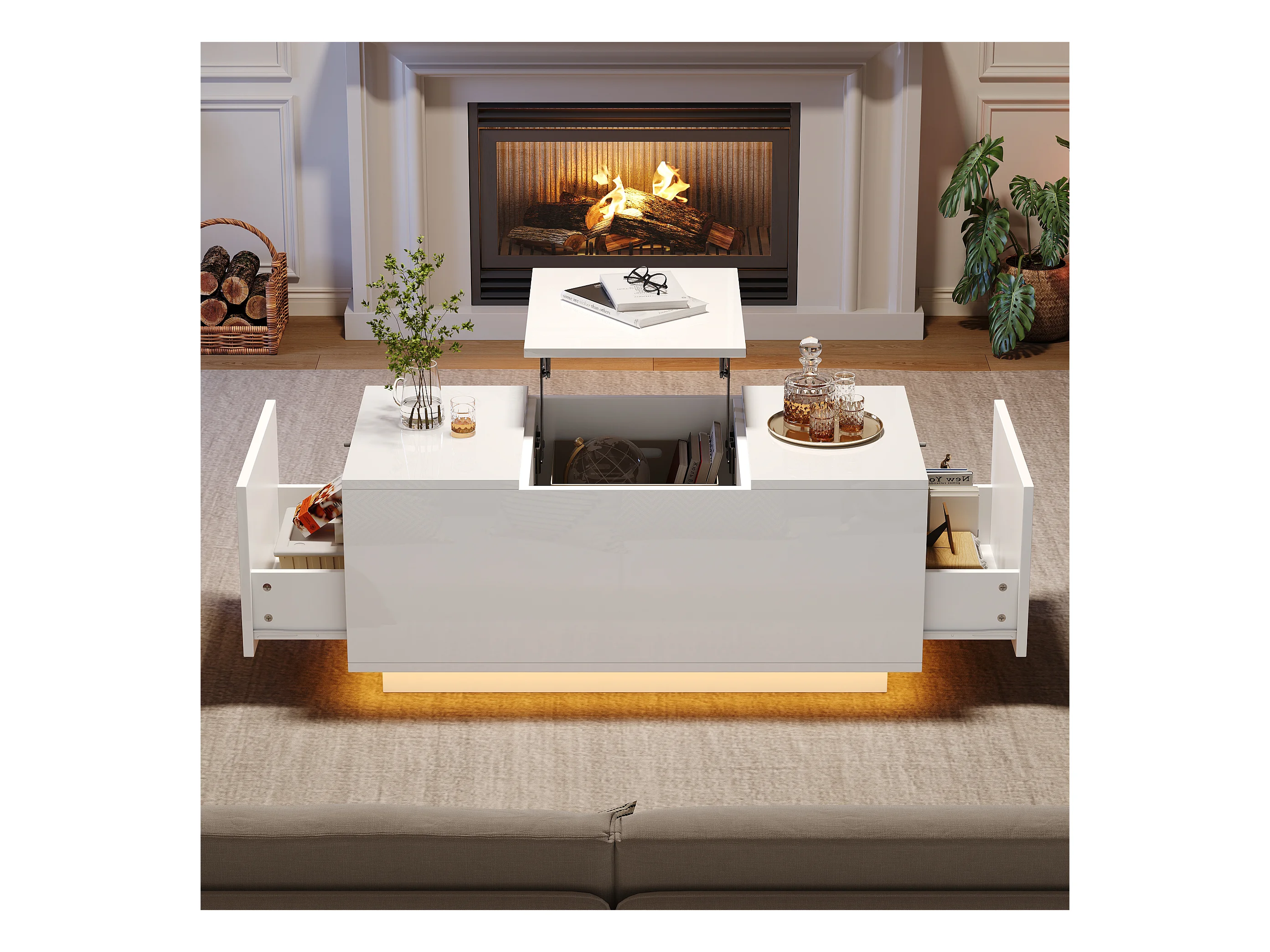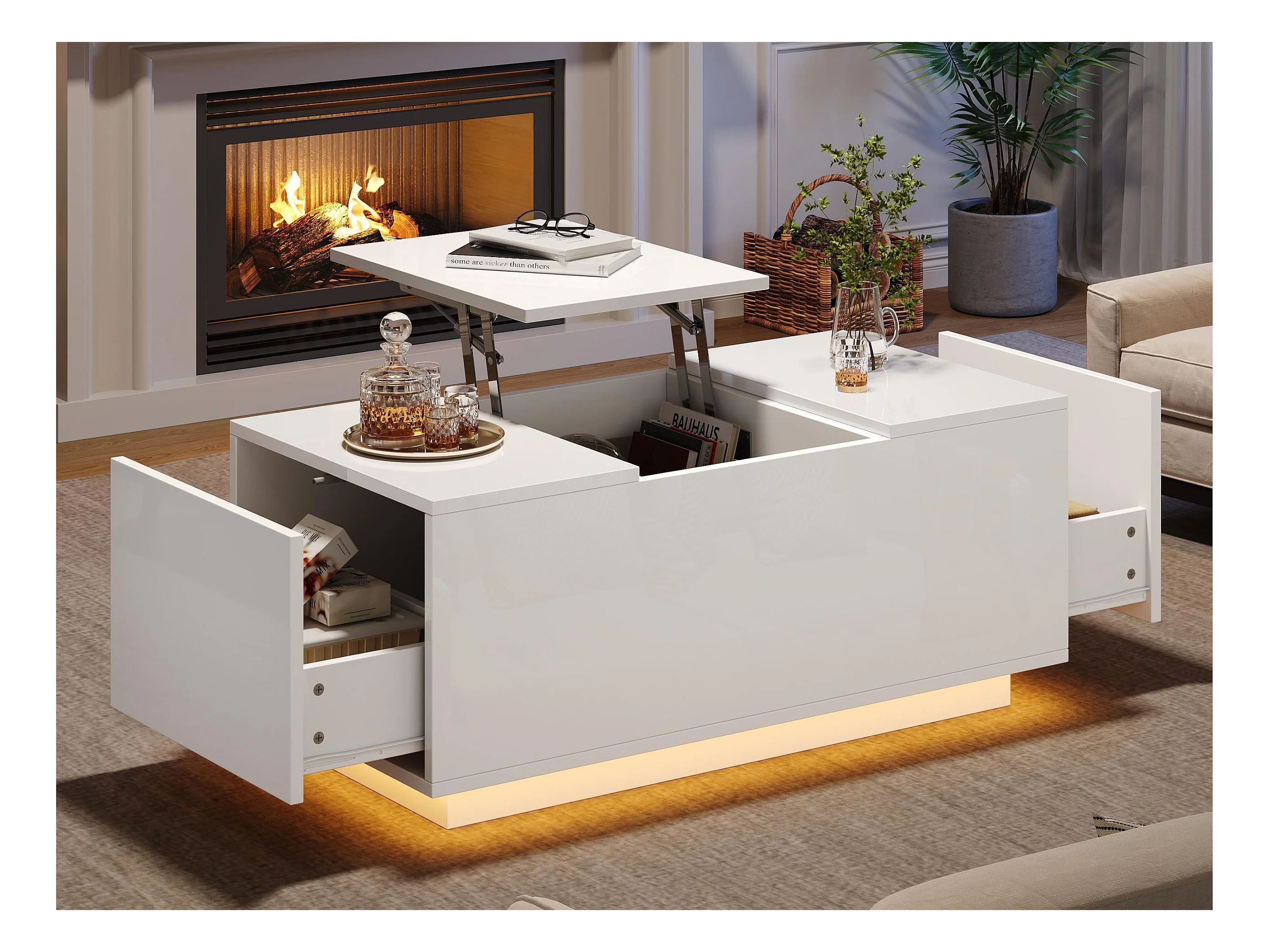 Table basse relevable avec LED - avec rangements - effet brillant - Blanc