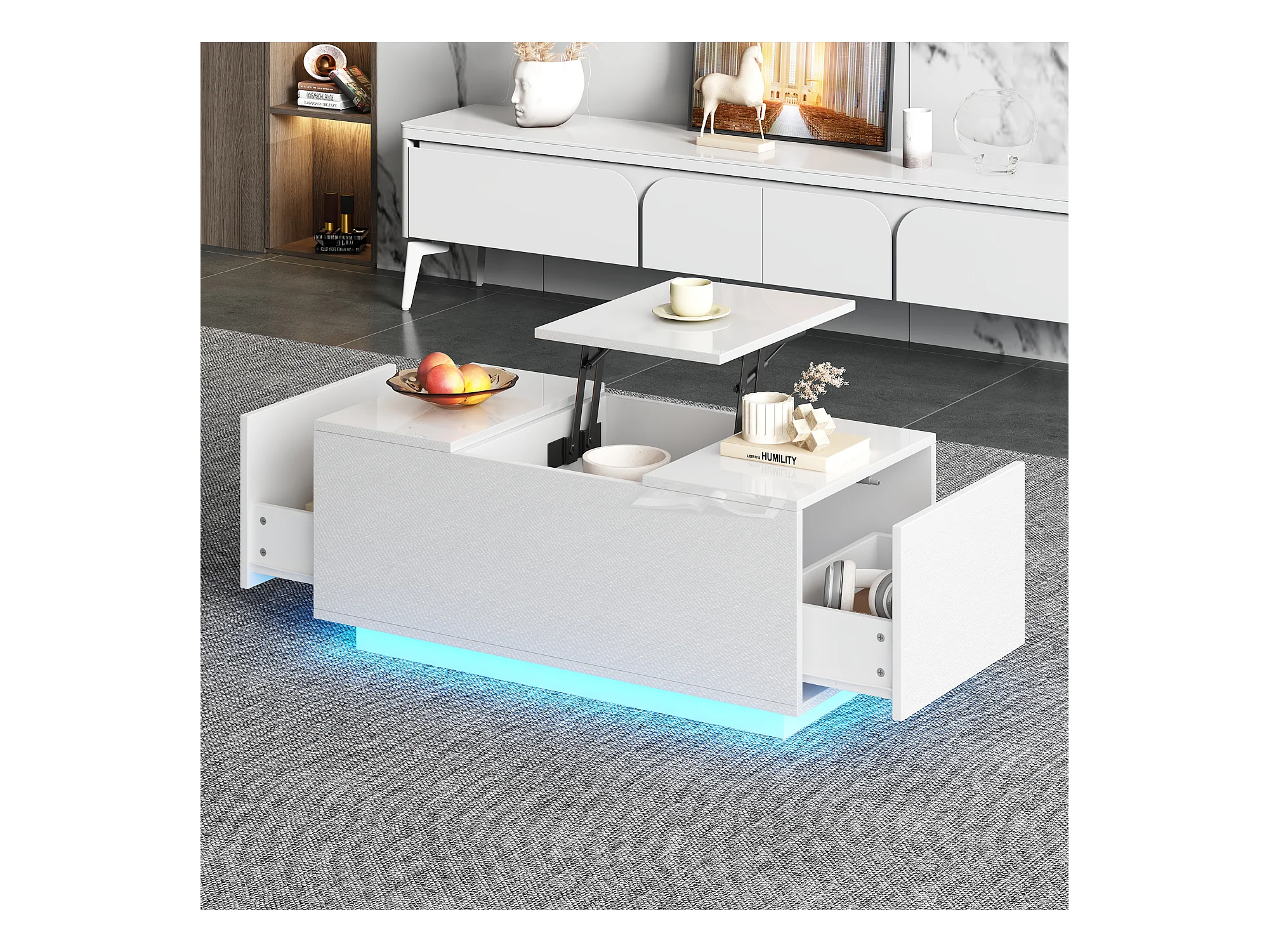 Table basse relevable hydraulique - 100 x 50 x 44 cm - avec Leds + 2 tiroirs - Aggloméré - blanc