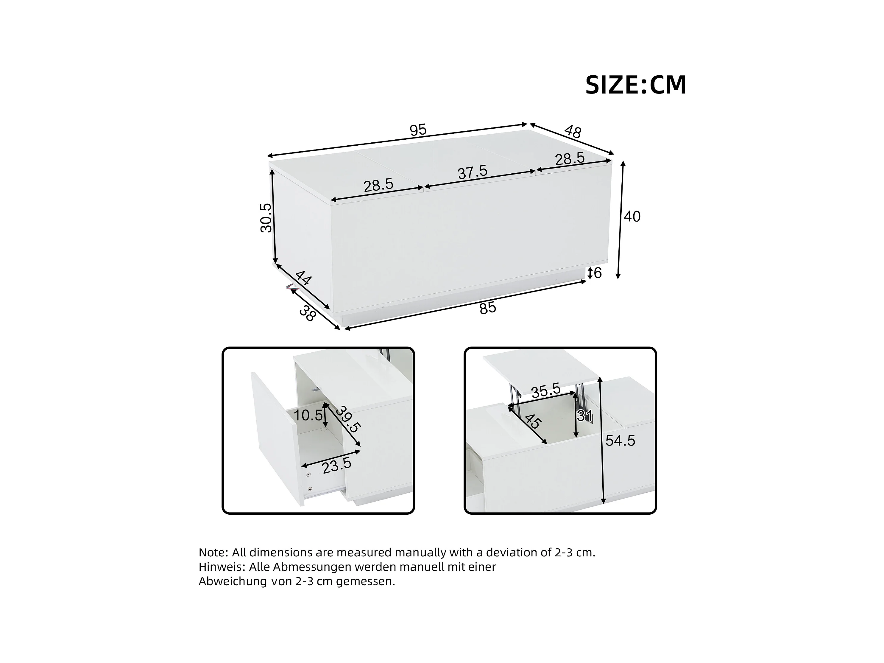 Table basse 95x48x40cm - avec petite table relevable - 2 tiroirs - avec éclairage LED - blanc