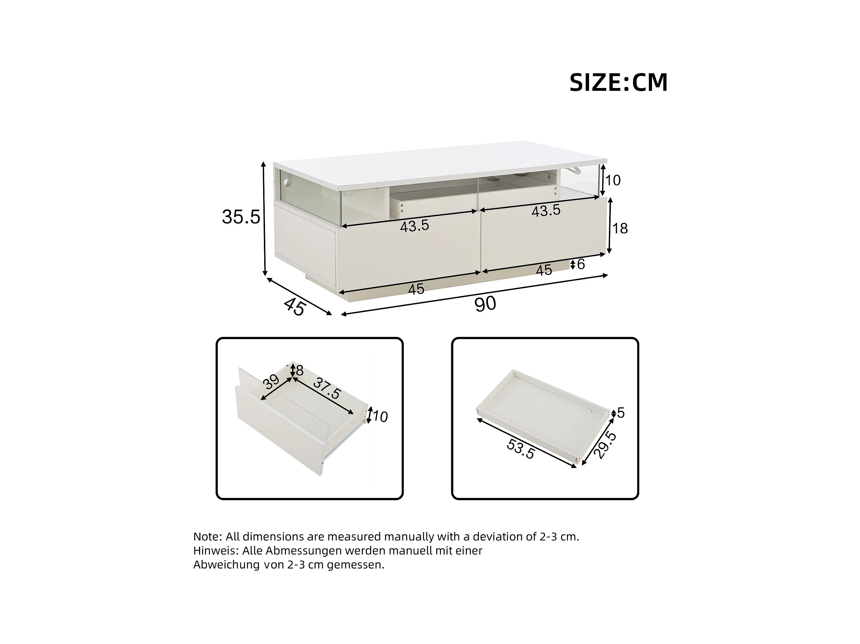 Table basse à 2 tiroirs - Table basse avec éclairage LED et plateau - table d'appoint en verre trempé - blanc