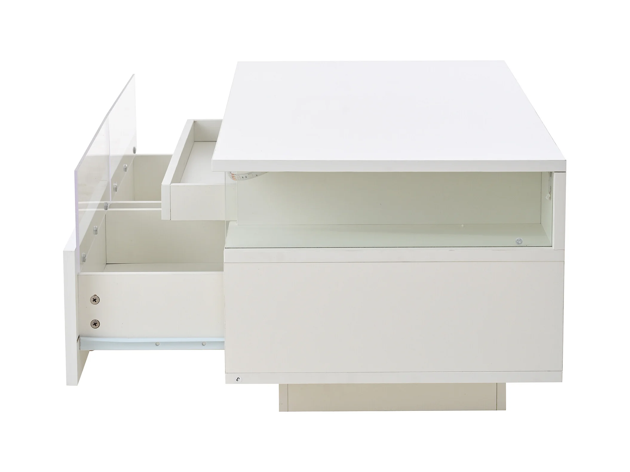 Table basse blanc avec 1 tiroir de rangement et étagères ouvertes, éclairage LED - pour salon