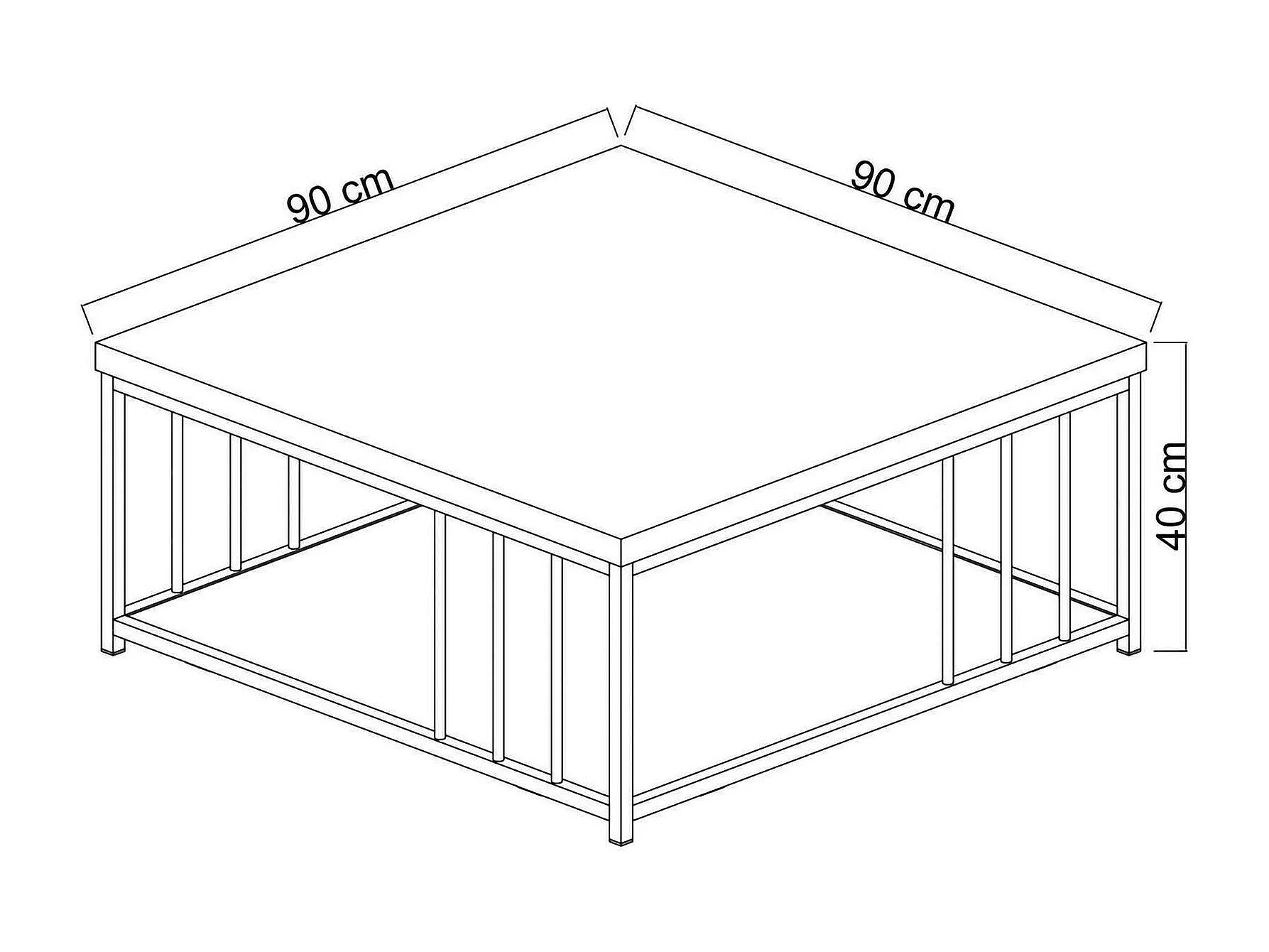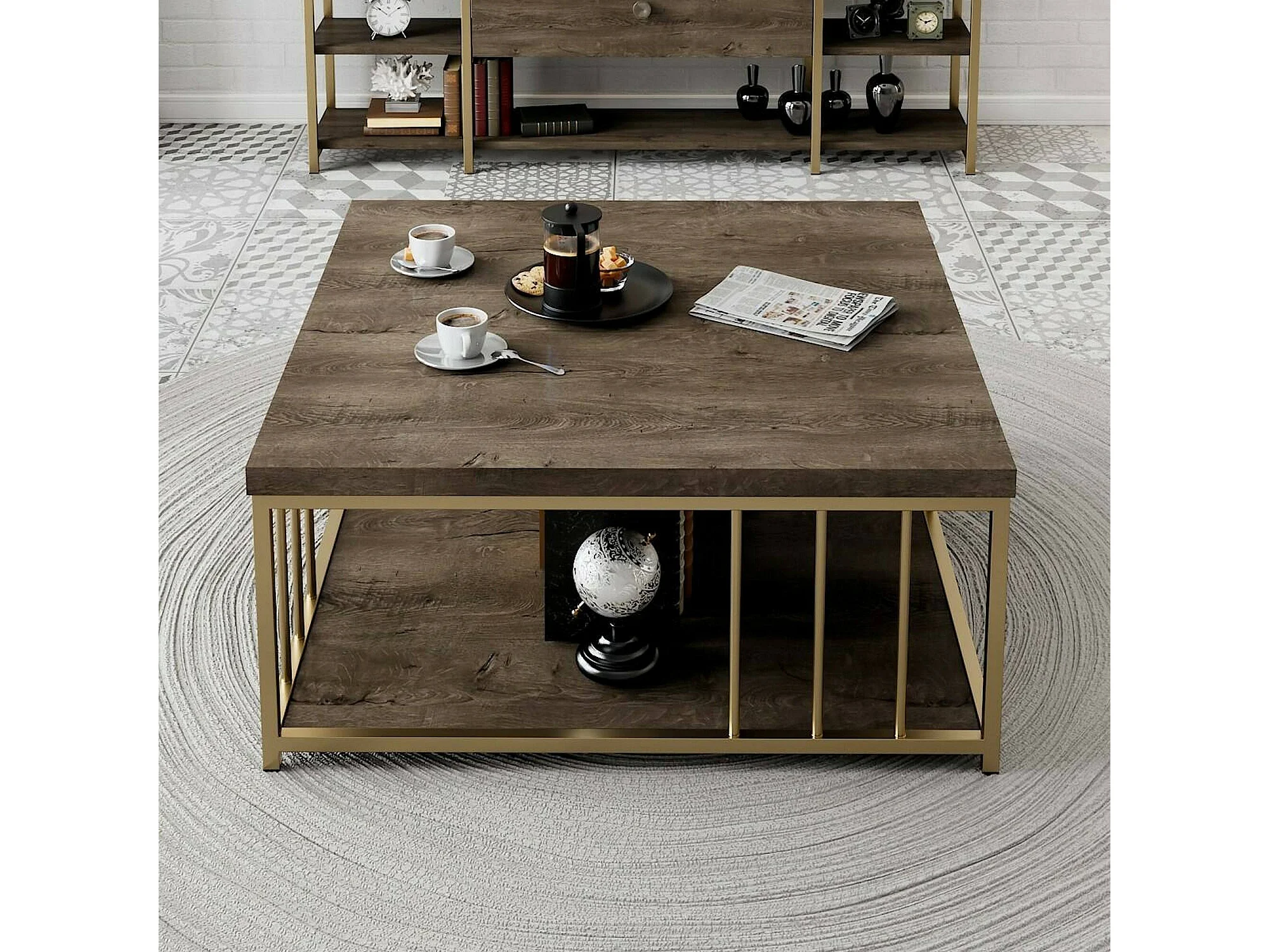 Table basse Ankaa, Table basse, Porte-revues pour canapé, Etagère de salon, 90x90h40 cm, Noyer et Or