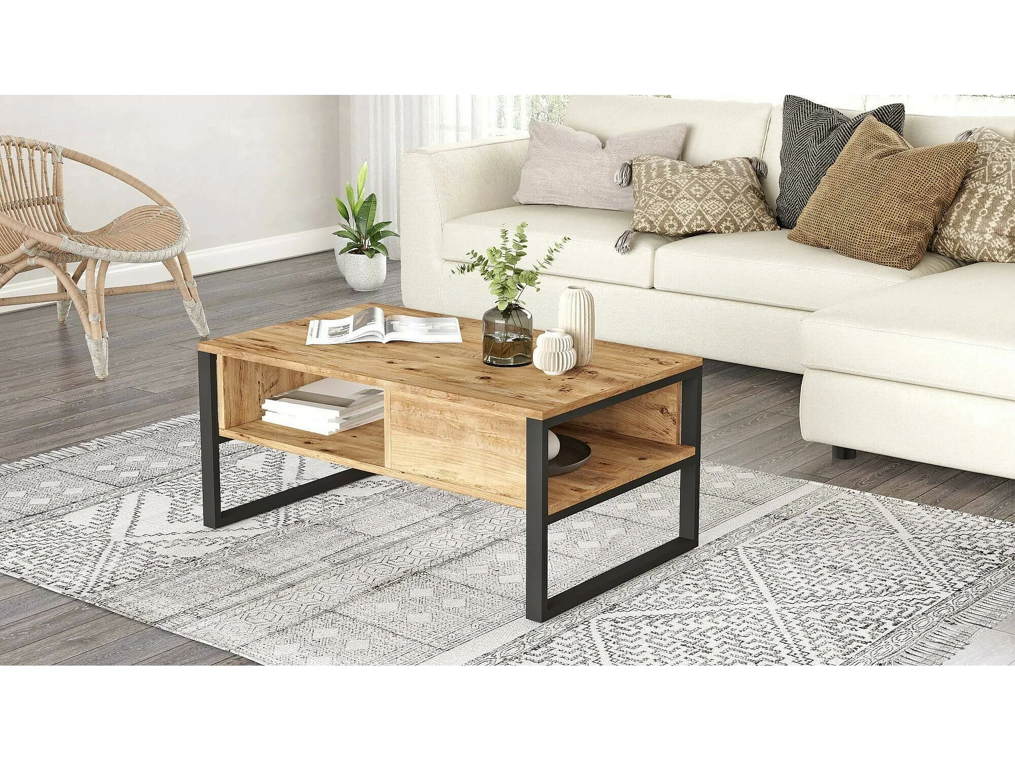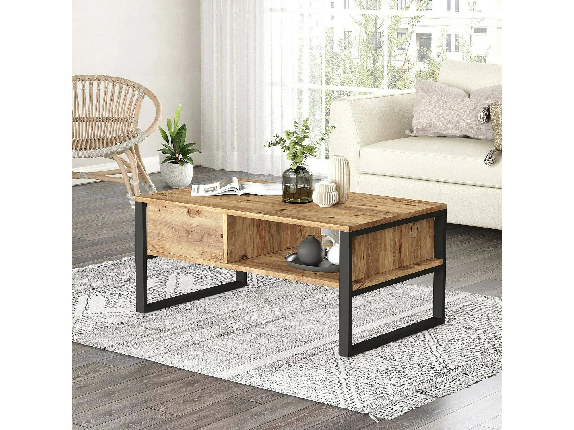 Table basse Astraia, Table basse, Porte-revues pour canapé, Etagère de salon, 100x60h44 cm, Chêne