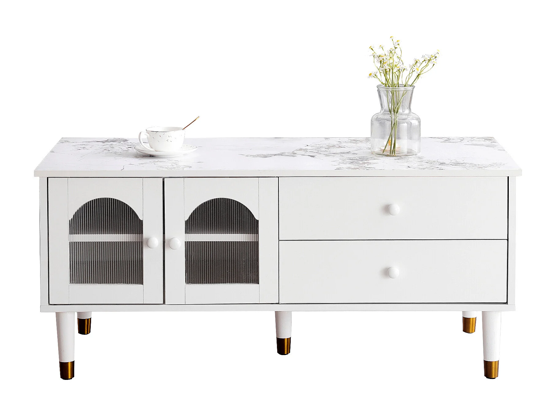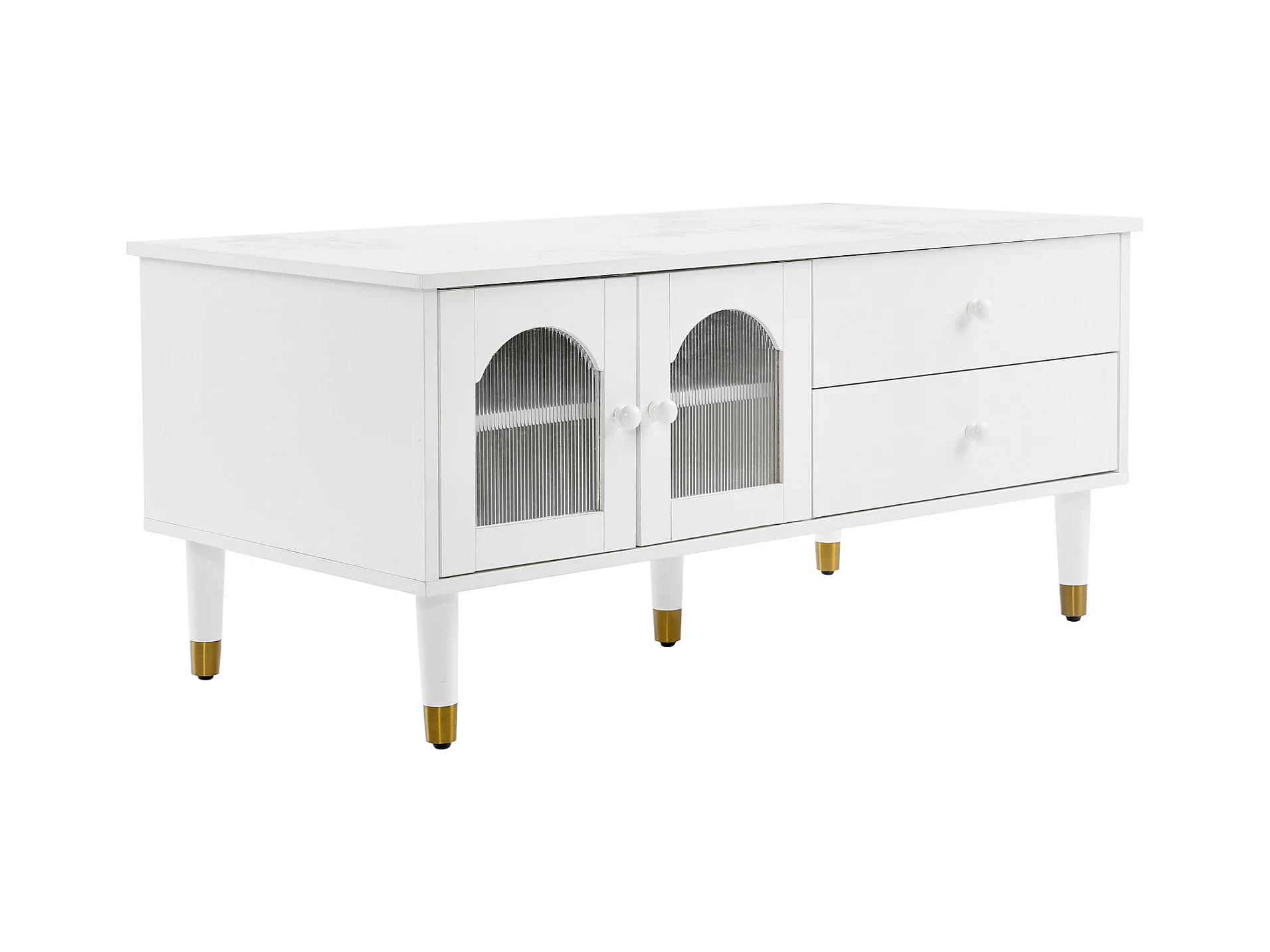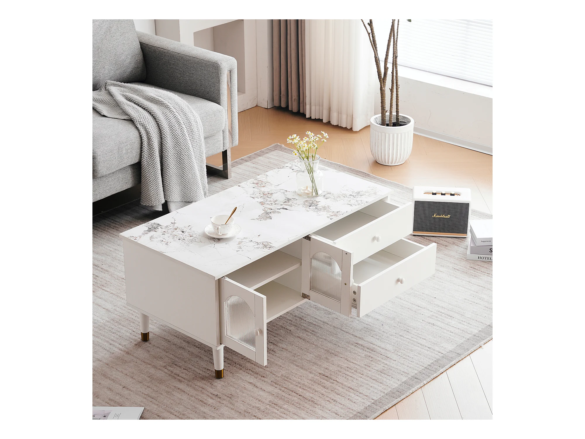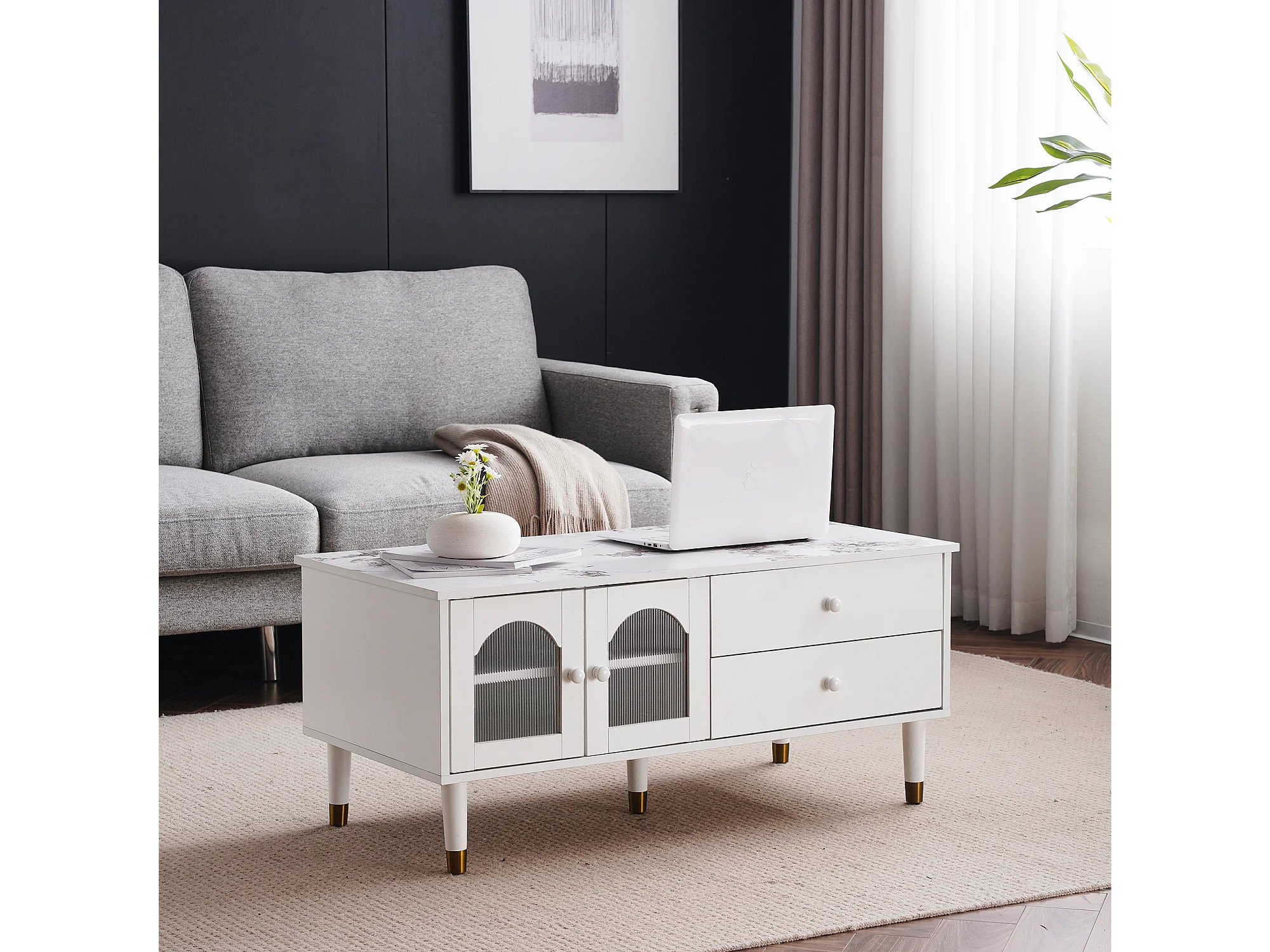 Table basse avec 2 portes 2 tiroirs, bois MDF, plateau marbré, style élégant, blanc, 100 x 50 x 45.5 cm