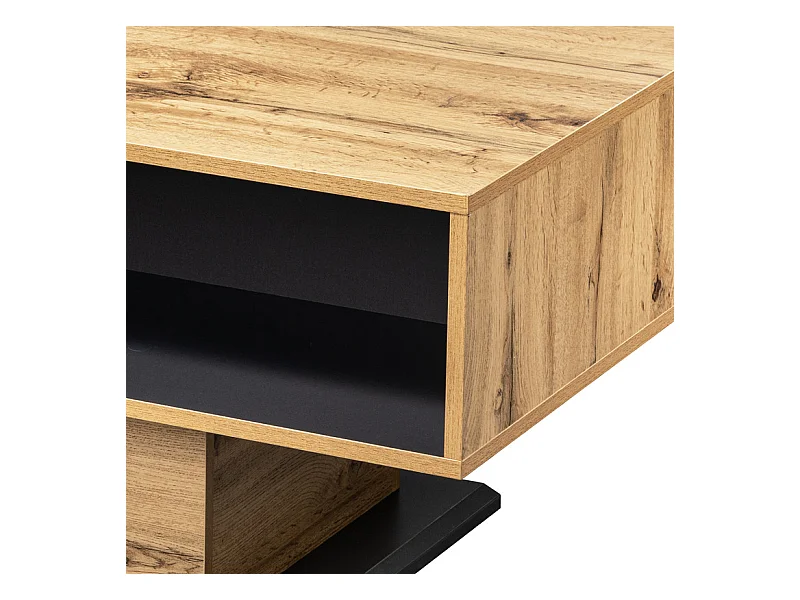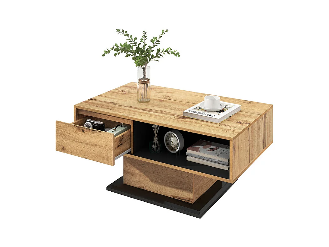 Table basse avec 2 tiroirs et compartiment de rangement central, LED inclus, corps en woodgrain naturel clair et blanc