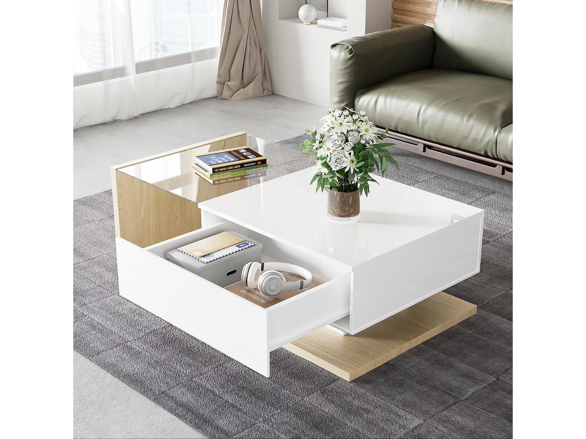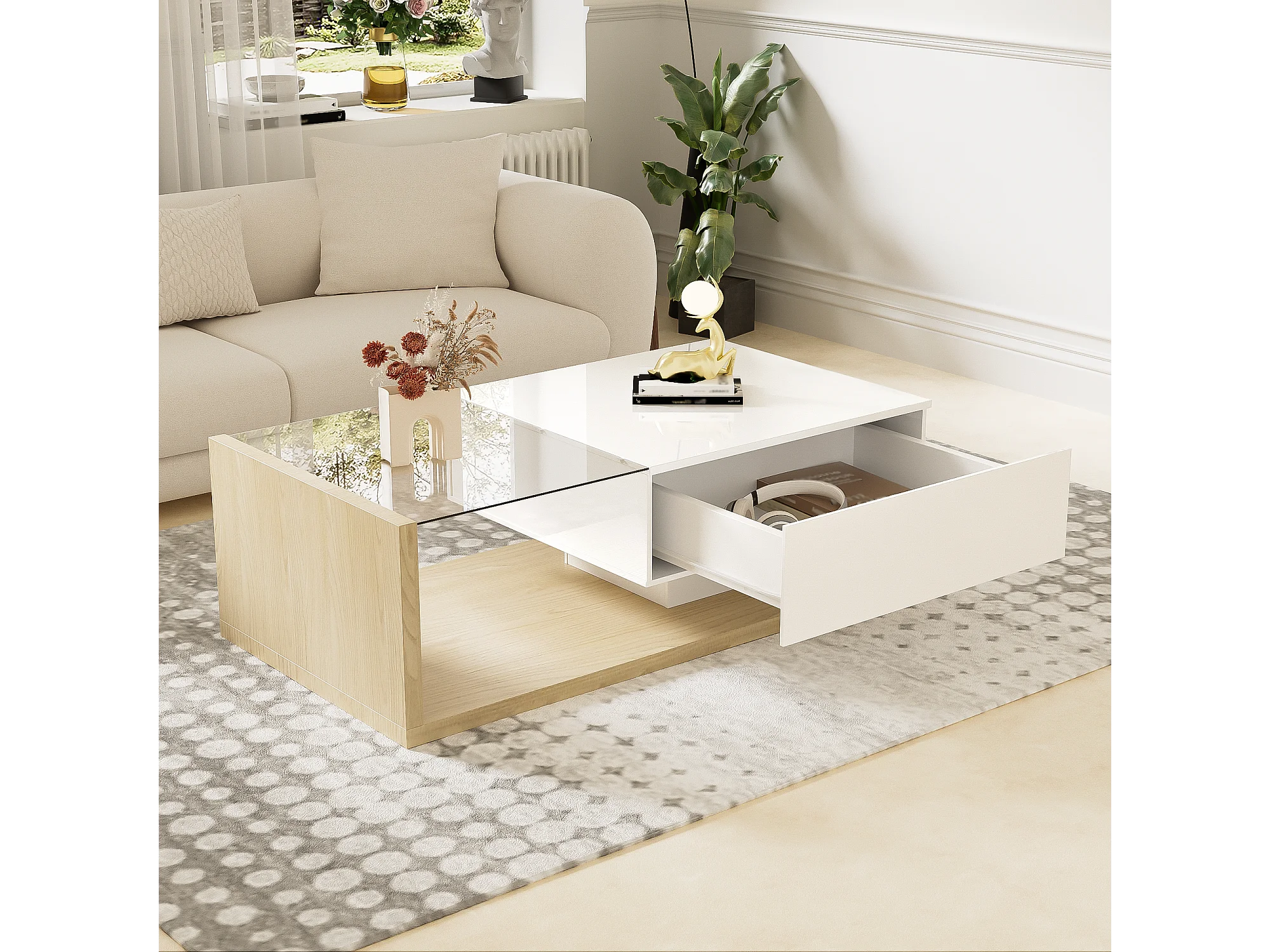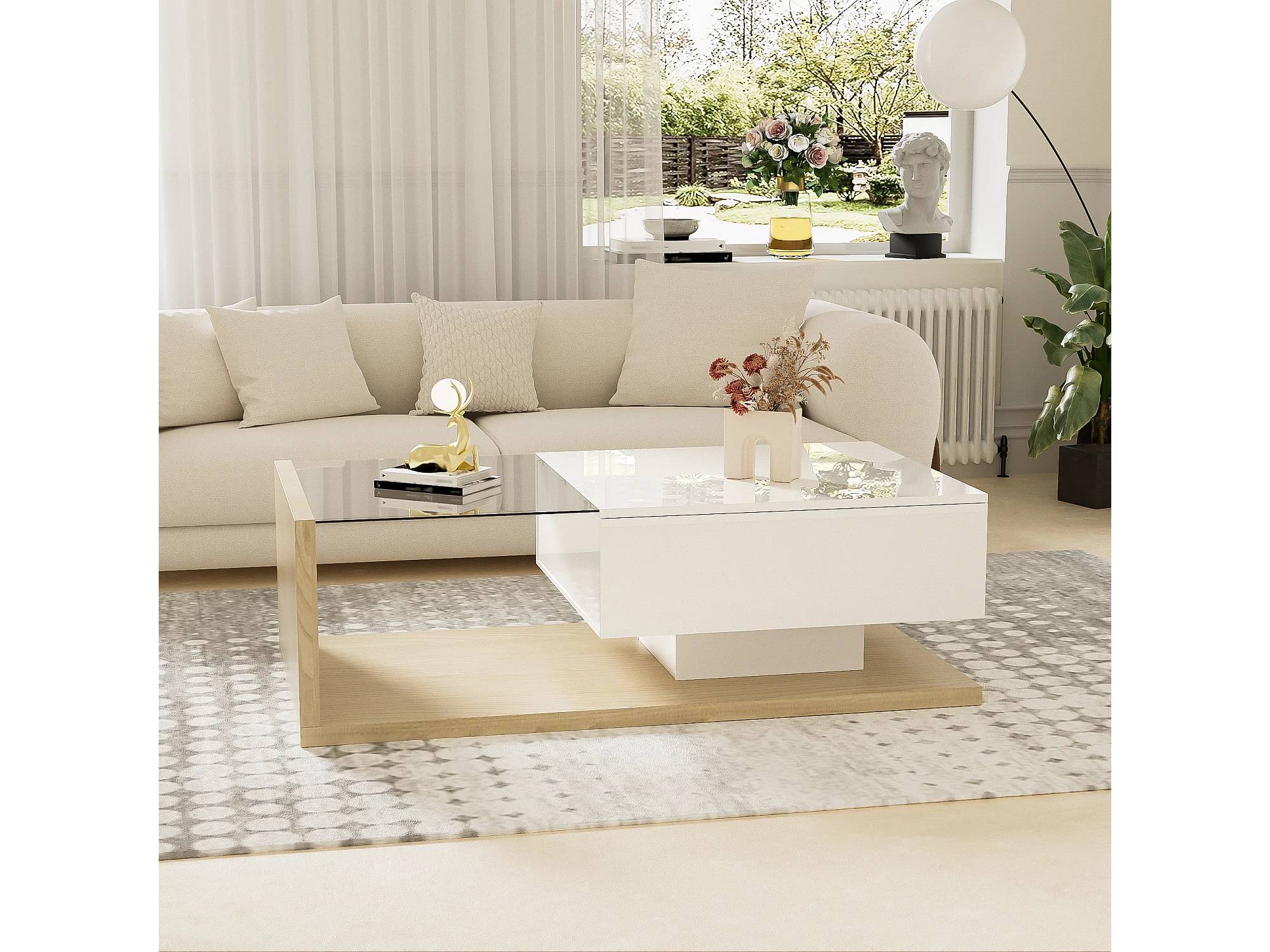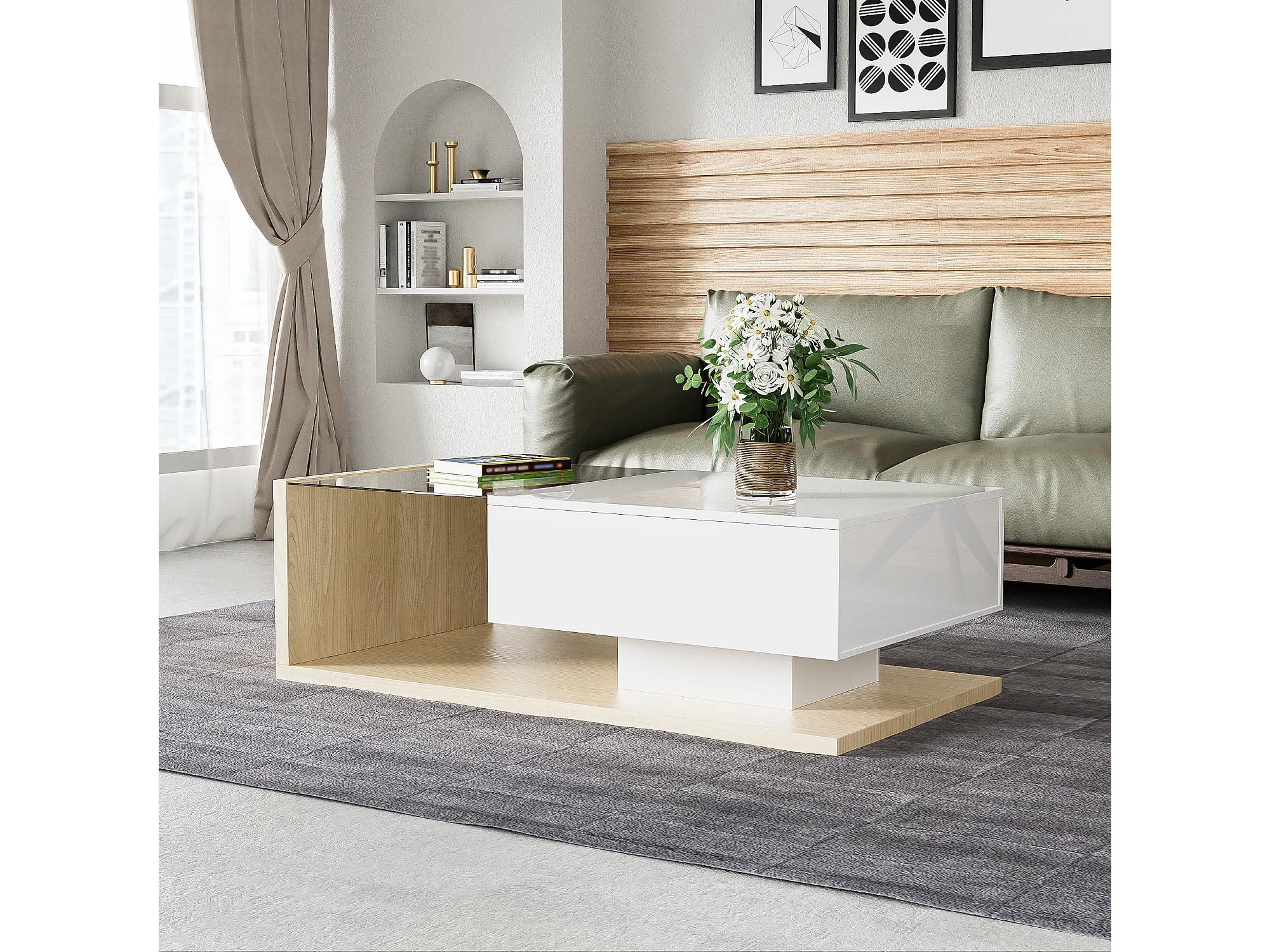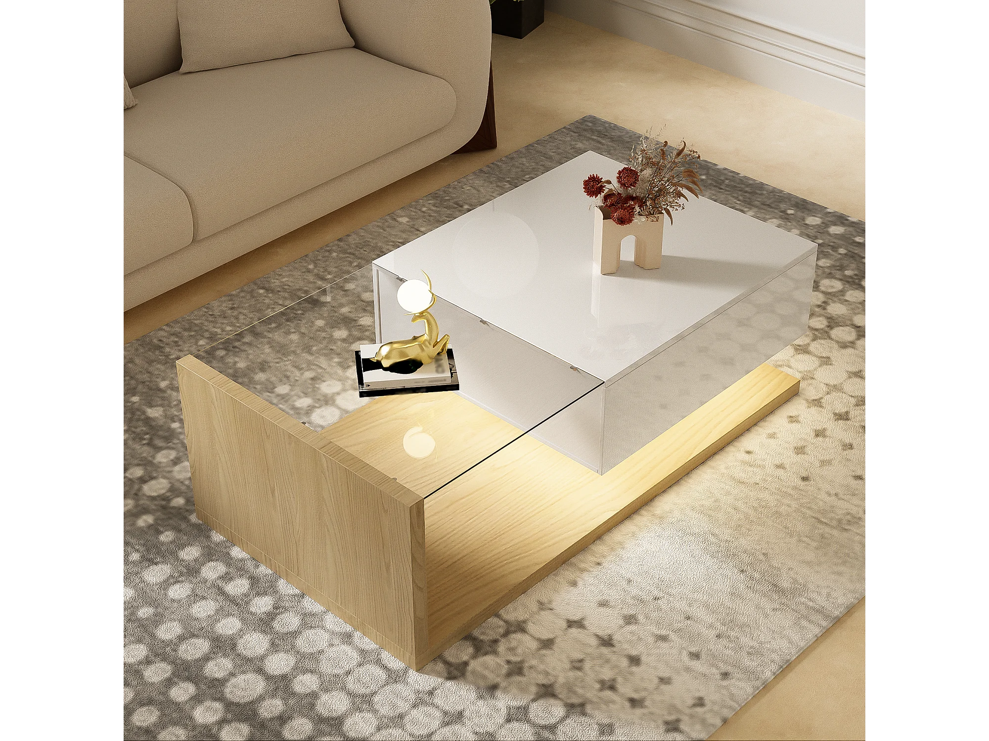 Table basse avec LED, surface en verre et bois, design moderne, MDF, blanc et bois naturel, (105x55x32.5 cm)