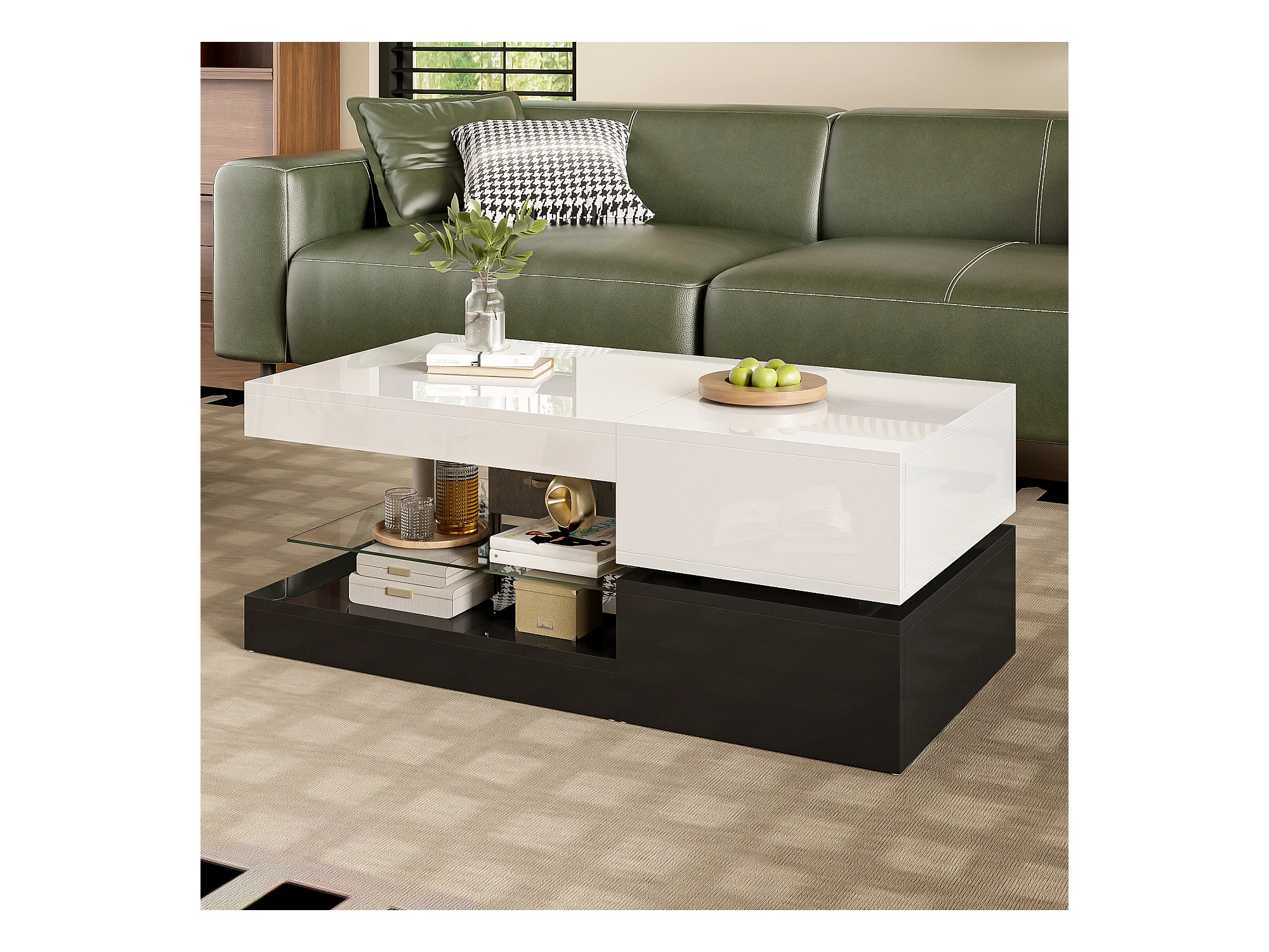 Table basse avec LED, télécommande Bluetooth, plateau en verre, design laqué noir et blanc (90x45x35.5 cm)