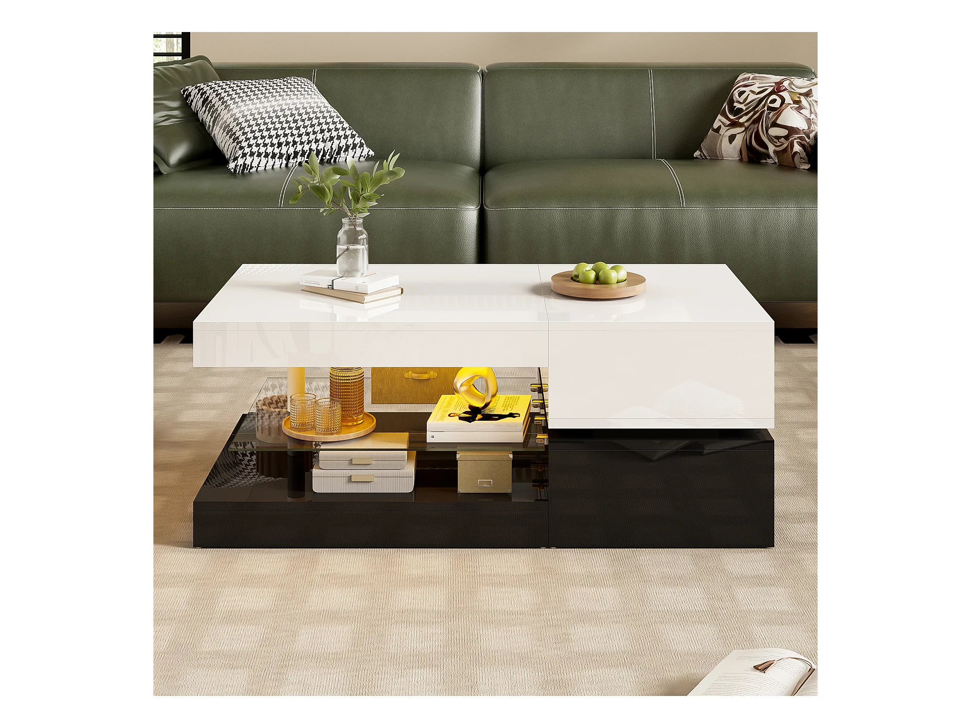 Table basse avec LED, hauteur réglable, stockage, laquée noire et blanche, verre (90x45x35.5 cm)