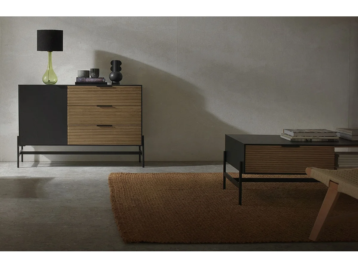 Table basse avec placage en frêne noir et pieds en métal noir