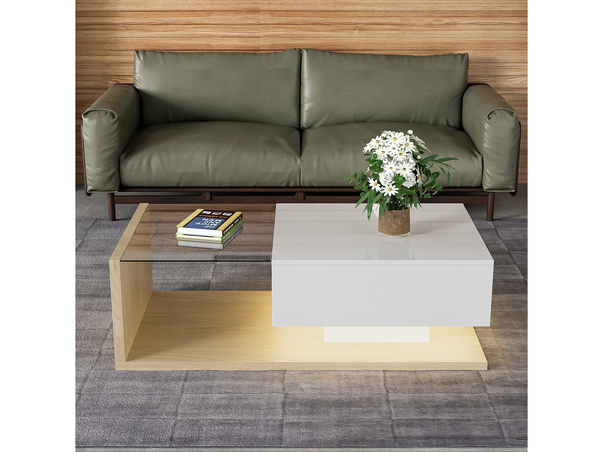 Table basse avec un tiroir et étagères - LEDs - 105x55x32,5cm - Panneaux de particules - Blanc brillant et bois