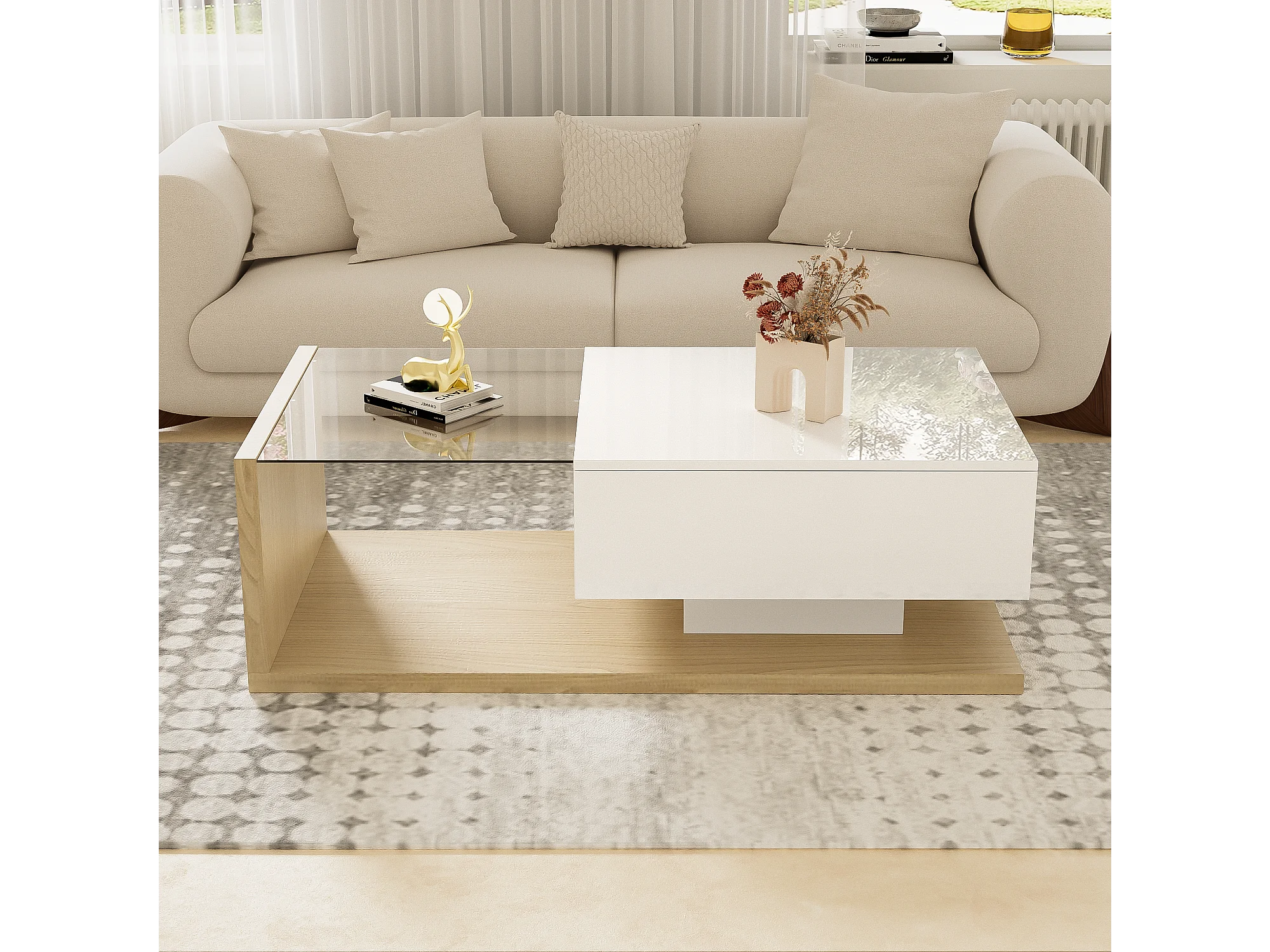 Table basse moderne 105 x 60 x 40 cm - partiellement brillante - avec tiroirs - compartiments ouverts - blanc + naturel