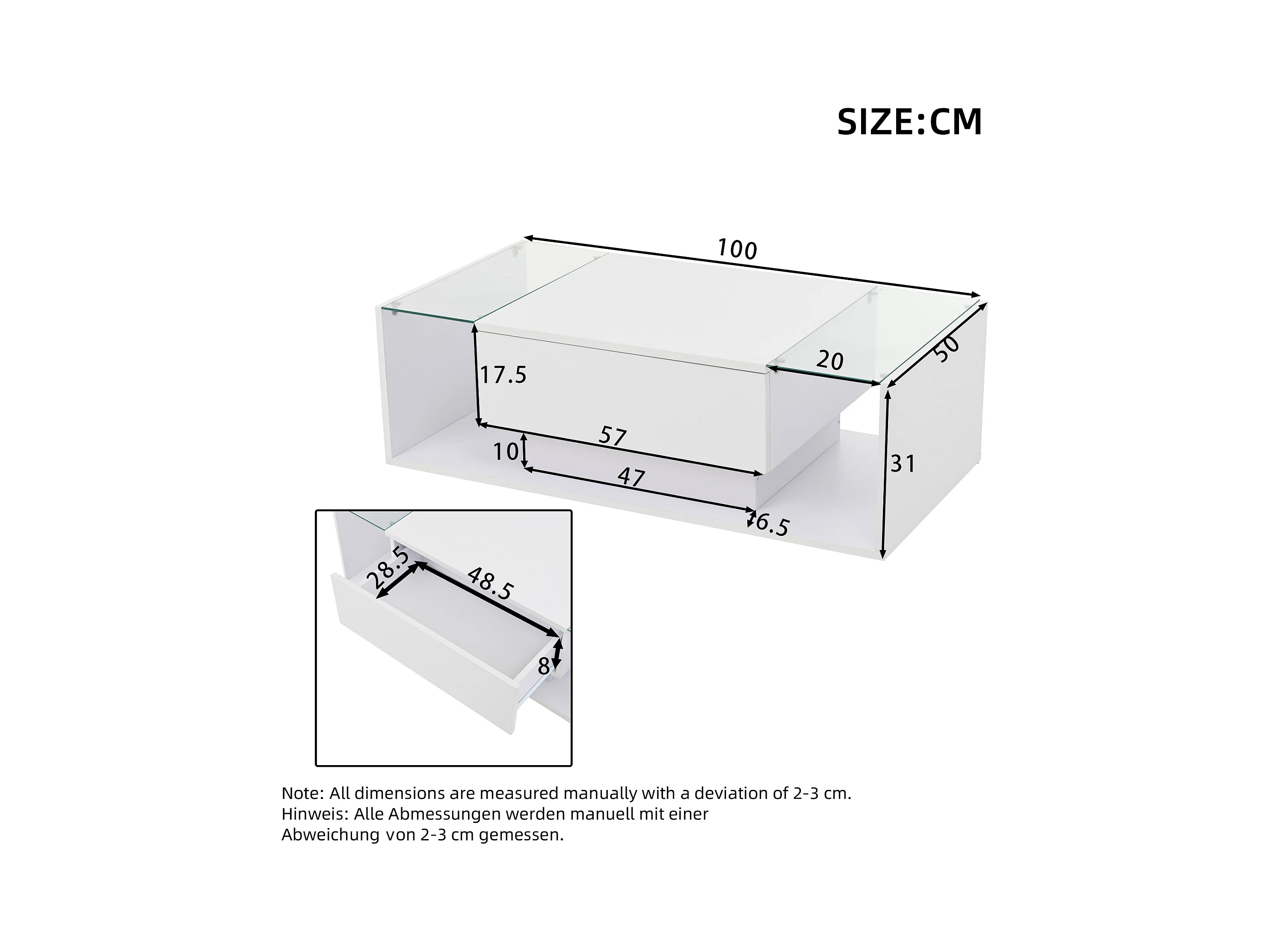 Table basse blanche - Table basse avec éclairage LED et 2 tiroirs - plateau en verre