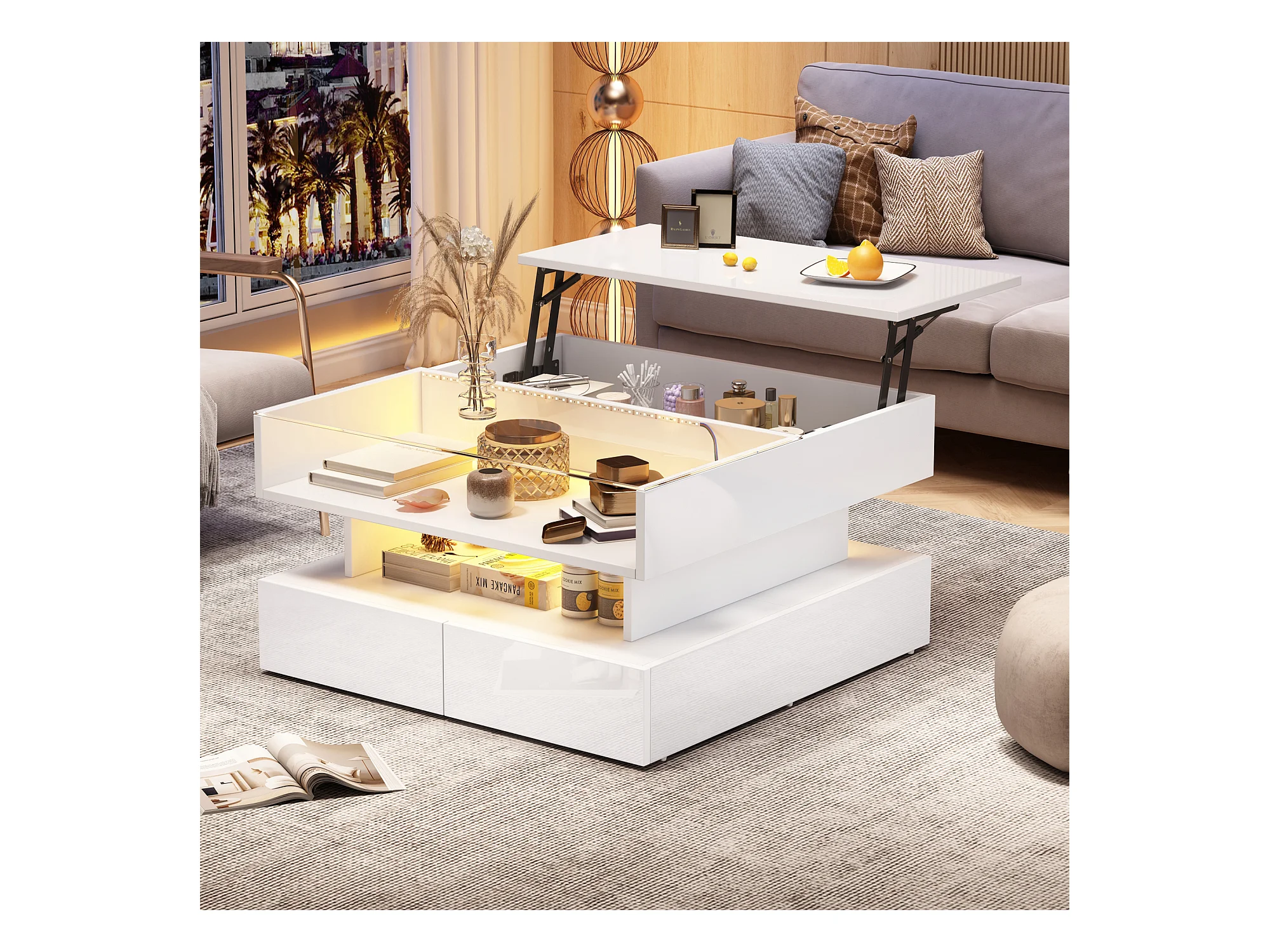 Table basse blanc avec éclairage LED - Table basse avec 2 tiroirs et plateau relevable - rangement ouvert