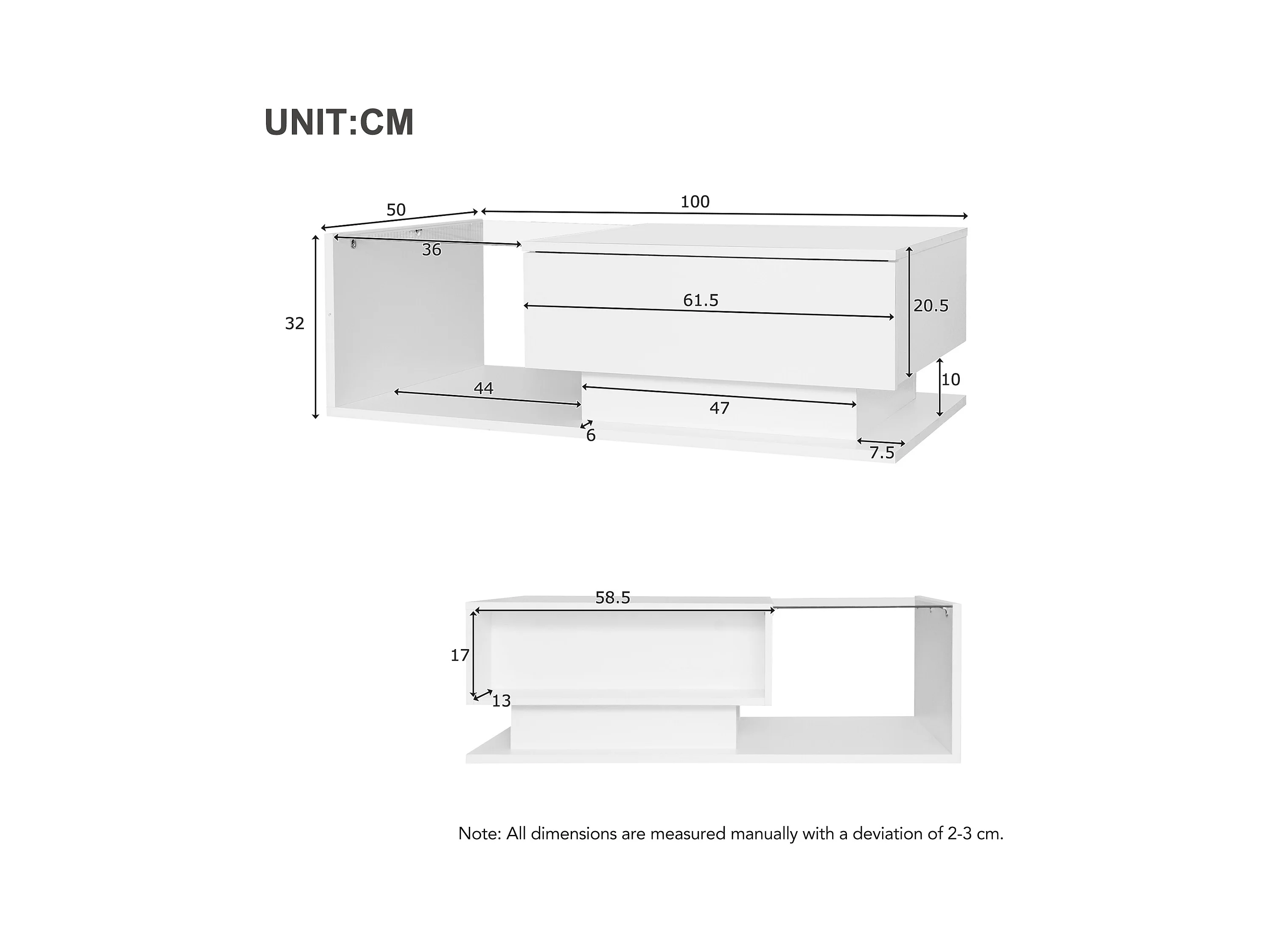Table basse blanche 100x50 cm avec LED, tiroir et plateau en verre -pour salon et bureaux