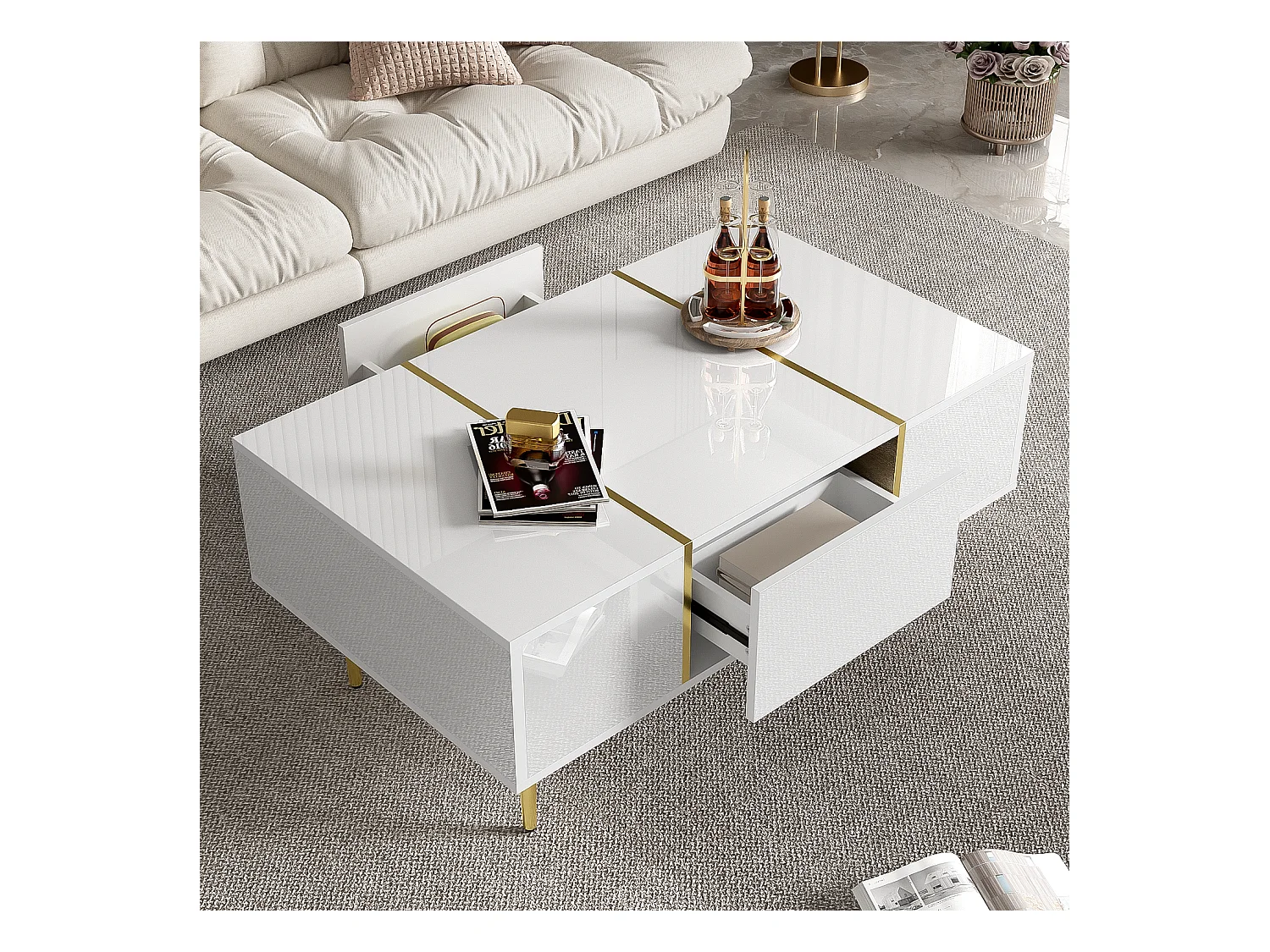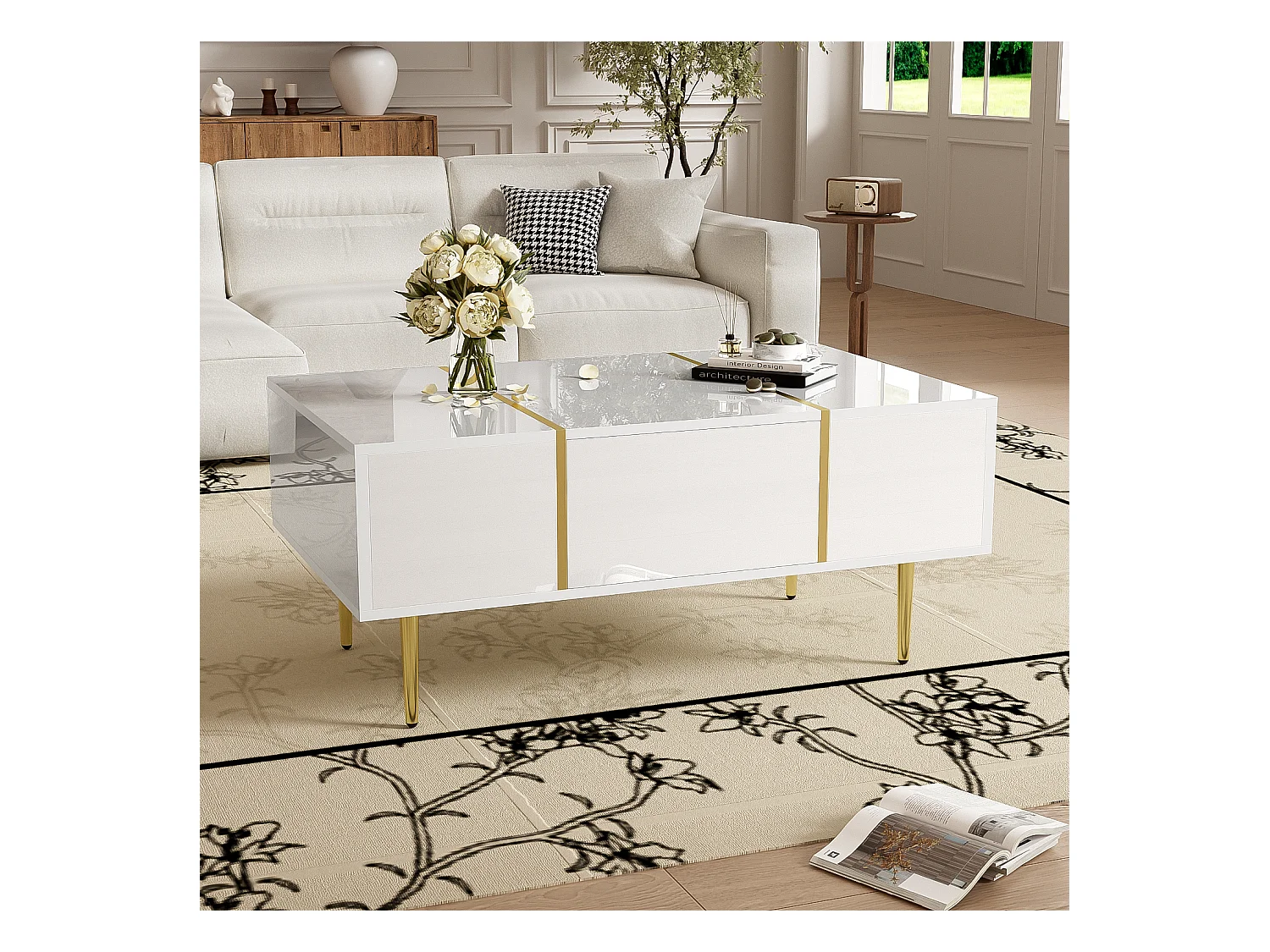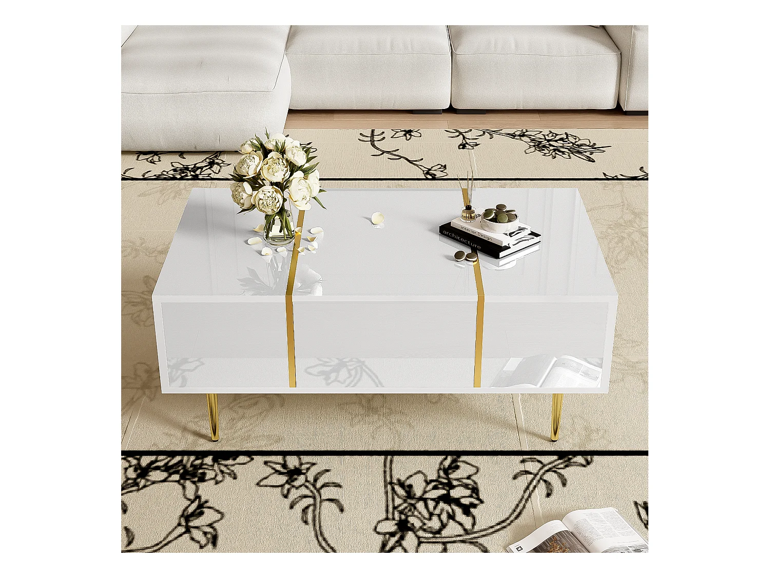 Table basse blanche brillante, design moderne avec 2 tiroirs, MDF laqué et métal doré (100x60x41.5 cm)