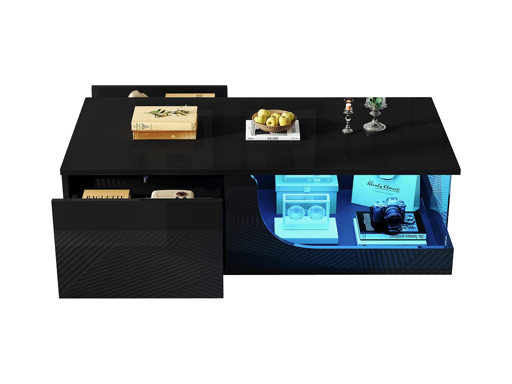 Table basse brillante - 100 x 50 x 40 cm - avec Leds + 2 portes + 1 tiroir - aggloméré - noir