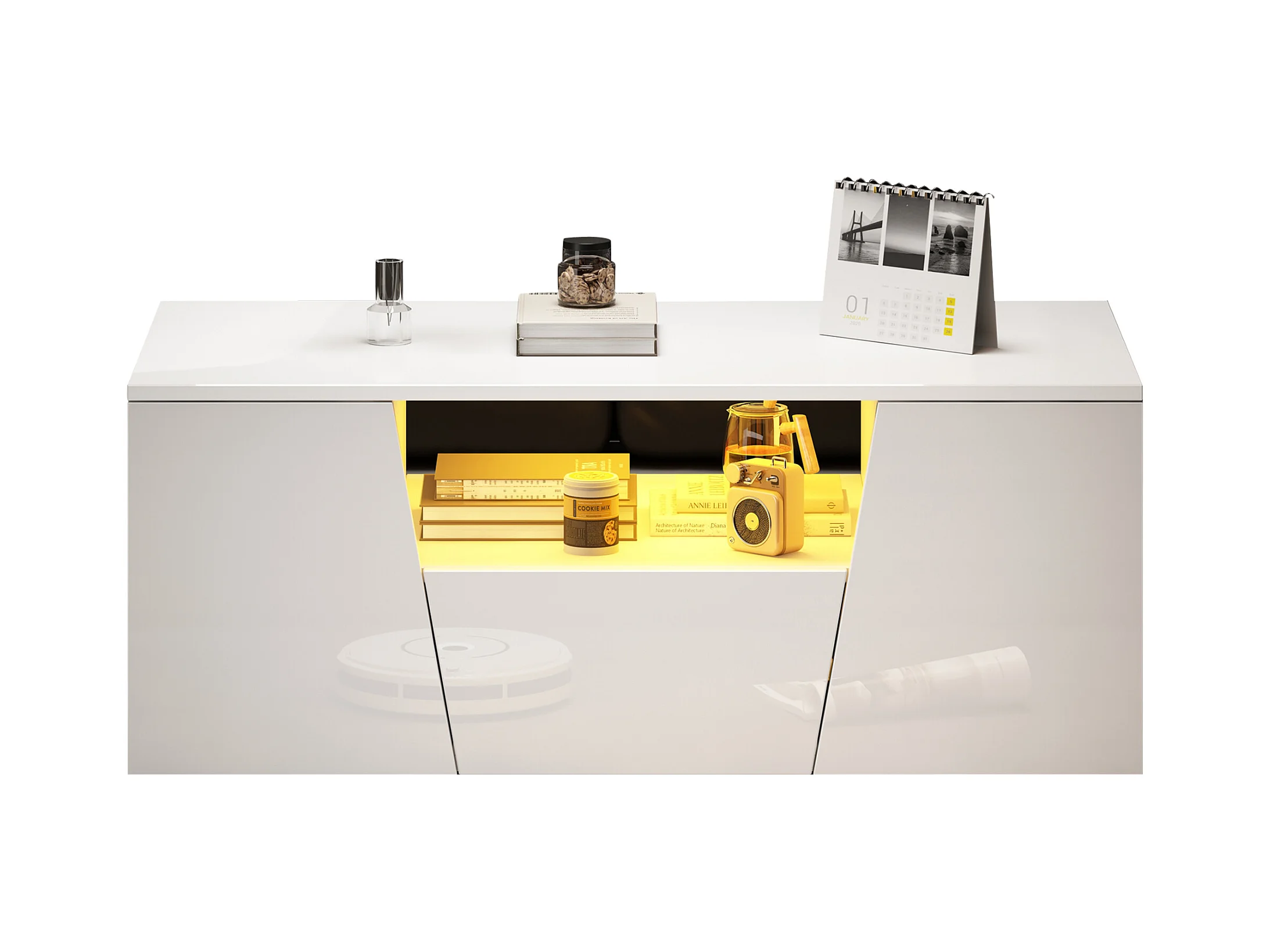 Table basse brillante - 100 x 50 x 40 cm - avec Leds + 2 portes + 1 tiroir - aggloméré - blanc