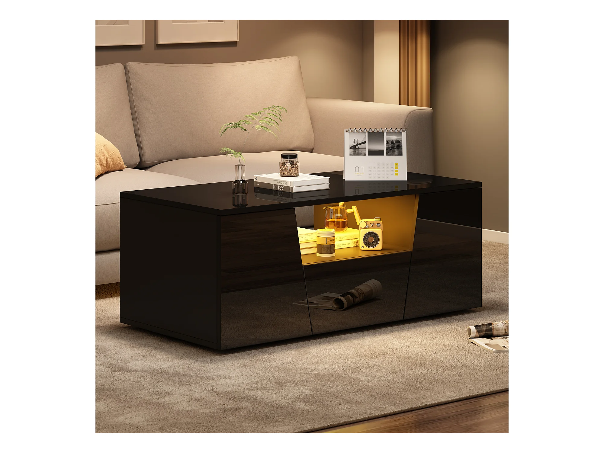 Table basse brillante - 100 x 50 x 40 cm - avec Leds + 2 portes + 1 tiroir - aggloméré - noir