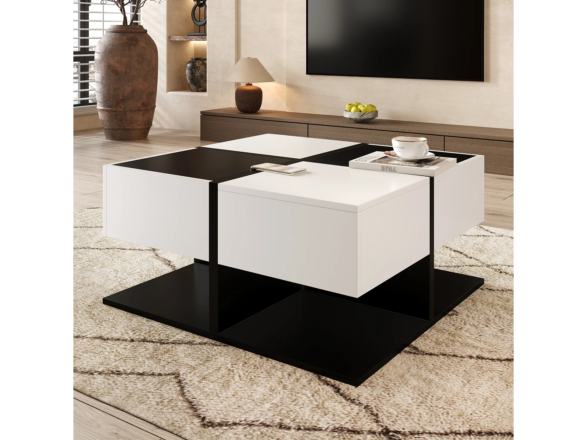 Table basse brillante - 70 x 70 x 35.5 cm - avec 2 tiroirs - aggloméré - blanc + noir