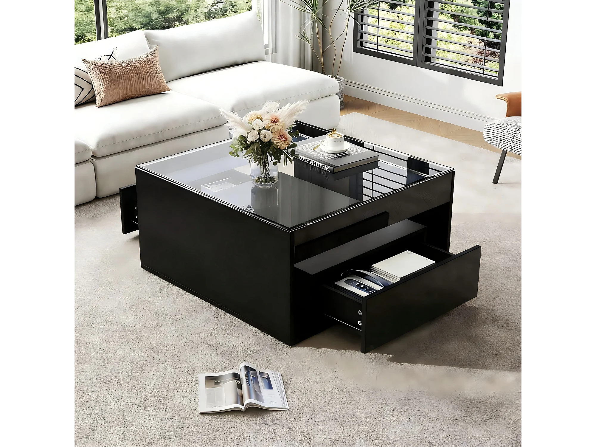 Table basse carrée brillante 70x70x40 cm - avec éclairage LED - 4 tiroirs - Noir