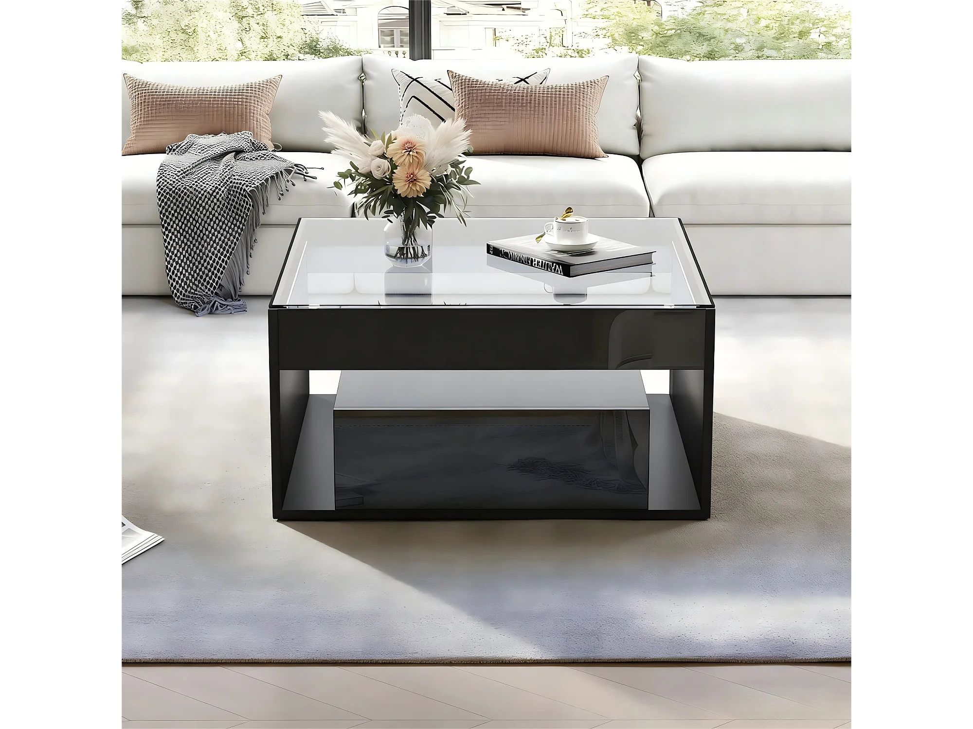 Table basse brillante 70x70x35 cm - Avec éclairage LED - 1 tiroir - Étagère ouverte - Plateau en verre trempé - MDF - Noir