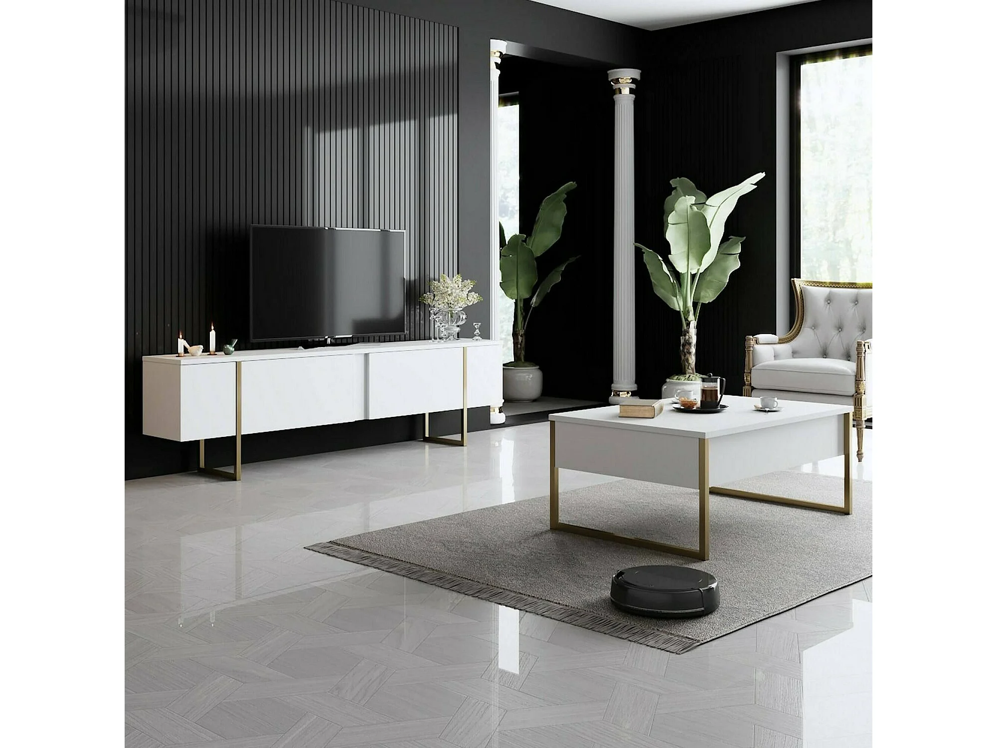Table basse Canis, Table basse, Porte-revues pour canapé, Etagère de salon, 90x60h40 cm, Blanc et Or