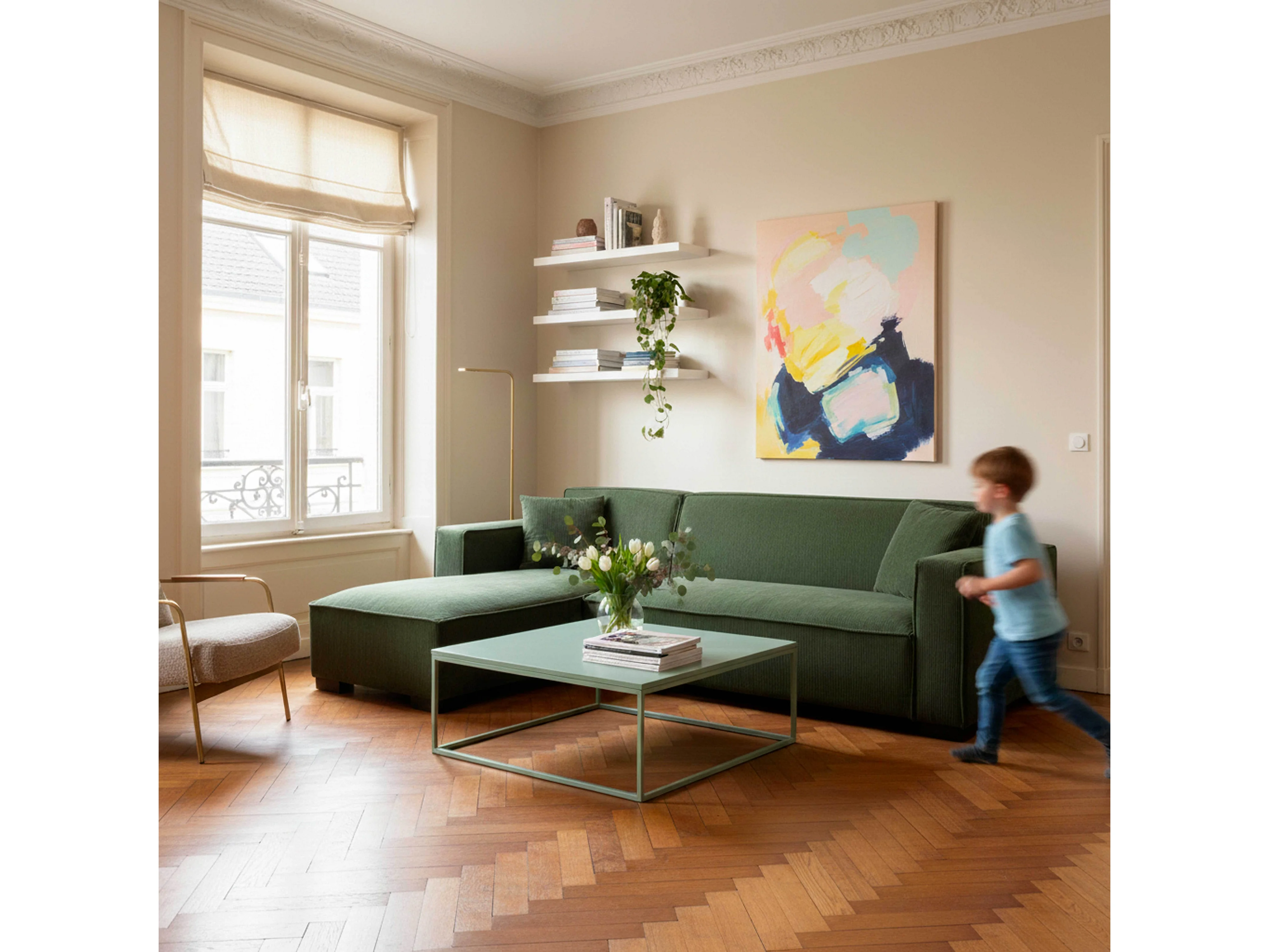 Table basse carrée moderne L90 cm vert sauge