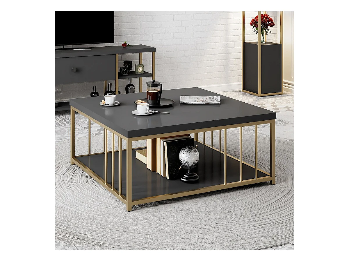 Table basse carrée Olliana 90x90cm Bois Anthracite et Métal Or
