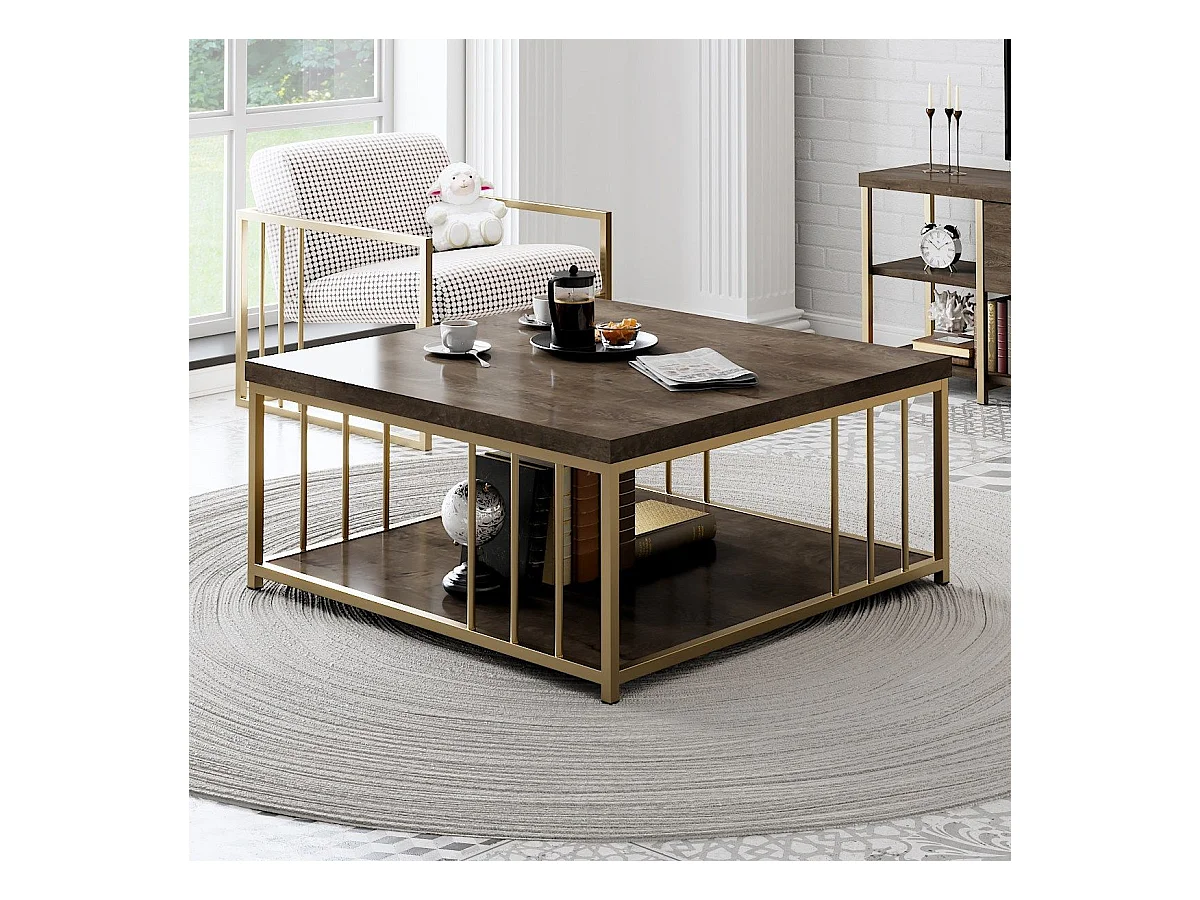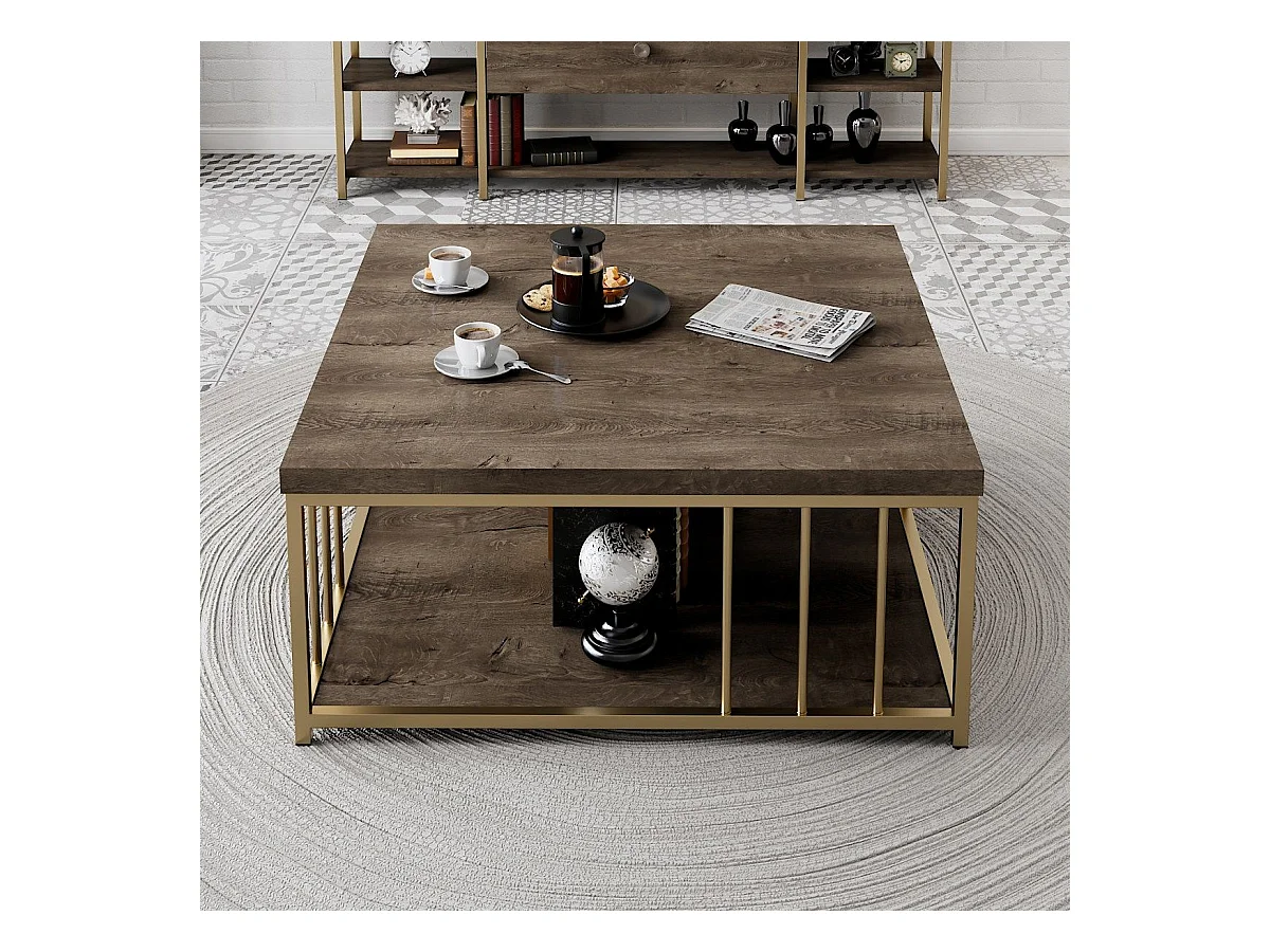 Table basse carrée Olliana 90x90cm Bois foncé et Métal Or