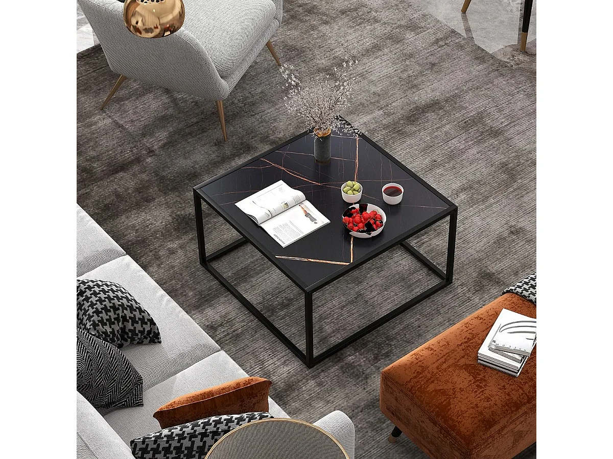 Table basse carrée, table basse salon faux marbre, cadre métal, 70 x 70 x 40cm