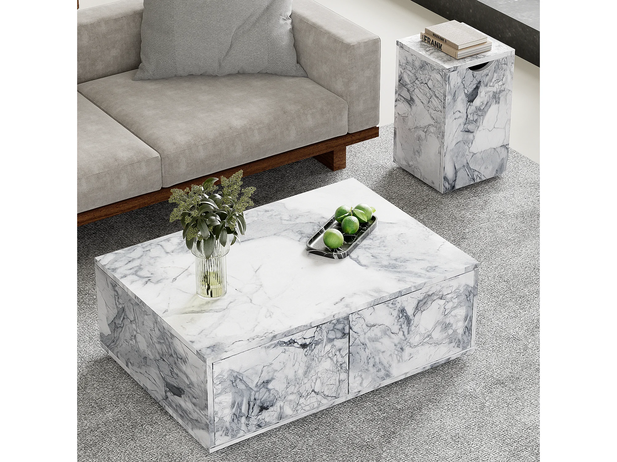 Table basse combiné, lot de 2 tables basses - 100x33,5x70cm+32x32x50cm - Effet marbre - Bois MDF - Blanc