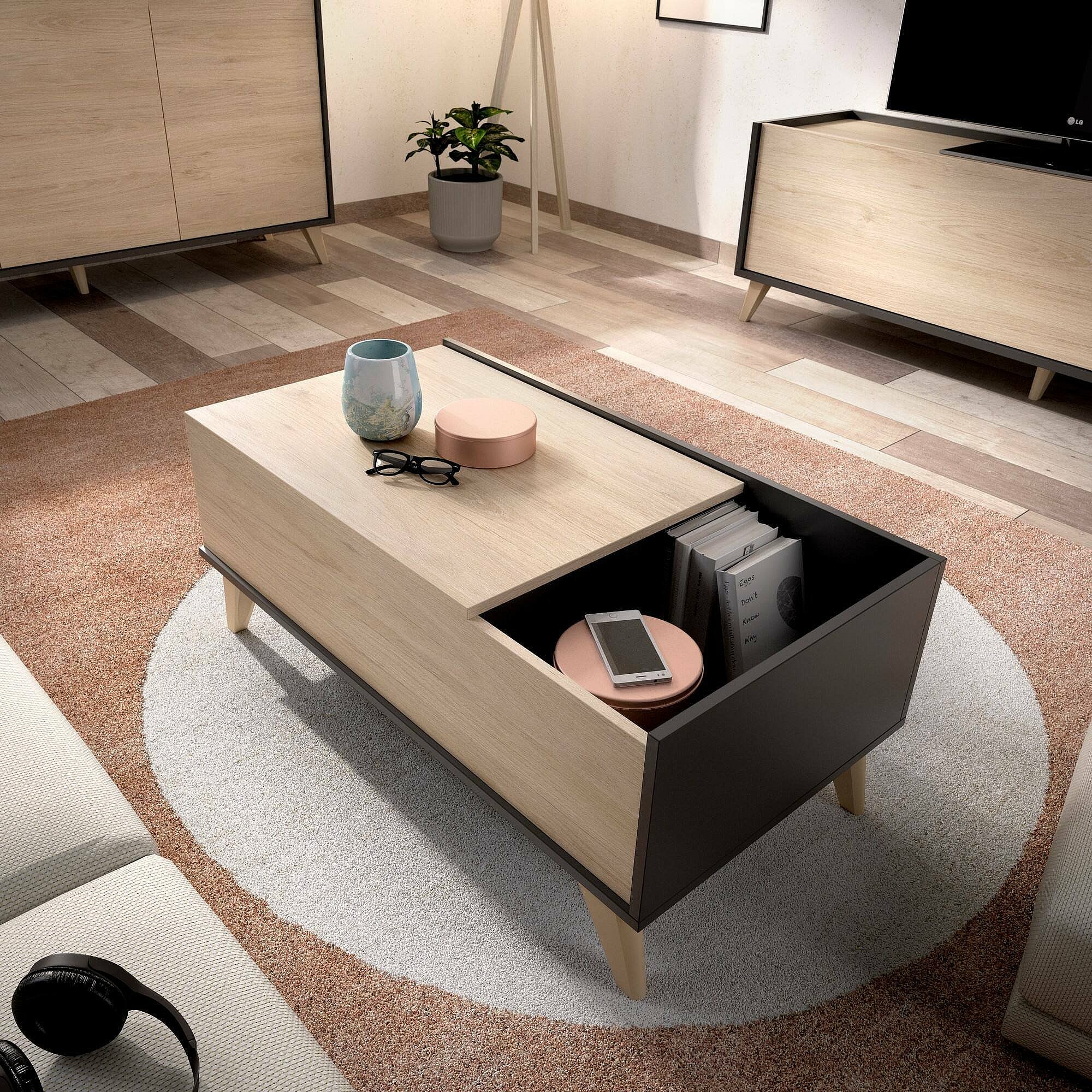 Table basse Dburs, Porte-revues de salon avec compartiment de rangement, Table basse élévatrice, 99x60h41 cm, Anthracite et Chêne