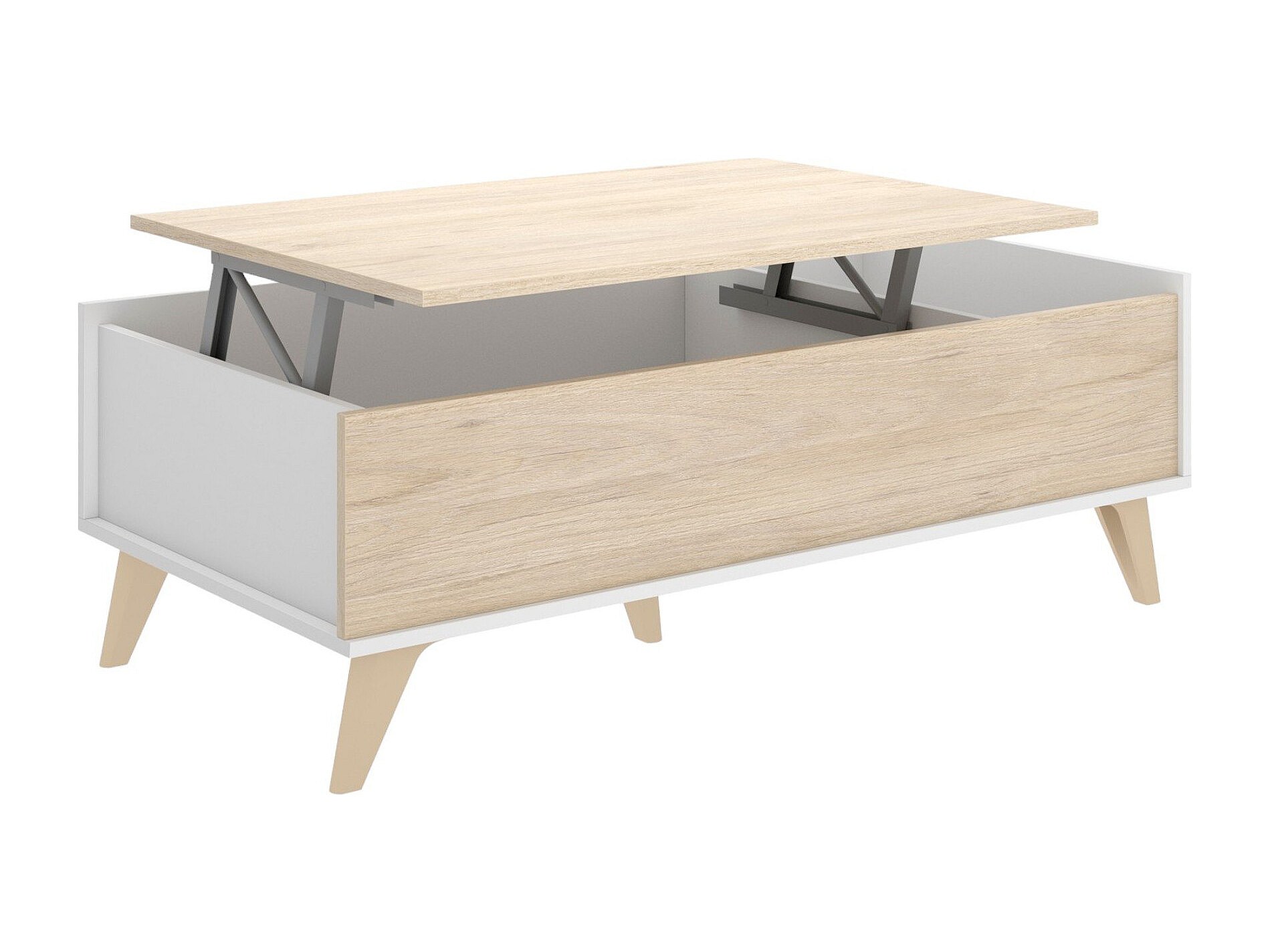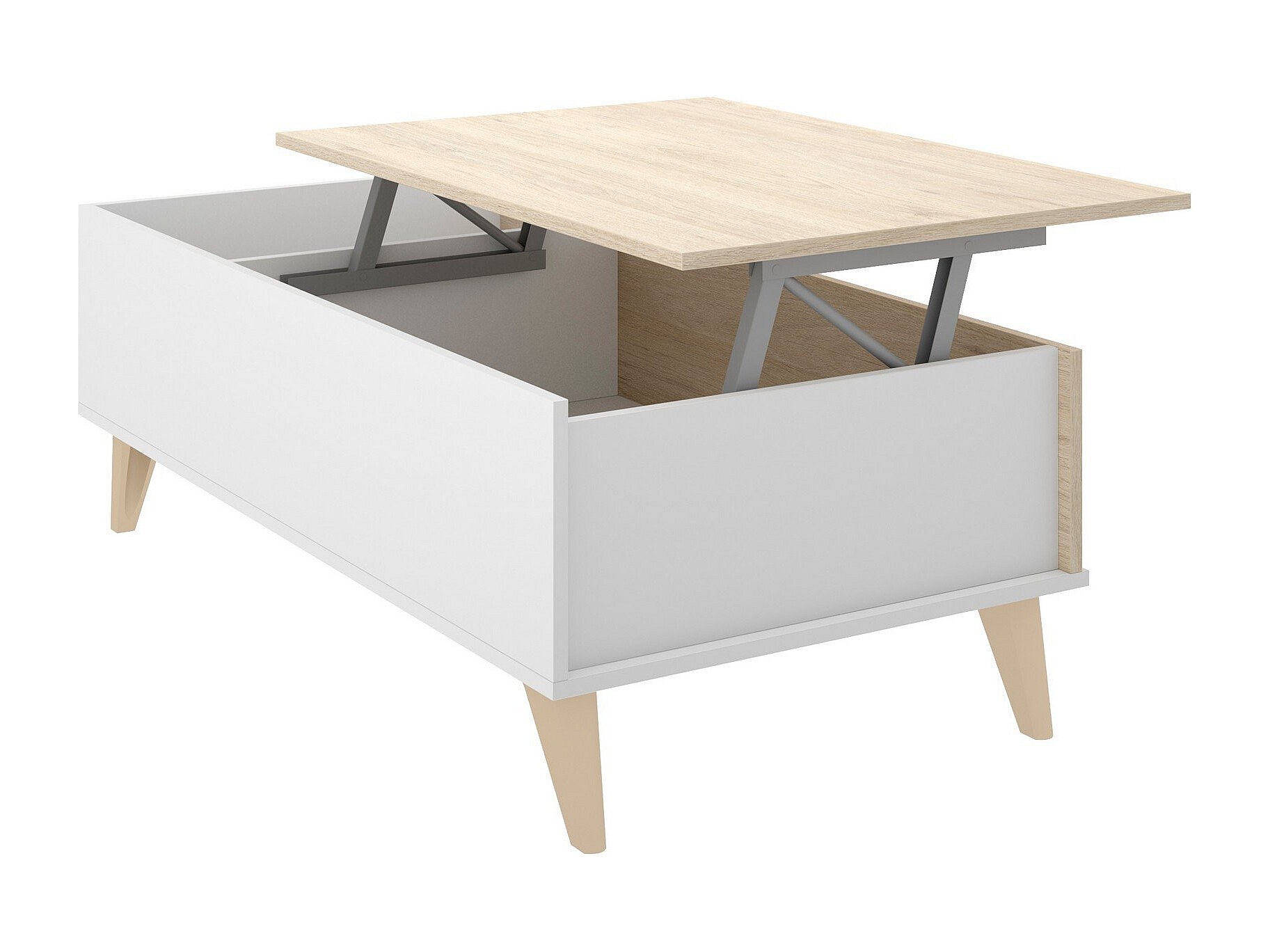 Table basse Dburs, Porte-revues de salon avec compartiment de rangement, Table basse élévatrice basse, 99x60h41 cm, Chêne et Blanc