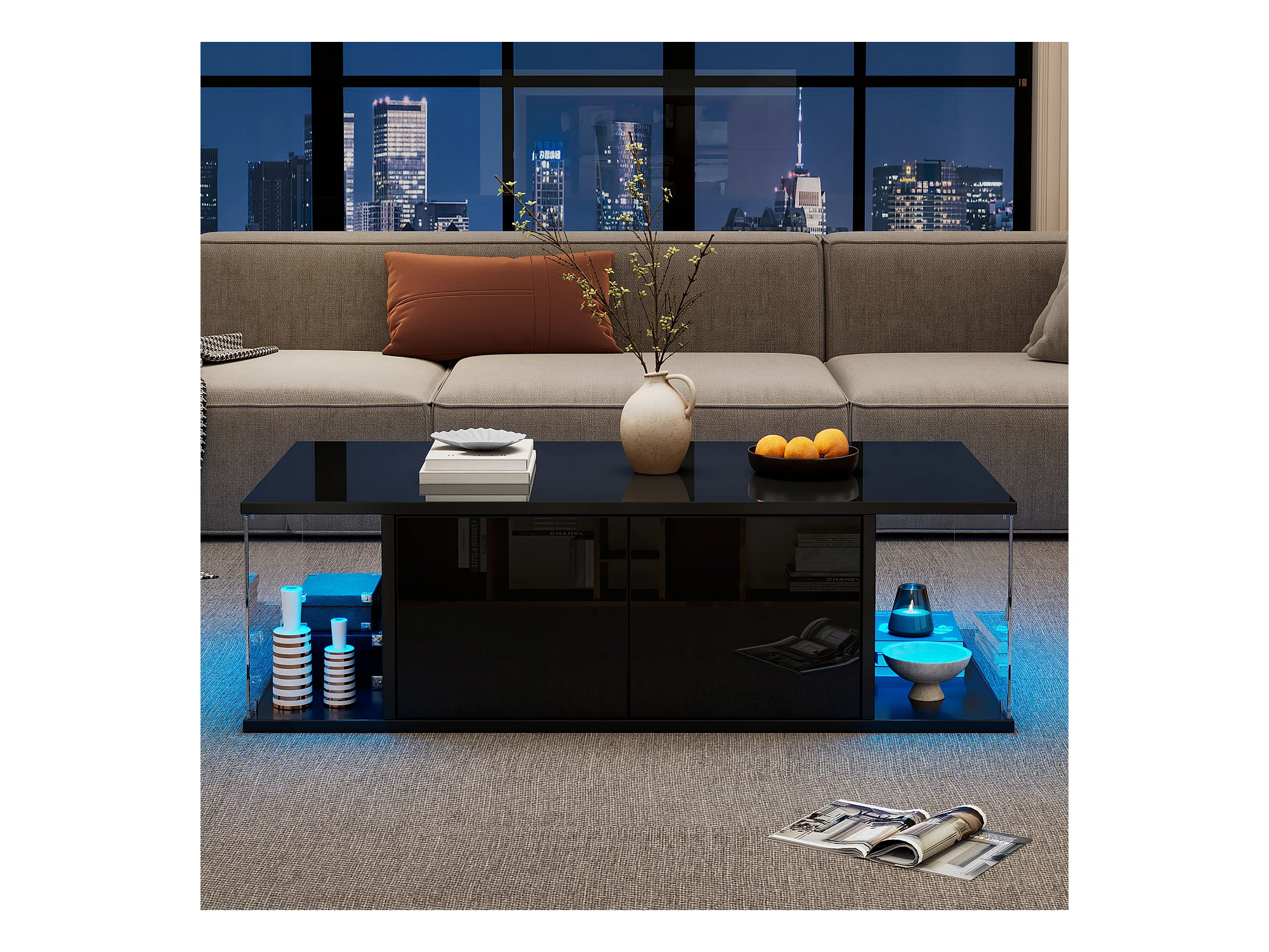 Table basse brillante - 100 x 50 x 43 cm - avec Leds + 2 portes + port de charge et prise - aggloméré - noir